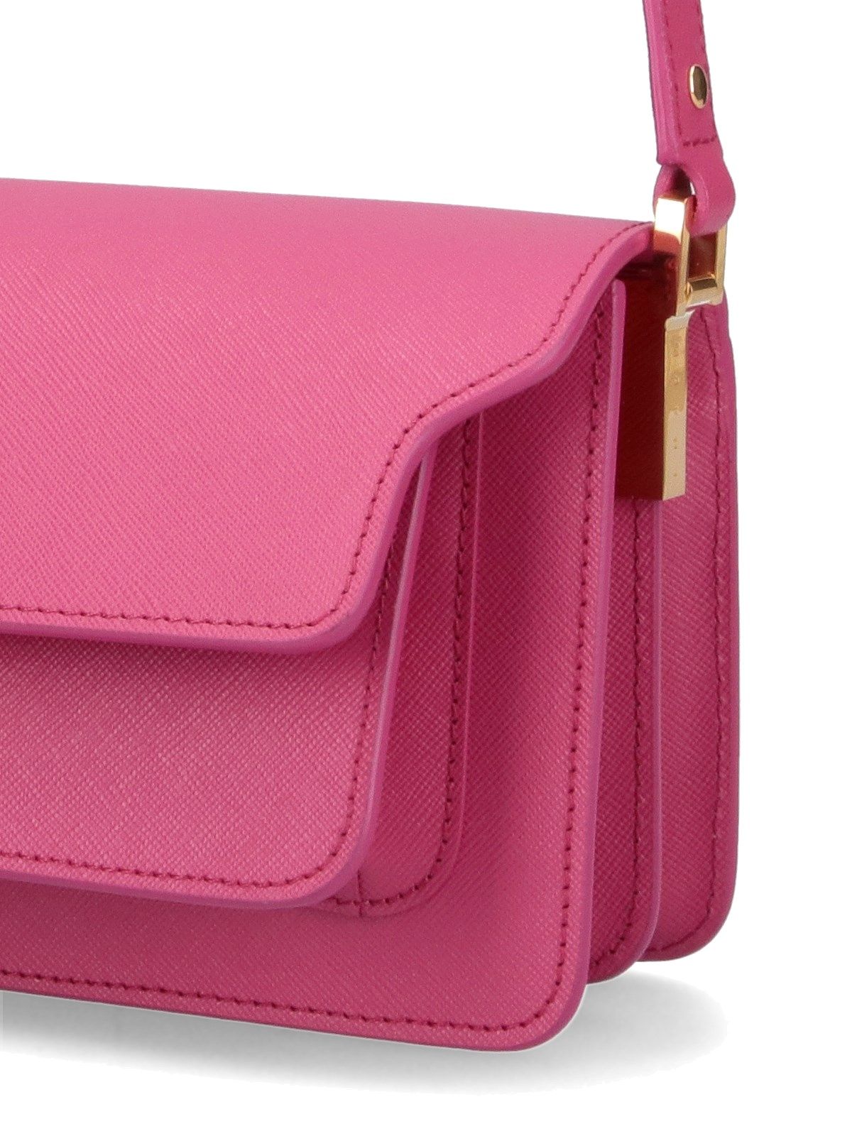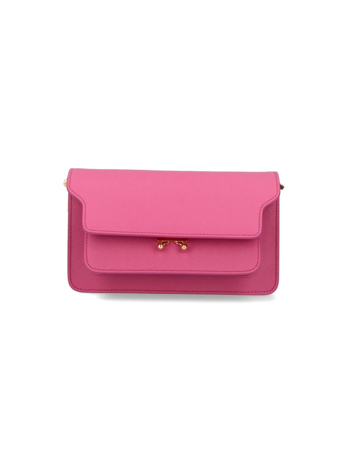 Marni „Trunk“ Umhängetasche aus rosafarbenem Leder, verstellbarer Schultergurt mit Knöpfen, goldener Metallhakenverschluss, zwei Innenfächer, eine Innentasche mit Reißverschluss.