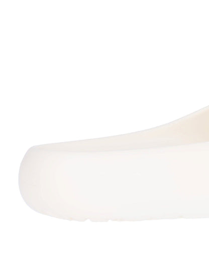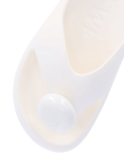 Loewe „Toe Post“ Zehenstegsandalen aus cremefarbenem Schaumgummi, offene runde Zehenpartie, Slip-on-Passform, schwarze Logo-Hardware vorne, breites Oberband, Gummisohle.