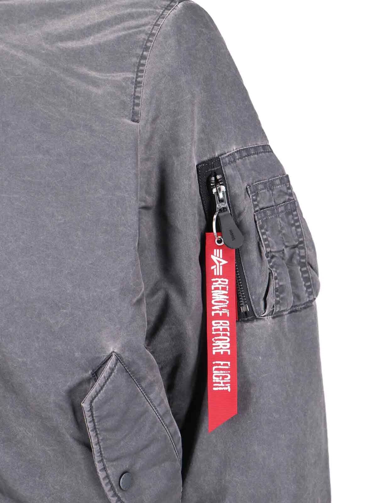 Giacca bomber "MA-1" Alpha Industries, in nylon grigio, effetto usured, girocollo, chiusura zip, due tasche a soffietto laterali, una tasca applicata con zip su manica, dettaglio tiralampo etichetta rossa, una tasca intrna, finiture a costine, polsini e orlo elastico.