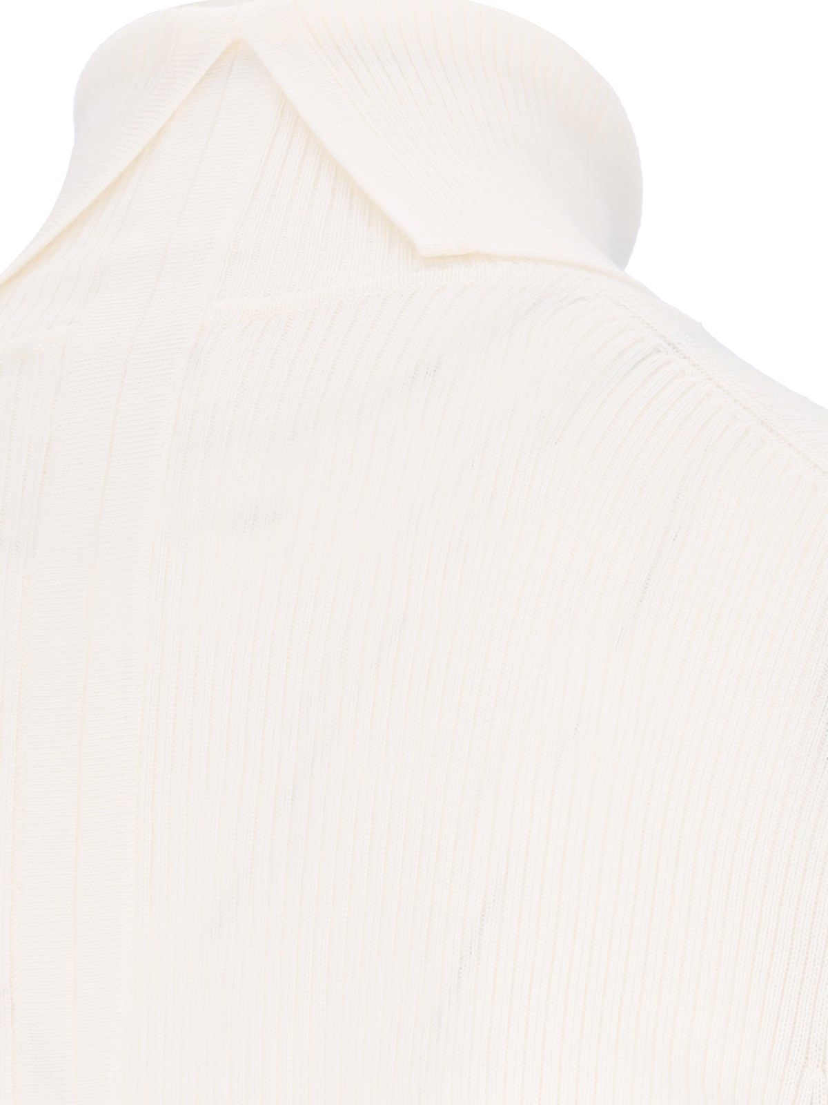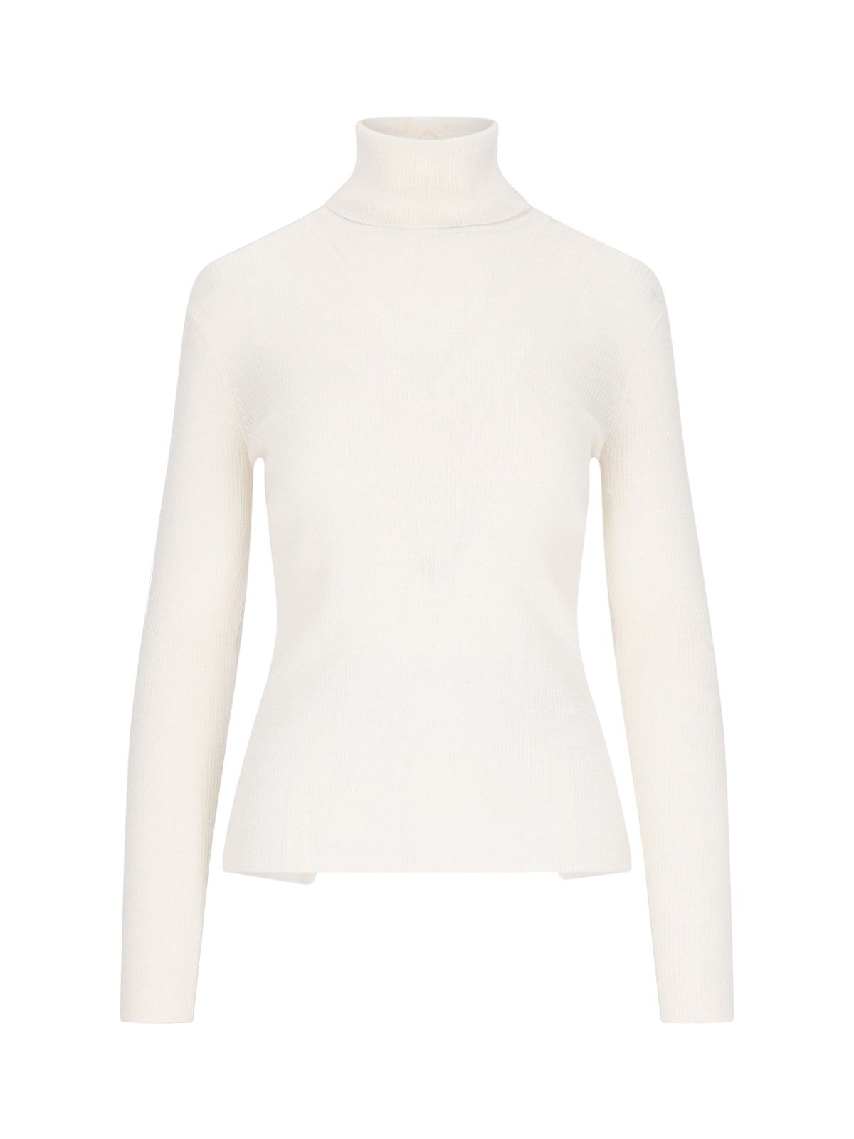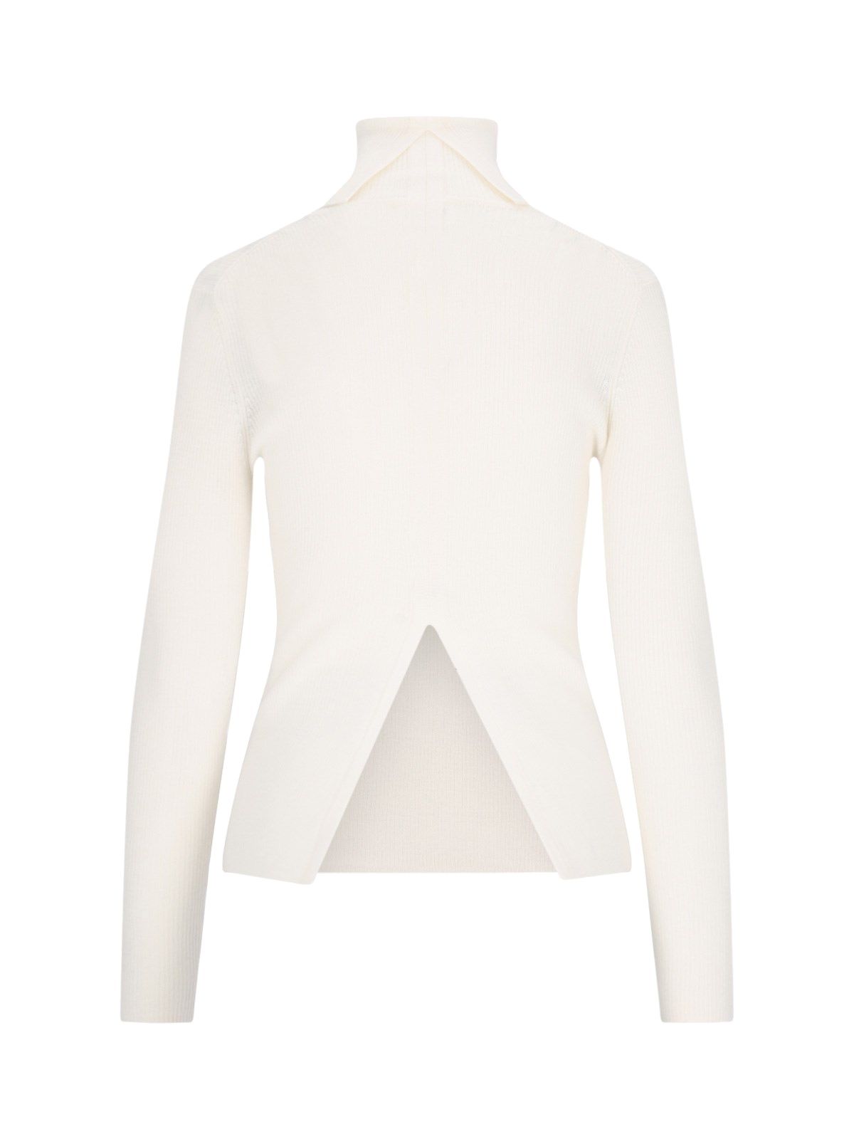 Dolcevita classico P.A.R.O.S.H., in lana bianca, lavorazione a coste, spacco centrale retro, orlo dritto.