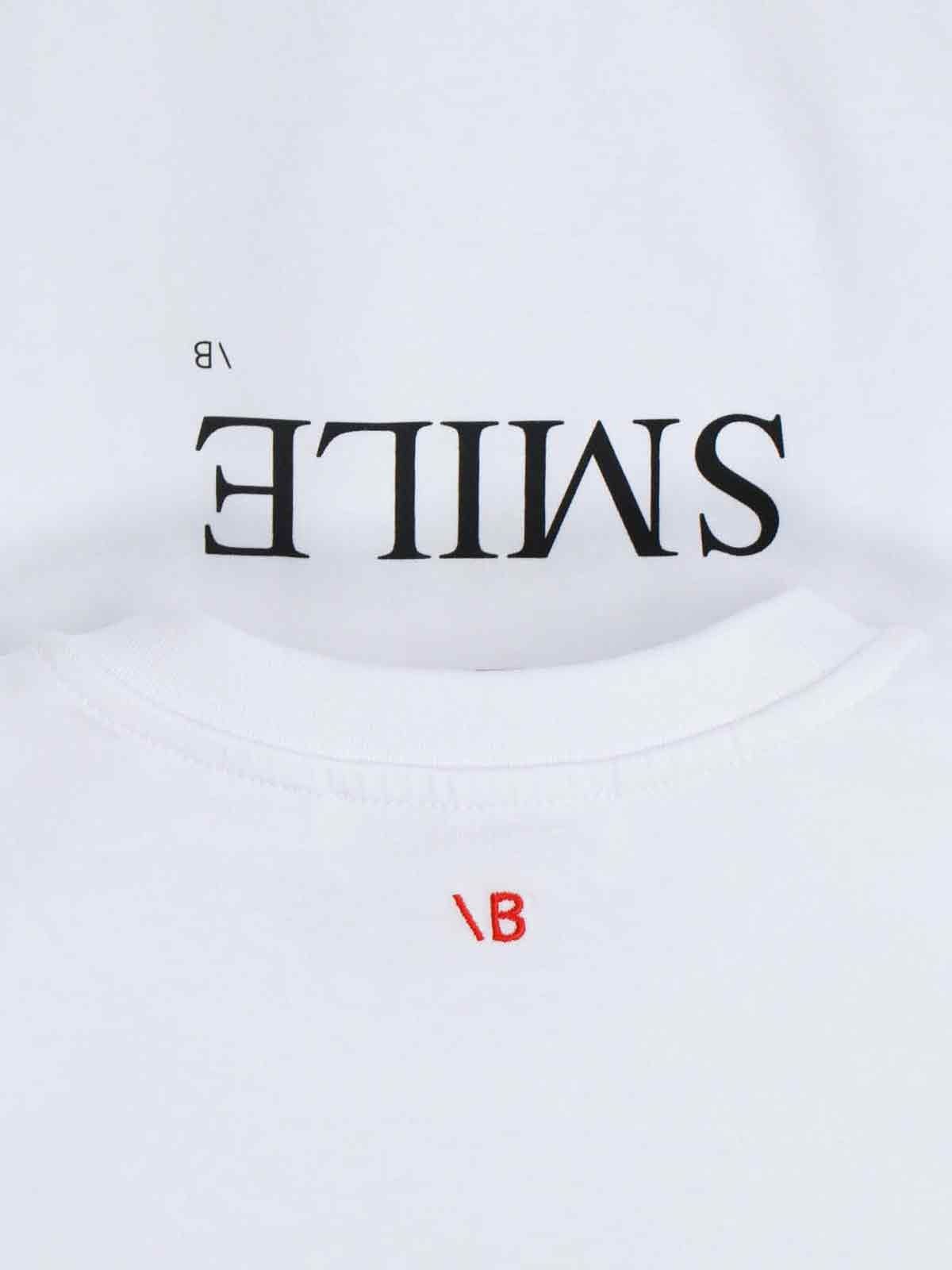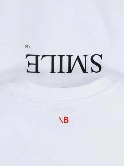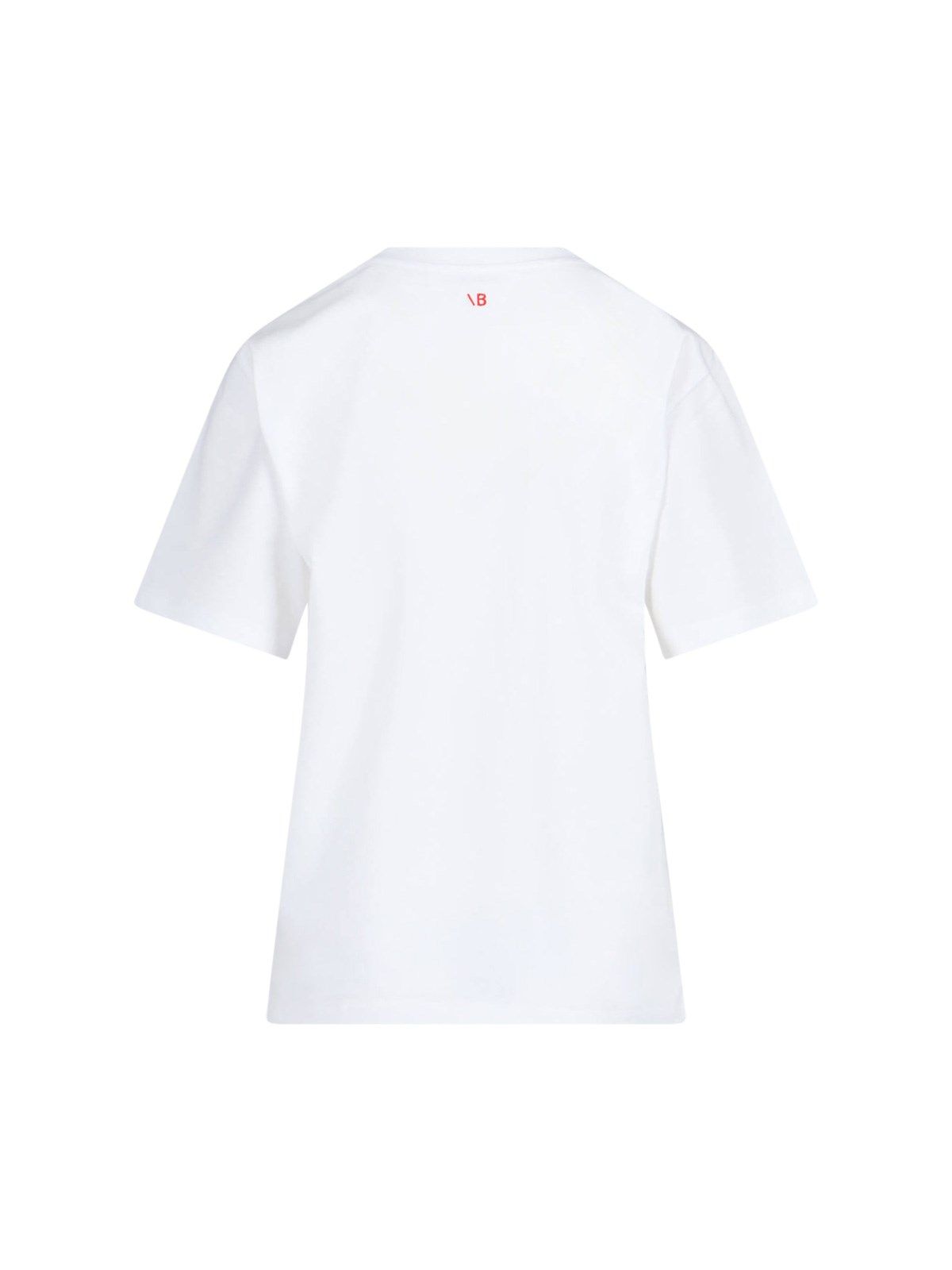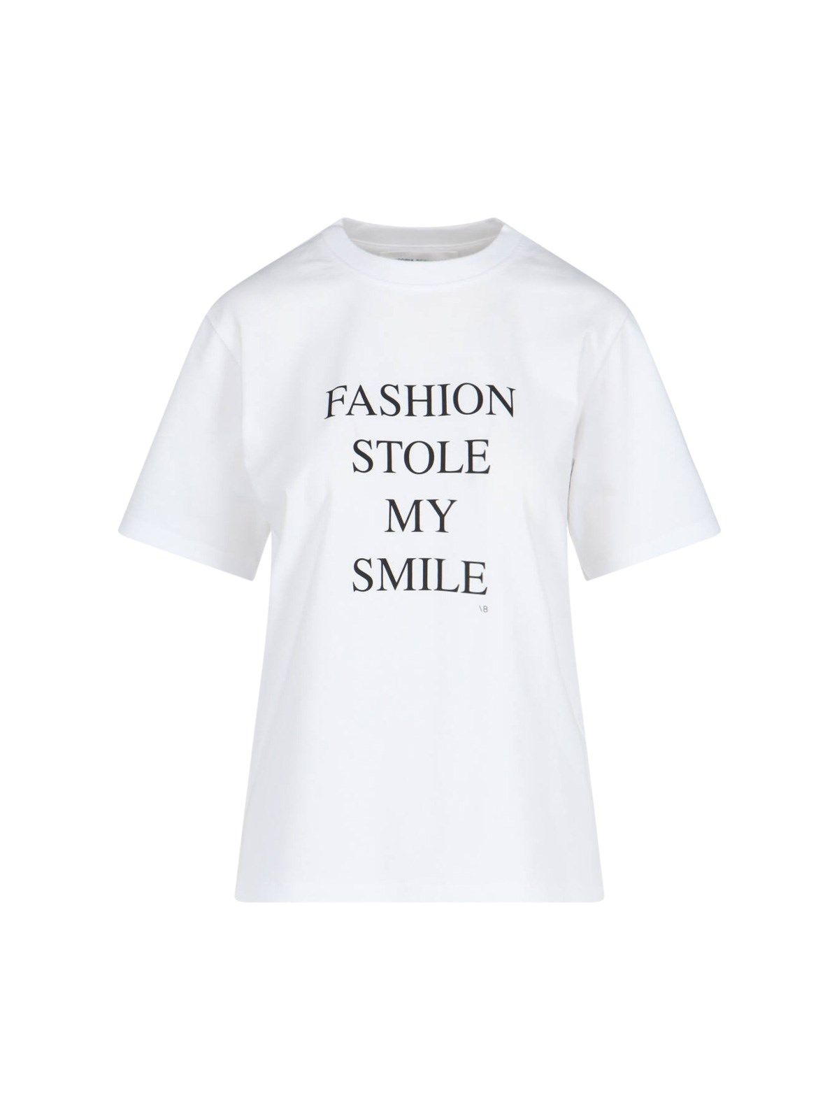 T-shirt "Fashion Stole My Smile" Victoria Beckham, in cotone bianco, girocollo, maniche corte, stampa logo a contrasto petto, ricamo logo rosso retro, orlo dritto.