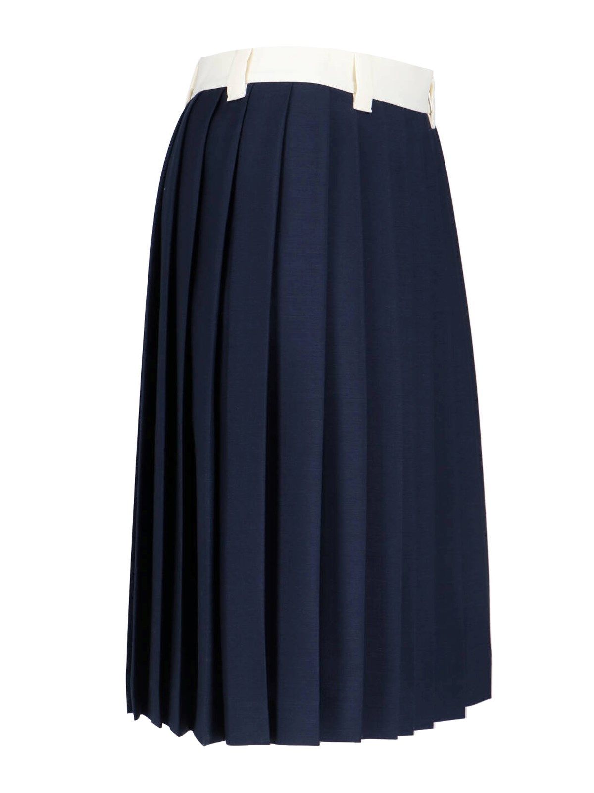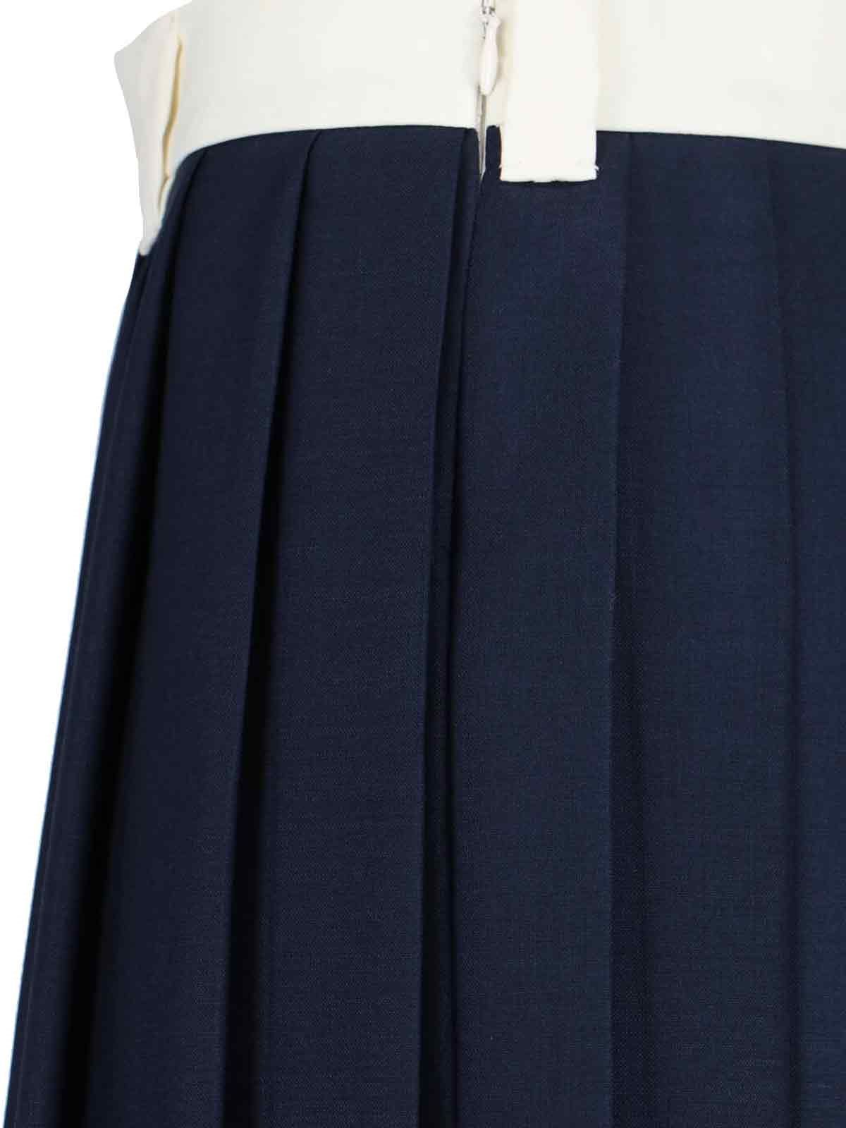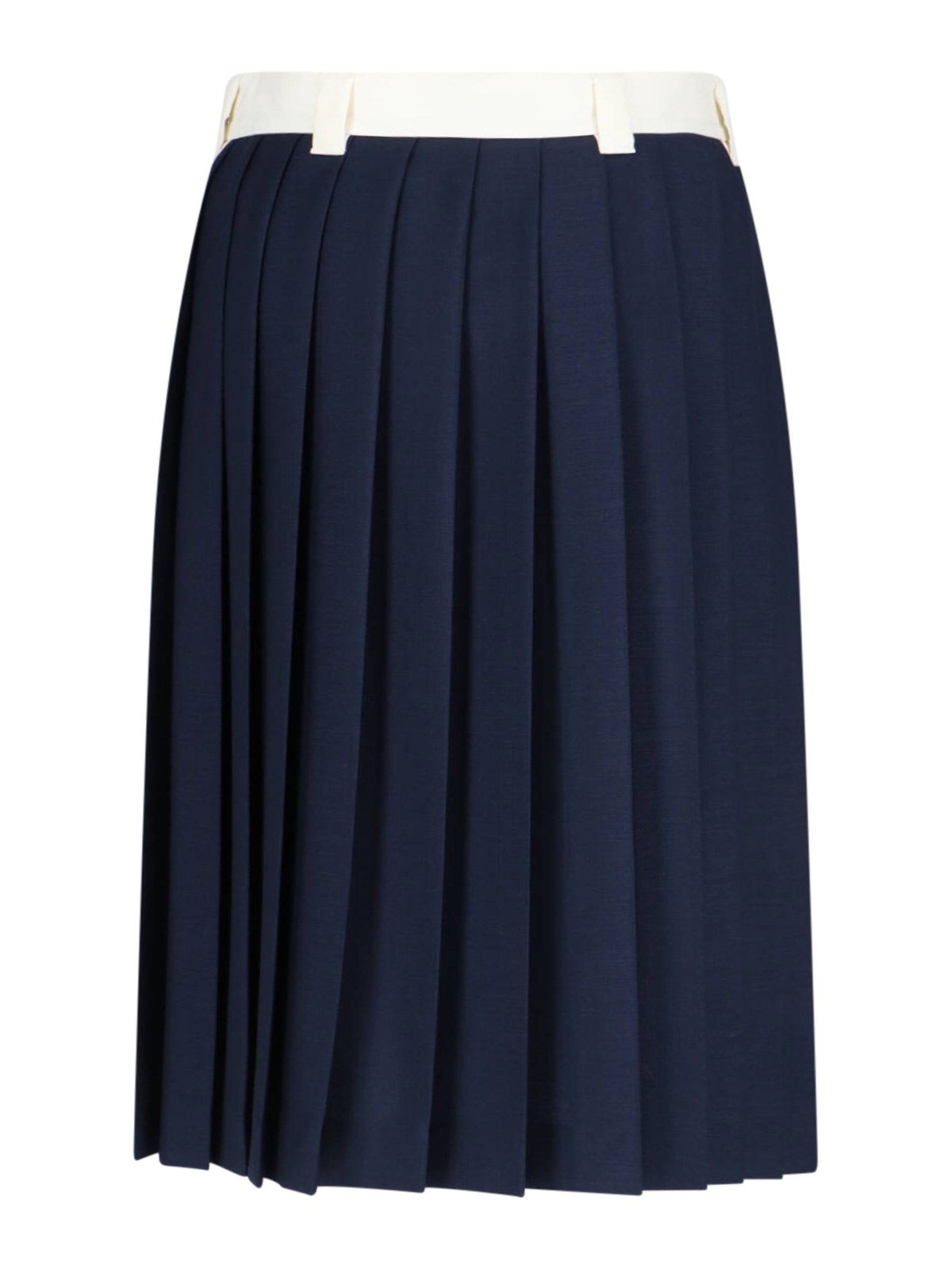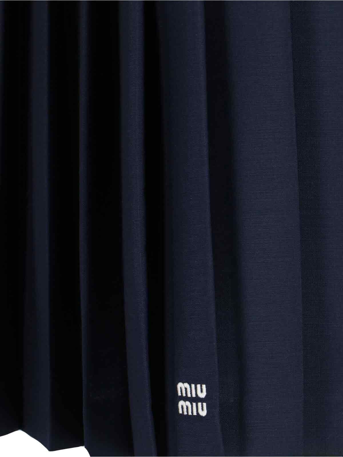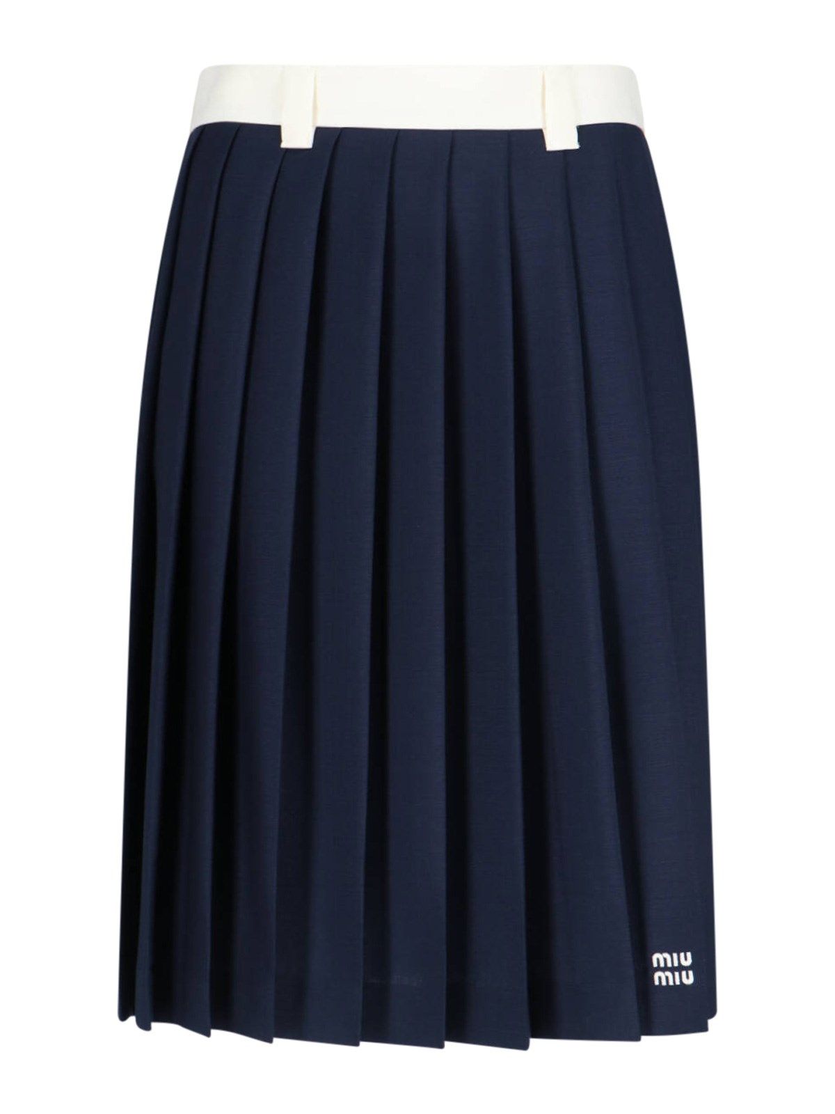Gonna midi plissettata Miu Miu, in mohair e lana vergine blu, vita media elasticizzata bianca, passanti cintura, ricamo logo bianco fronte, chiusura zip laterale, orlo dritto.