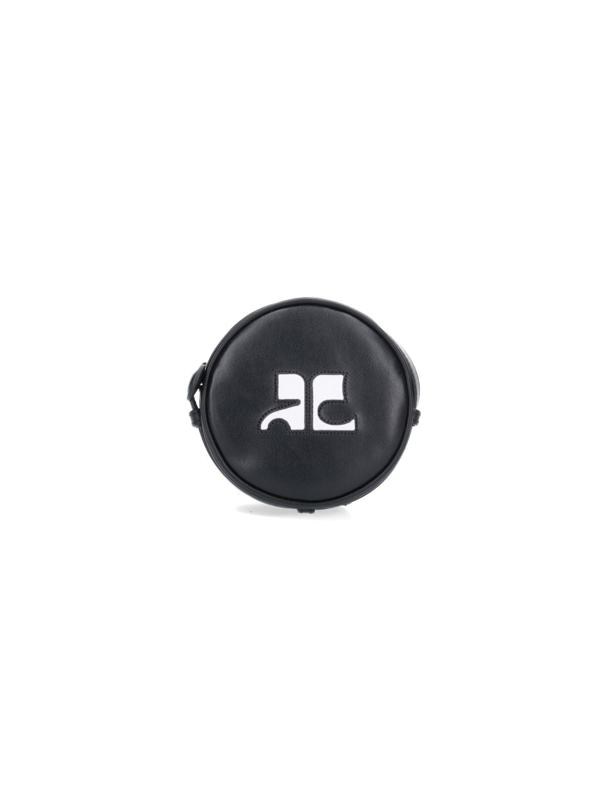 Borsa tracolla mini "Reedition Circle Bag" Courrèges, in pelle nera, tracolla regolabile, patch logo a contrasto fronte, chiusura zip, dettaglio tiralampo in pelle, uno scomparto interno principale.