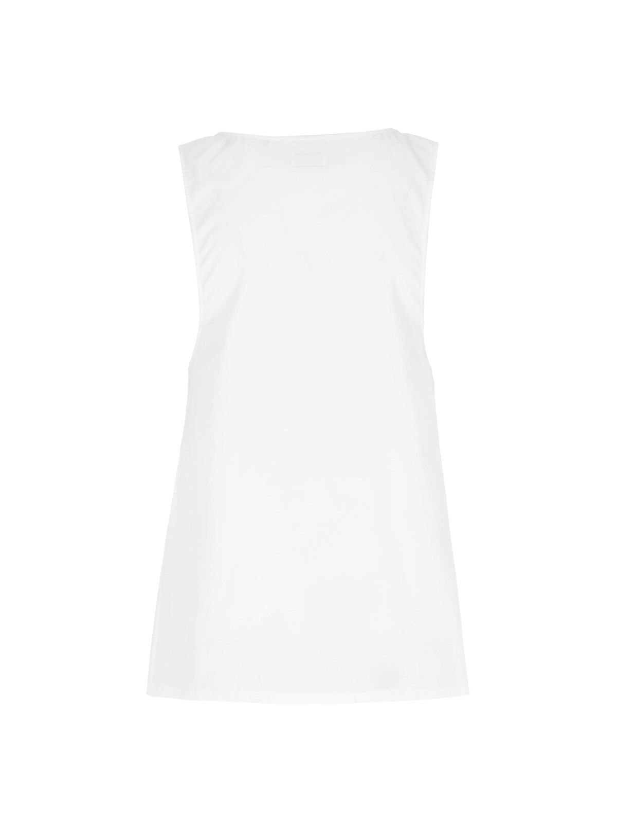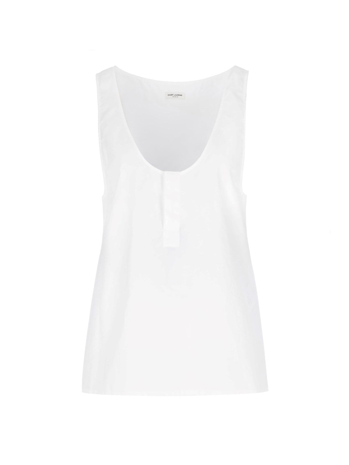 Halbtransparentes Tanktop „Henley“ von Saint Laurent, aus weißem Baumwollpopeline, U-Ausschnitt, dünne Träger, ärmellos, Verschluss mit drei verdeckten Knöpfen vorne, gerader Saum.