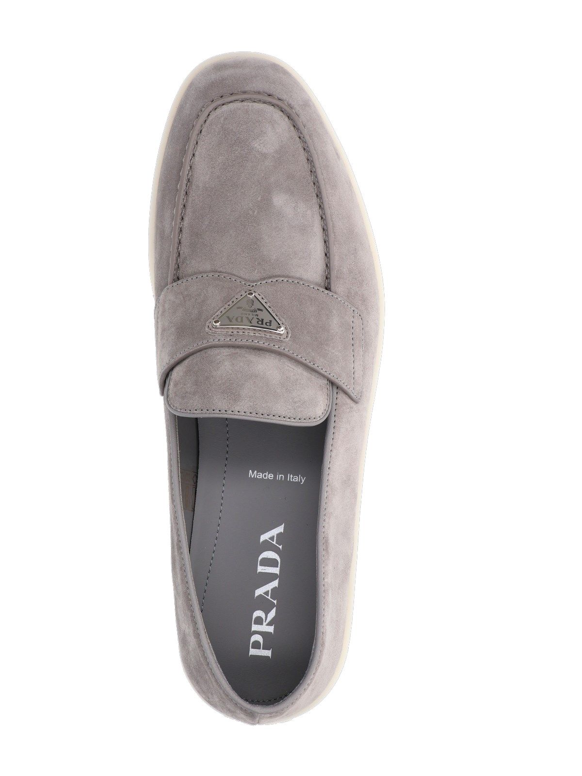 Mocassini scamosciati logo Prada, in pelle grigia, punta tonda, fascia superiore, dettaglio applicazione logo triangolo in metallo smaltato, vestibilità slip-on, suola in gomma bianca.
