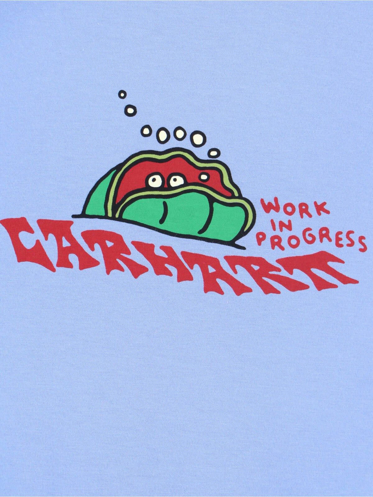 T-shirt S/S "Clam" Carhartt WIP, in jersey di cotone azzurro, girocollo, maniche corte, stampa logo verde e viola fronte, orlo dritto.