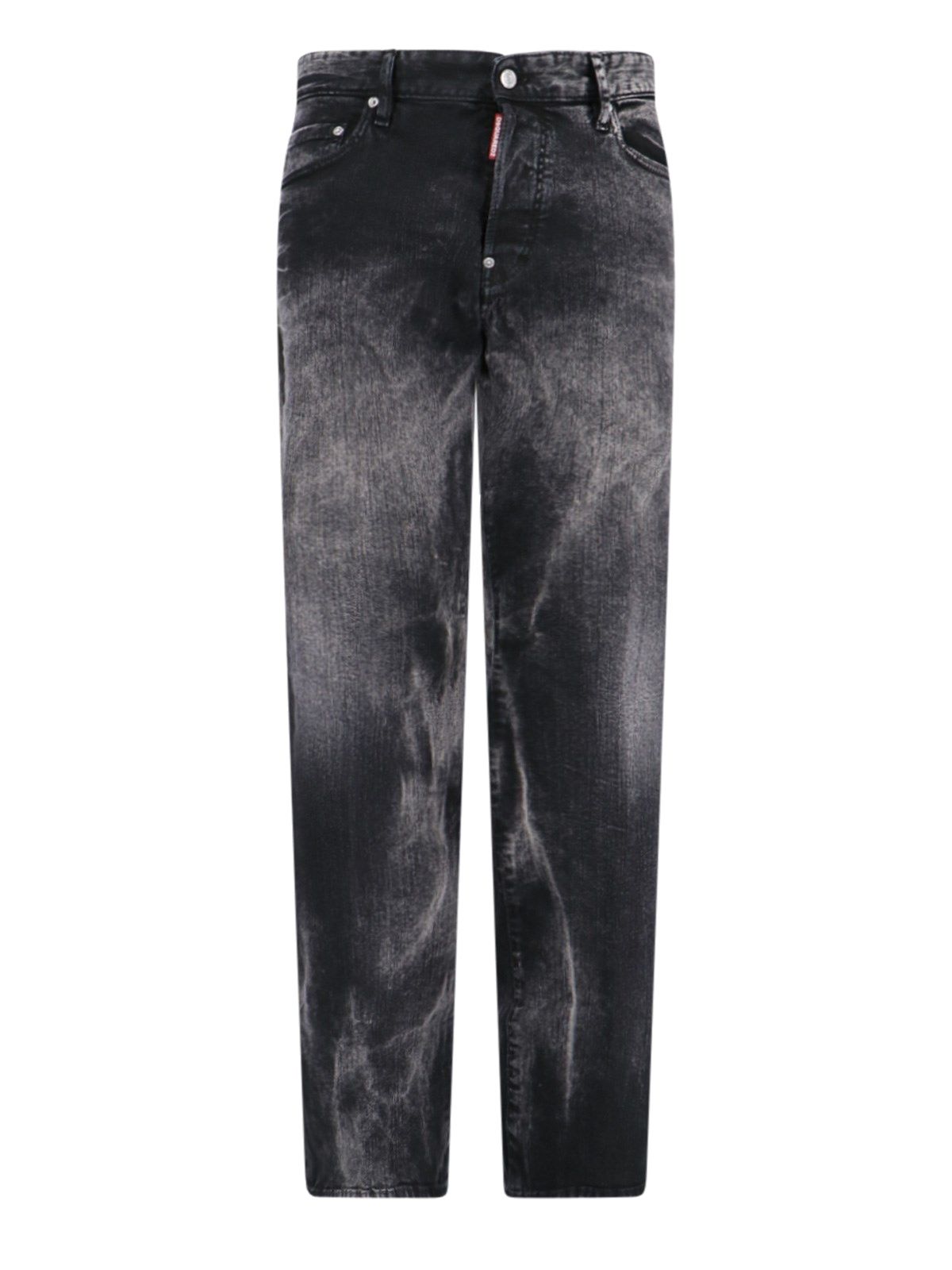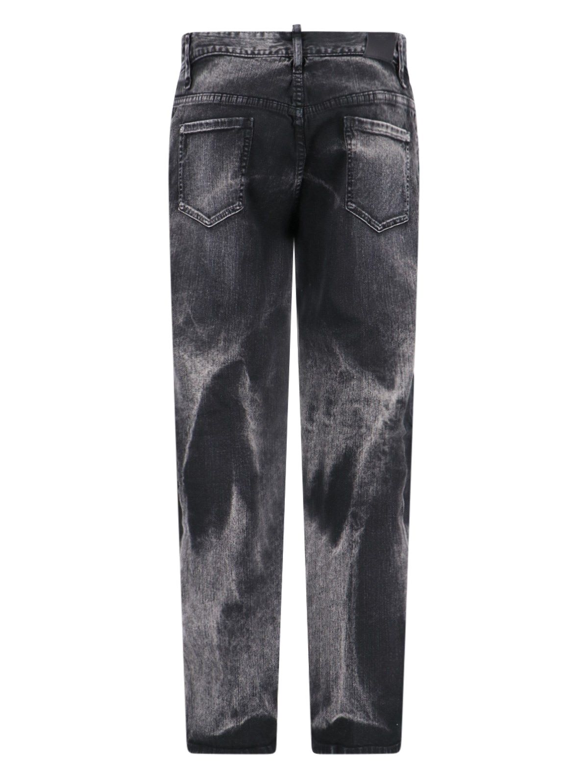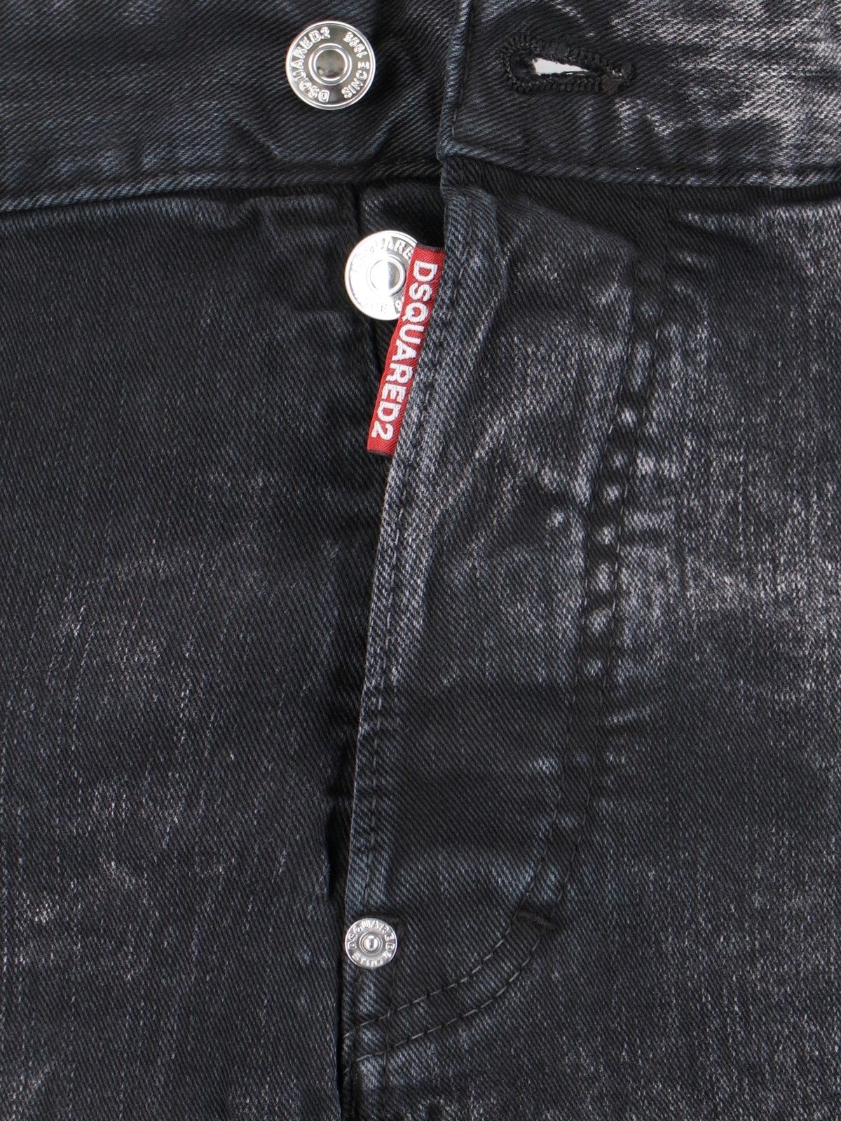 Gerade Jeans von DSquared2, aus schwarzem Denim, Used-Waschung, Gürtelschlaufen, Knopfverschluss mit Logo-Label-Detail, Five-Pocket-Design, Ton-in-Ton-Logo-Patch auf der Rückseite, gerades Bein.