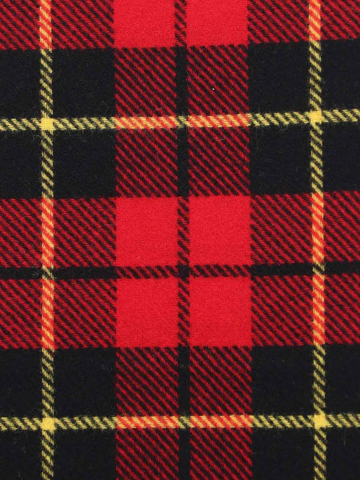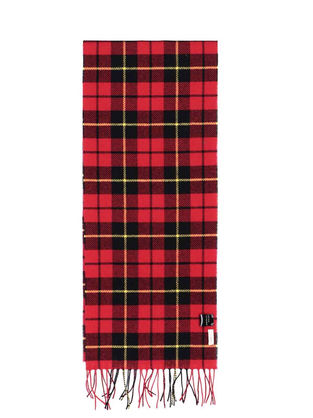 Sciarpa a quadri Destin, in lana e cashmere rossi, motivo Tartan, dettagli neri e gialli, frange su fondo.