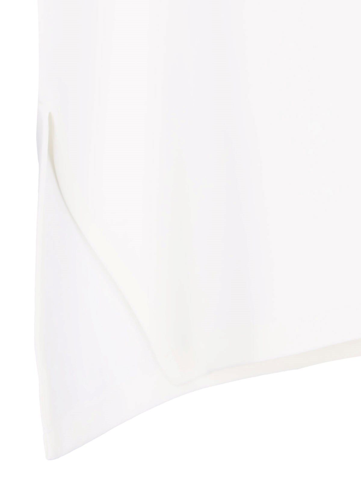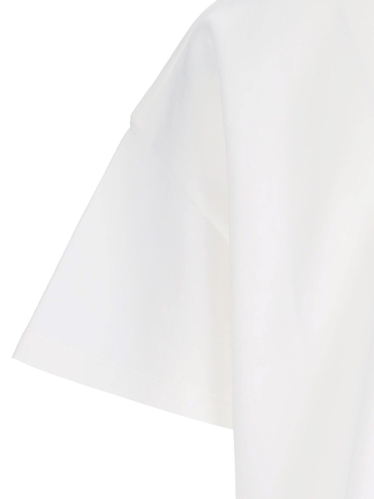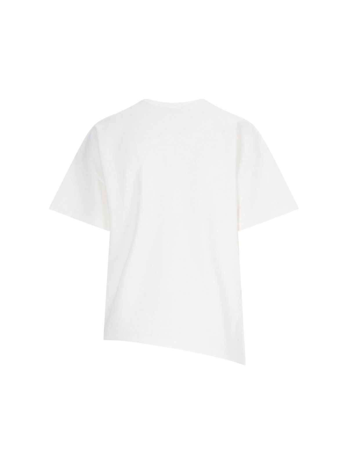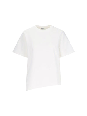 T-shirt asimmetrica logo Loewe, in misto cotone bianco, girocollo, maniche corte, ricamo logo tono su tono fronte, orlo asimmetrico.