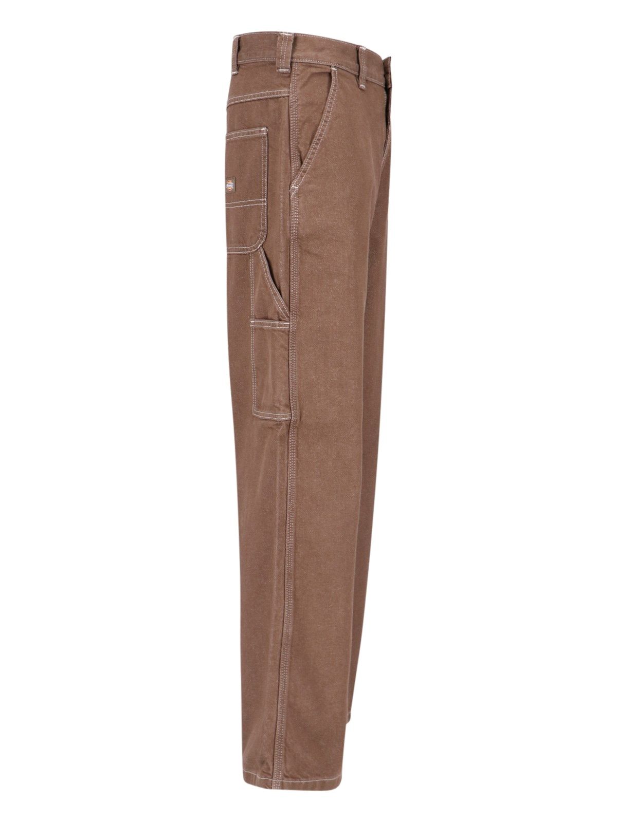 Jeans carpenter "Stevensville" Dickies, in denim marrone, vita media, passanti cintura, chiusura bottone e zip, due tasche laterali, passante per attrezzi laterale, due tasche piatte retro, dettaglio etichetta logo multicolor, gamba dritta, dettaglio tasca applicata con taschino laterale.