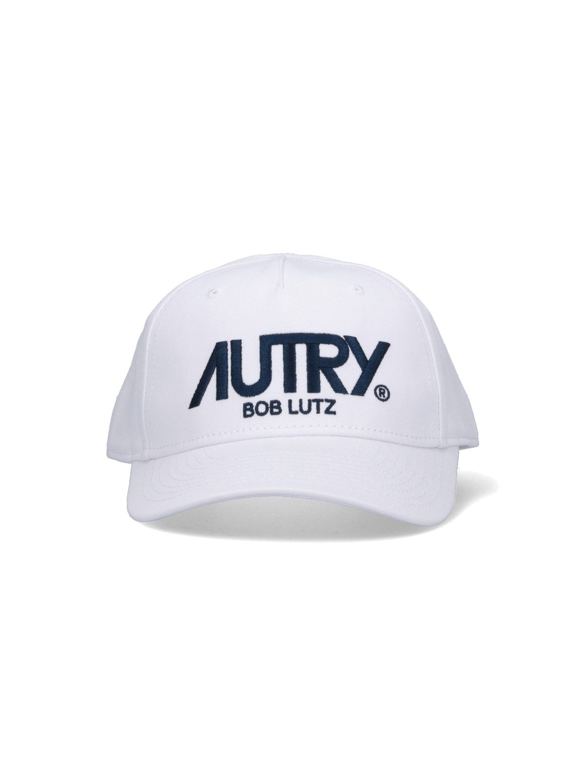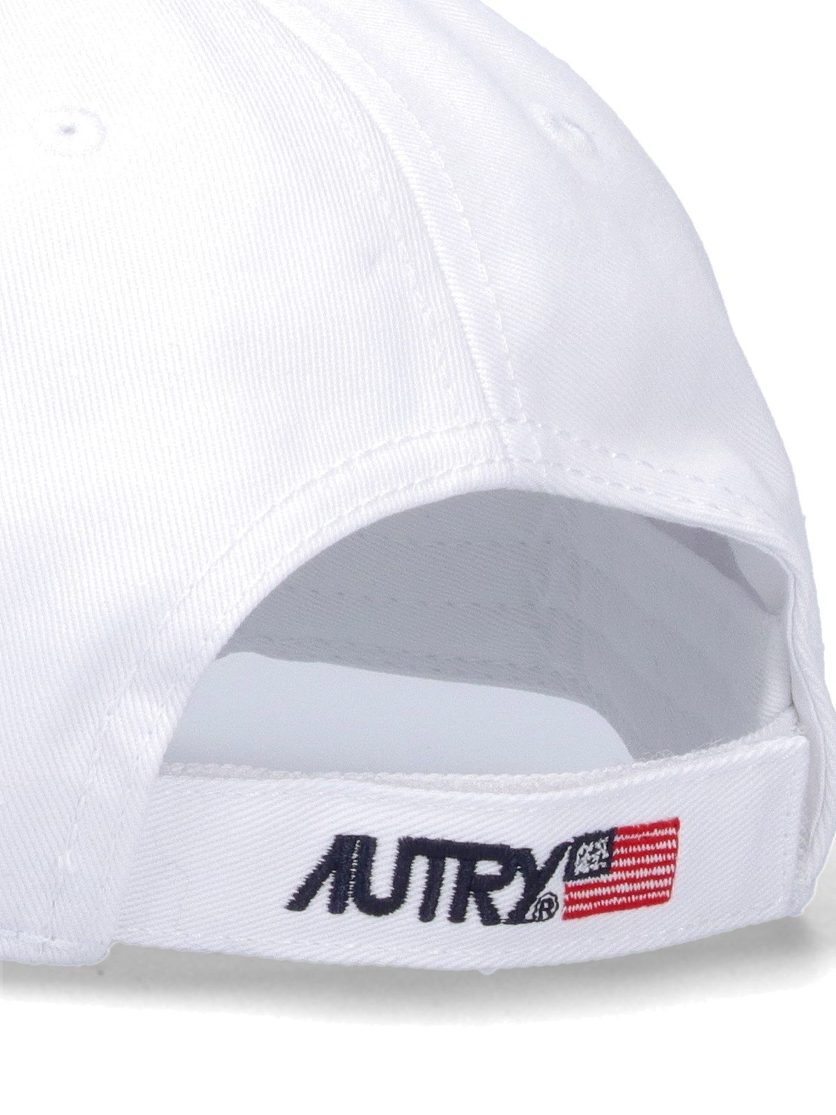 Baseballmütze mit Autry-Logo, aus weißer Baumwolle, gebogener Schirm, blaue Logo-Stickerei auf der Vorderseite, verstellbarer Riemen, mehrfarbiges Logo auf der Rückseite.