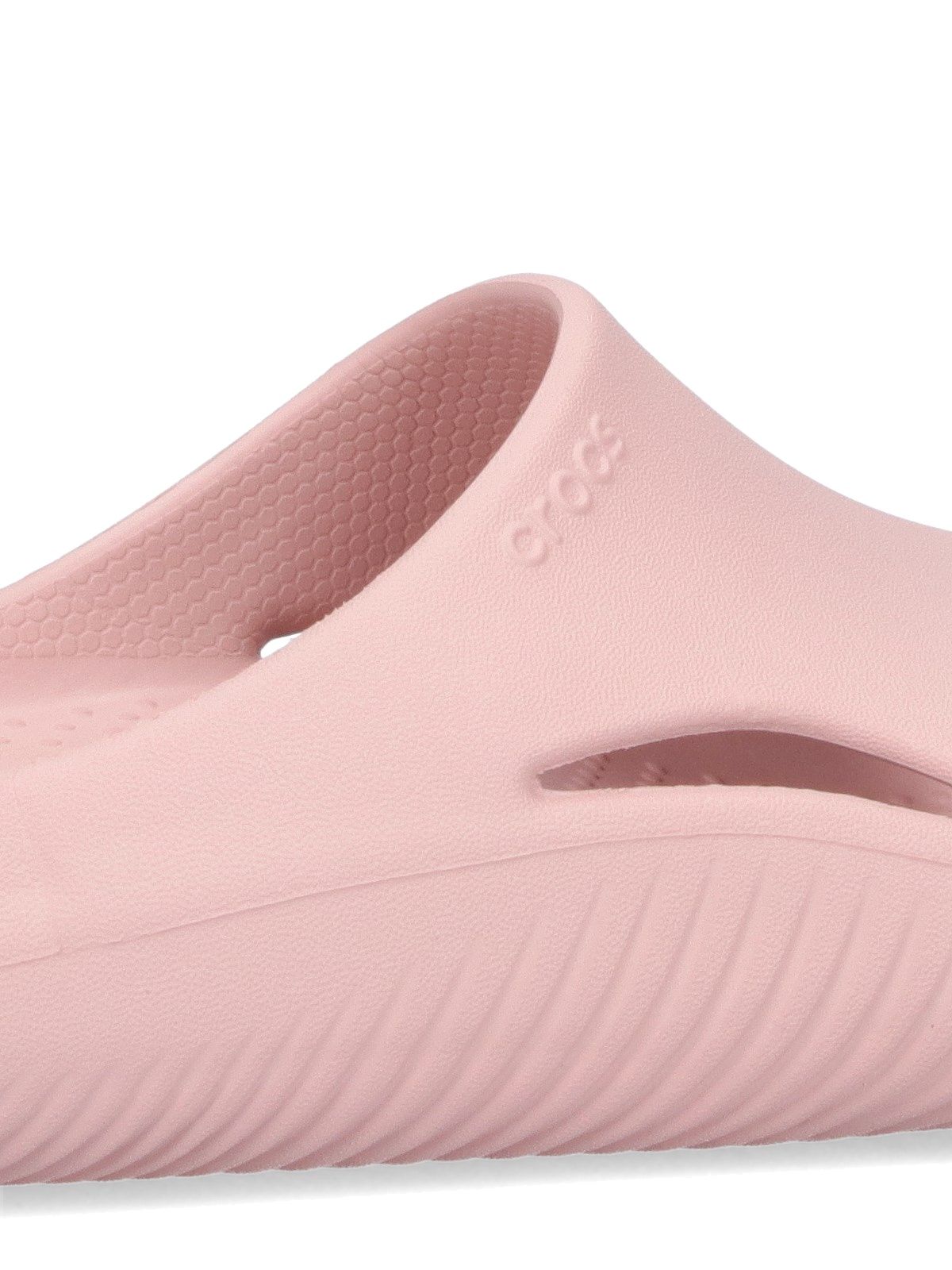 Crocs „Mellow Slide“-Sandalen, aus rosa Croslite™, offene runde Spitze, breites Oberband mit seitlichen Lochdetails, Croslite™-Sohle.