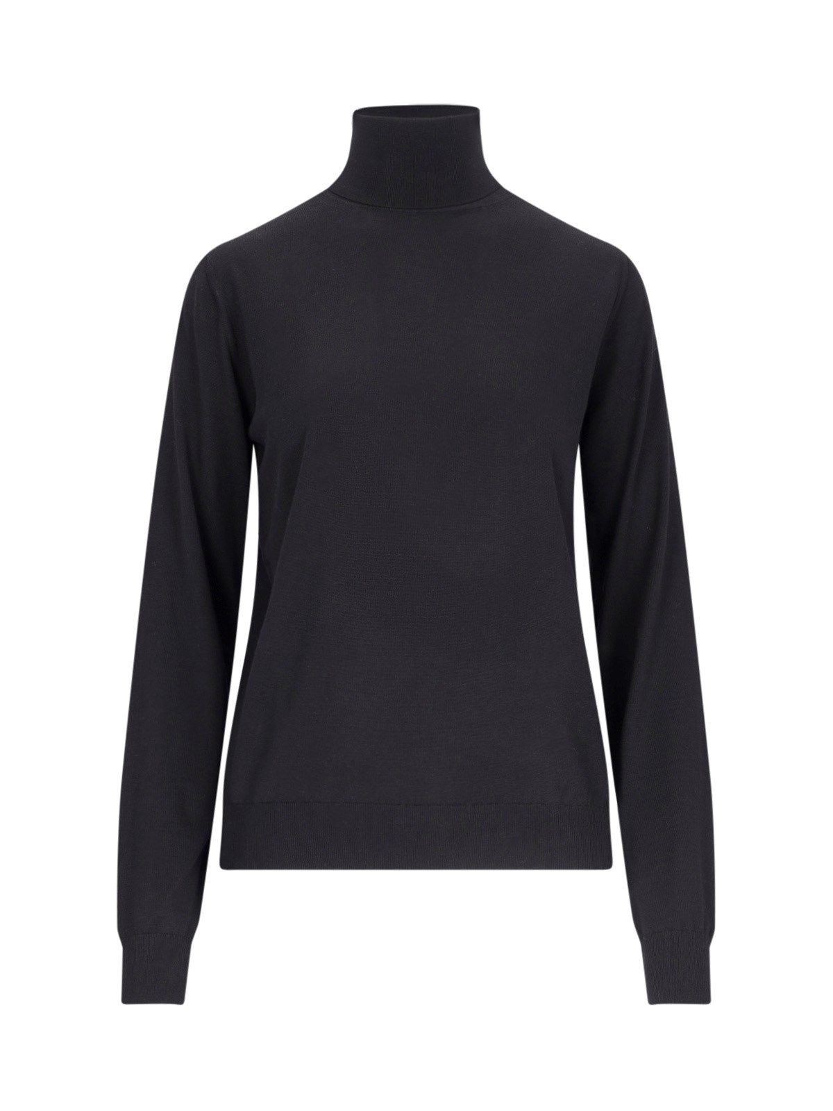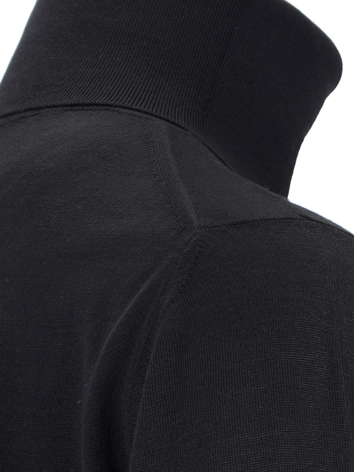 Dolcevita classico "Heva" The Row, in cashmere nero, impunture iconiche tono su tono retro, finiture a costine, orlo dritto, dettaglio vita elasticizzata su fondo.