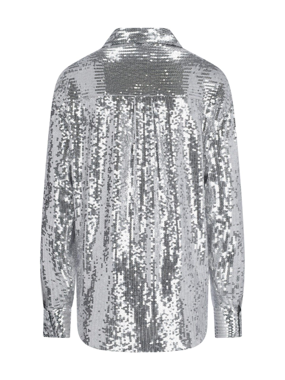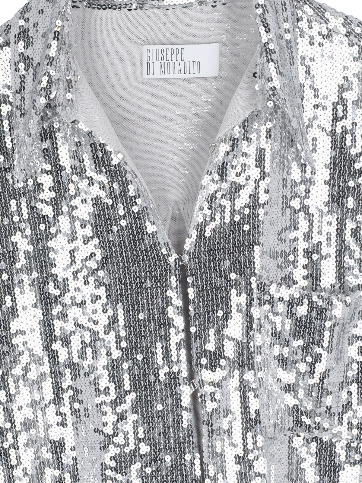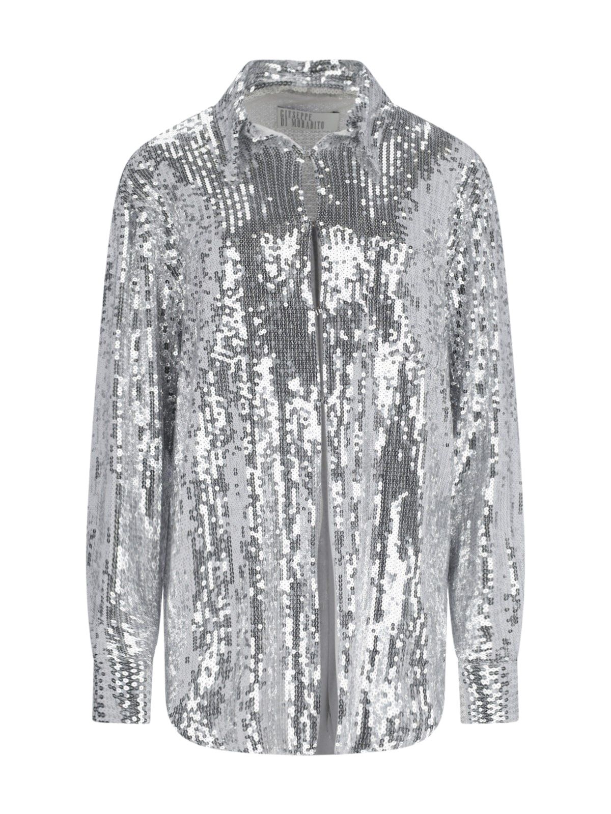 Giuseppe Di Morabito Paillettenhemd aus silbernem Stoff, klassischer Kragen, Hakenverschluss, aufgesetzte Brusttasche, abgerundeter Saum.
