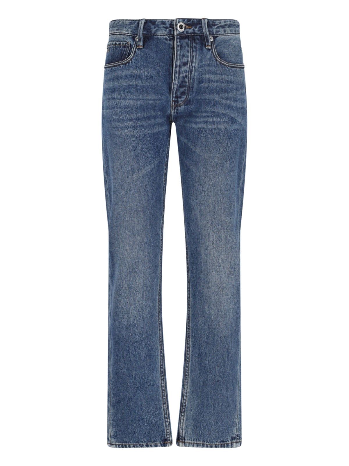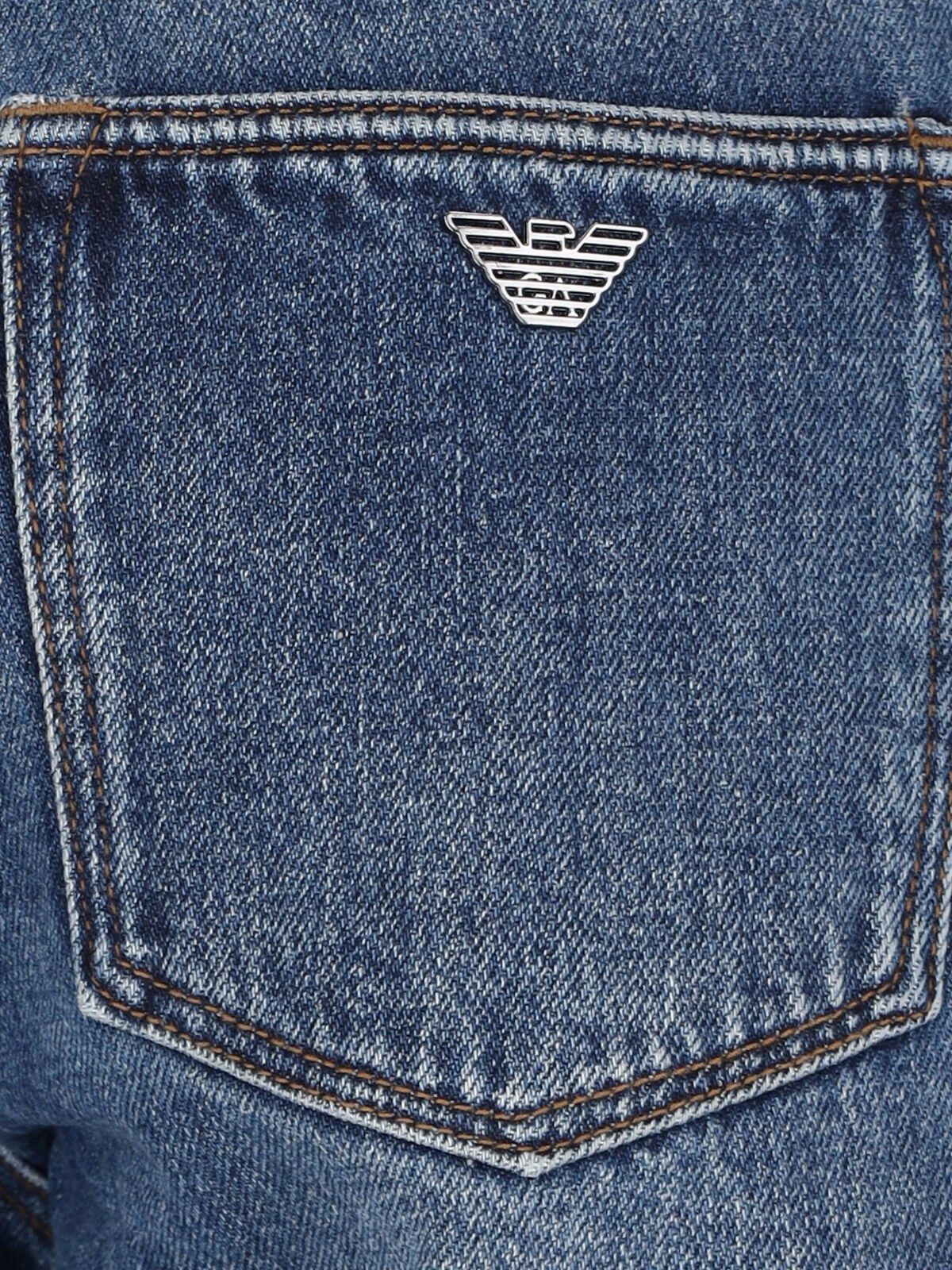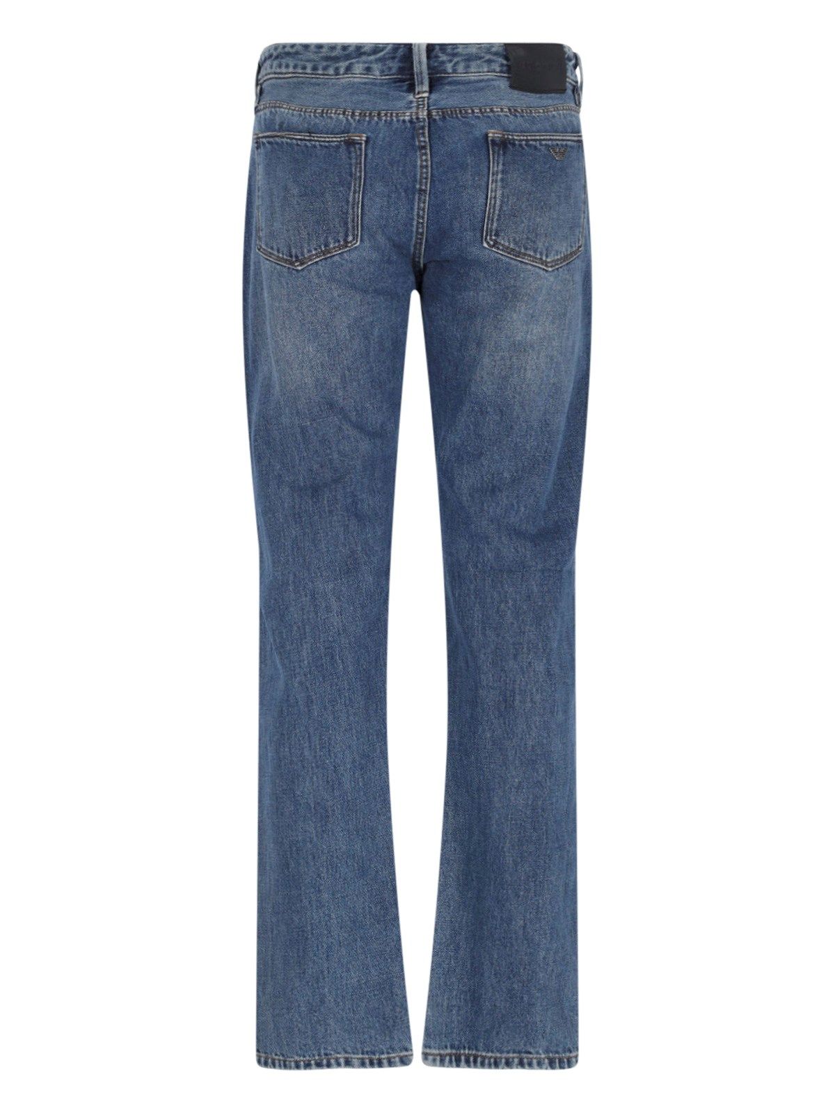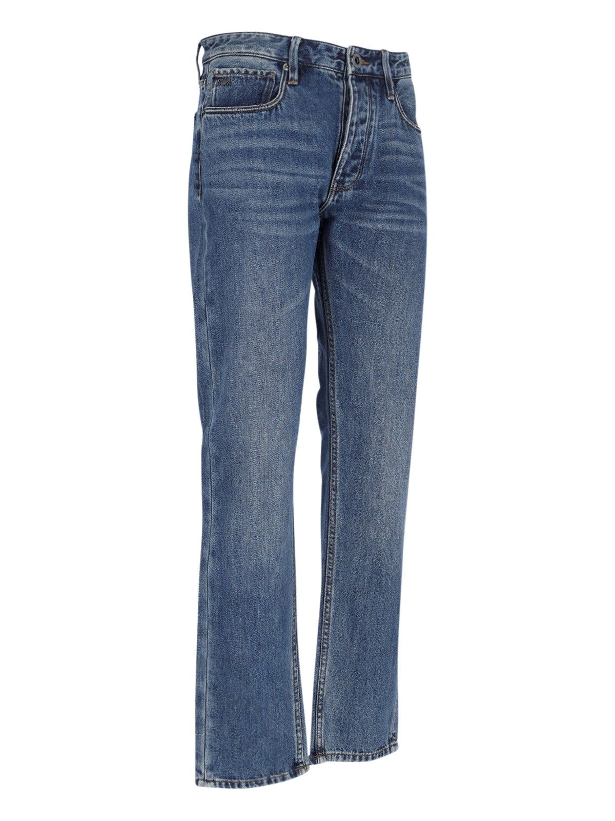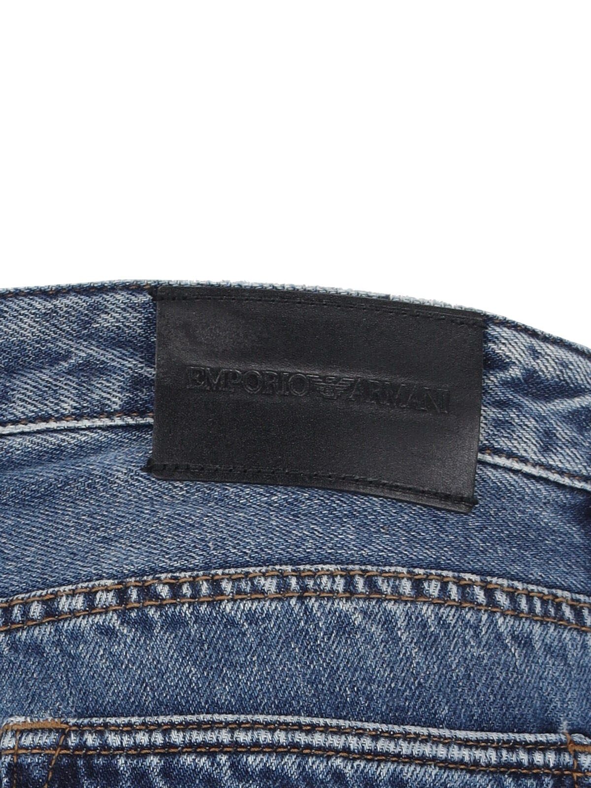 Jeans slim Emporio Armani, in cotone blu, lavaggio usured, vita media, passanti cintura, chuisura bottoni e zip, design cinque tasche, patch logo nero retro, gamba dritta.