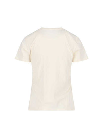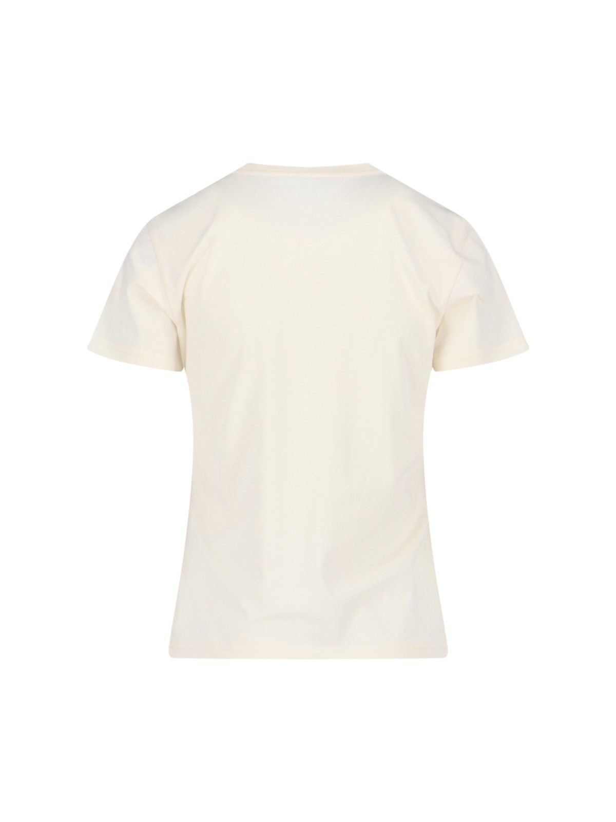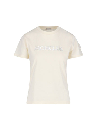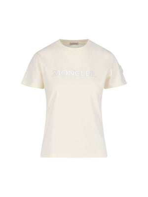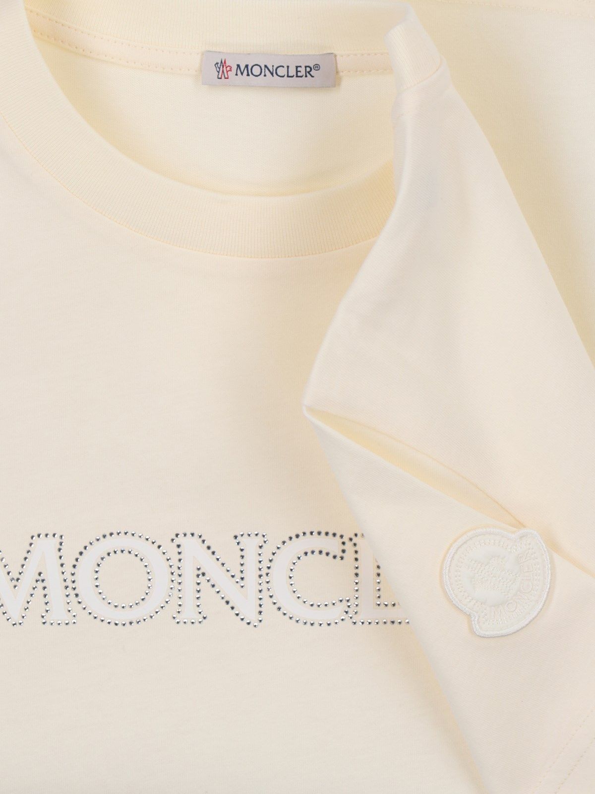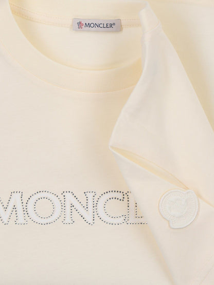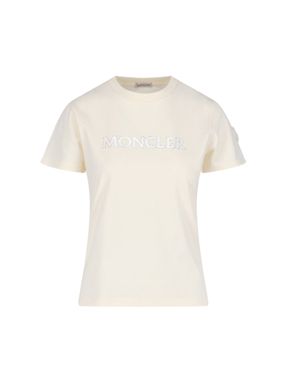 T-shirt logo strass Moncler, in cotone panna, girocollo, maniche corte, logo petto, patch logo tono su tono laterale, orlo dritto.