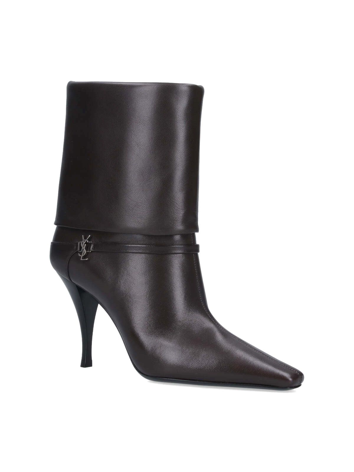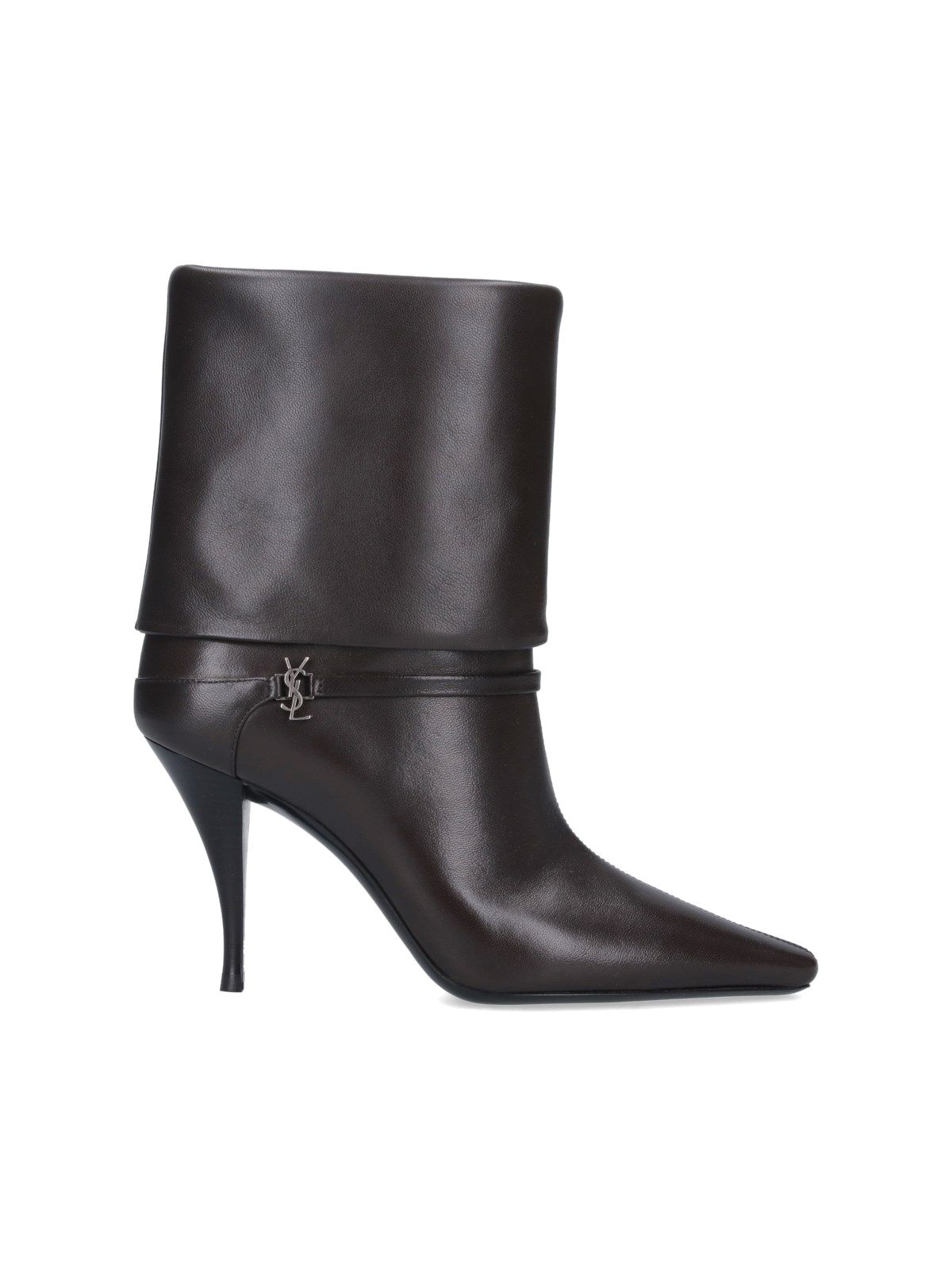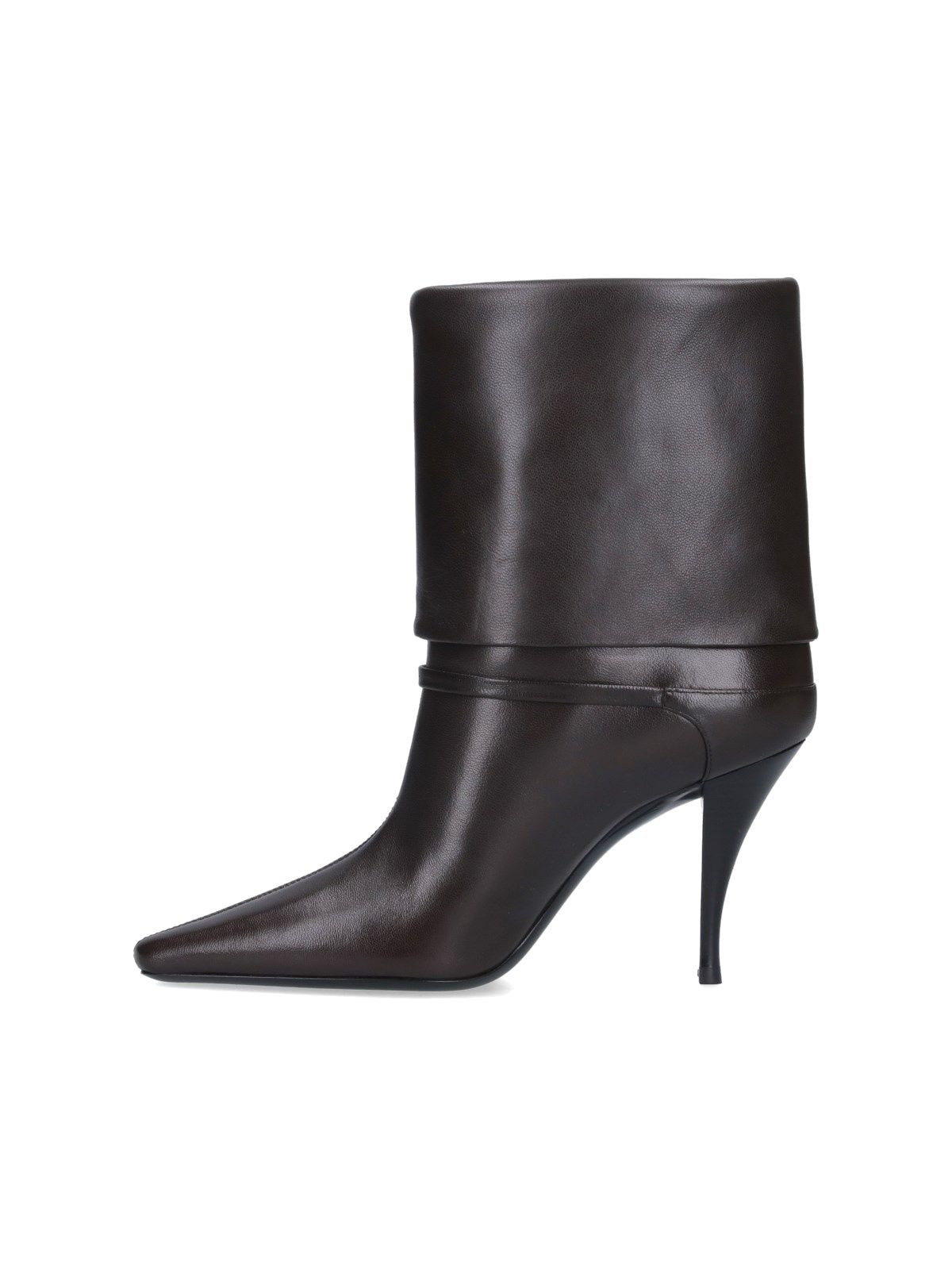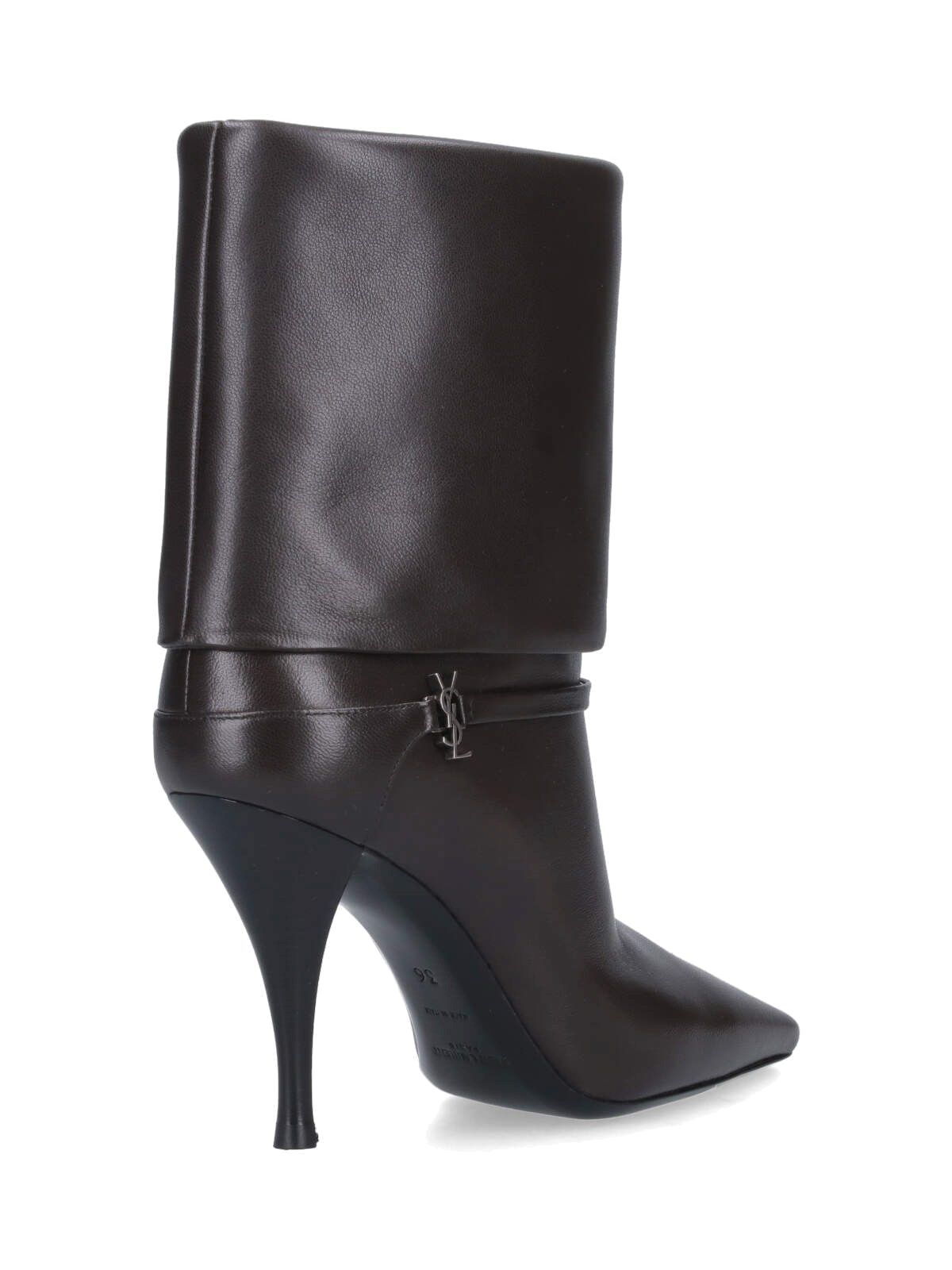 Stivaletti "Vicky 90" Saint Laurent, in pelle martellata marrone, a punta, logo in metallo nero laterale, tacco a stiletto, vestibilità slip-on, suola in pelle.