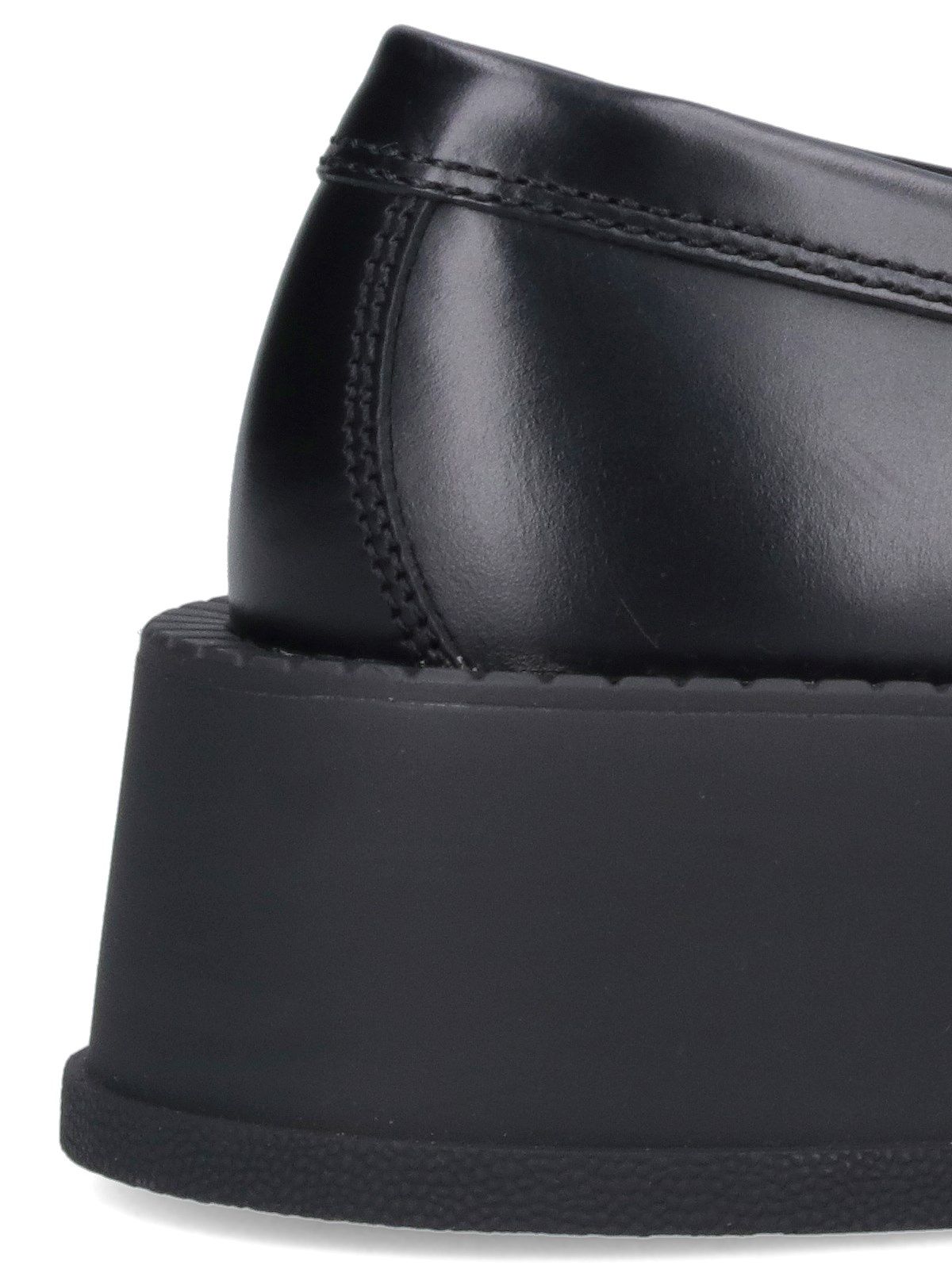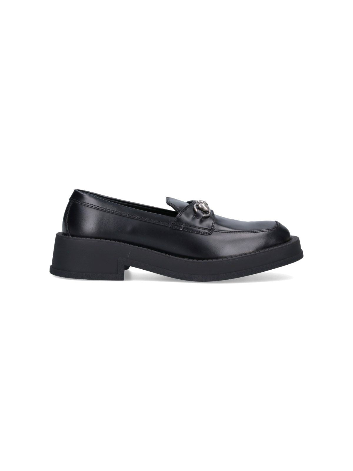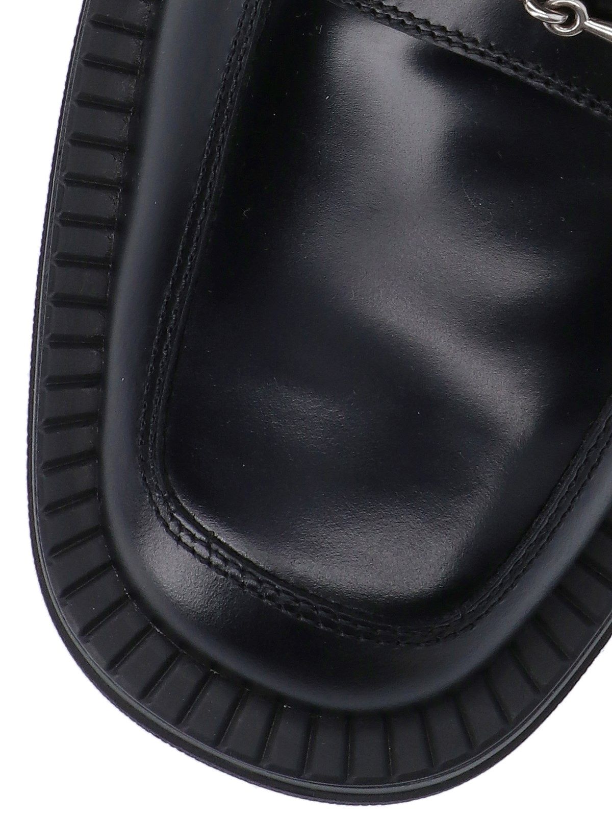 Mocassini morsetto Gucci, in pelle nera, punta squadrata, modello slip-on, dettaglio morsetto metallico argentato fronte, tacco sqaudrato retro, suola in gomma.