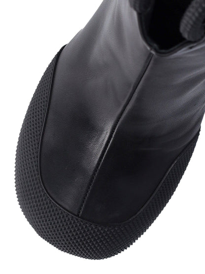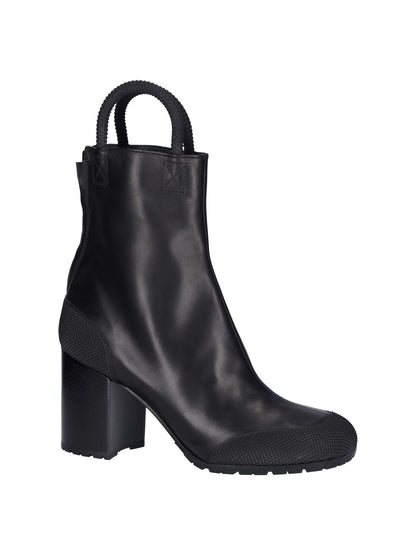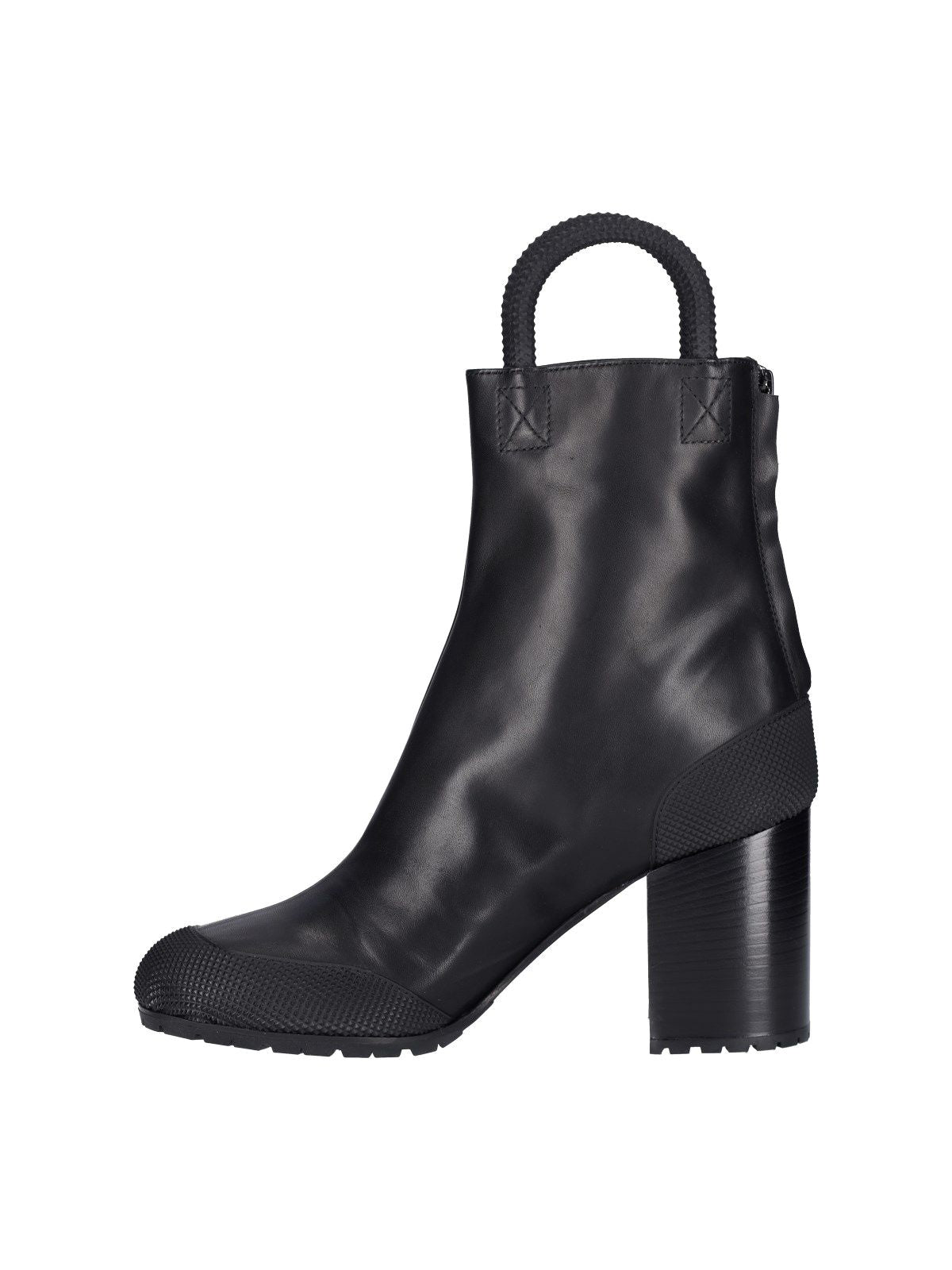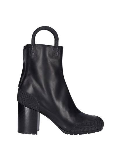 „Worker“-Stiefeletten von Random Identities, aus schwarzem Leder, runde Spitze, Gummi-Zeheneinsatz, Gummigriffdetail oben, Reißverschluss hinten, Gummisohle.