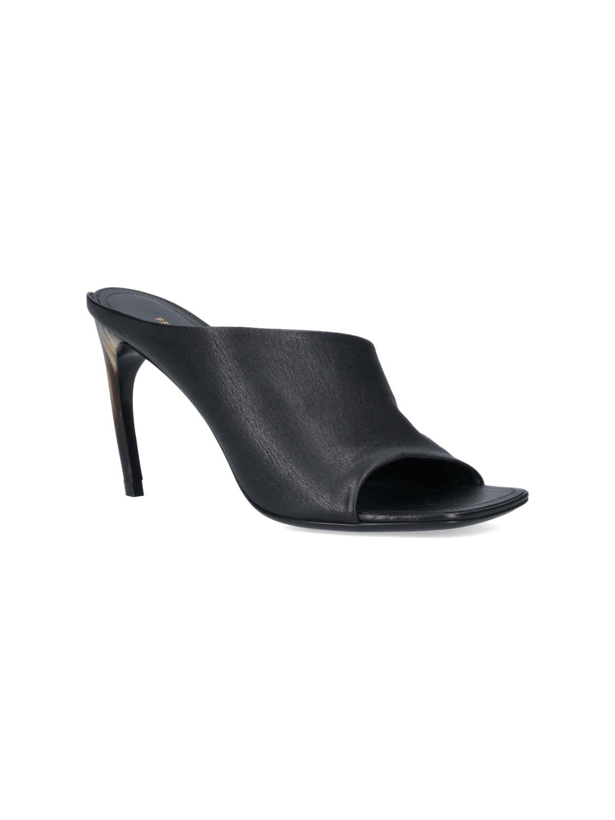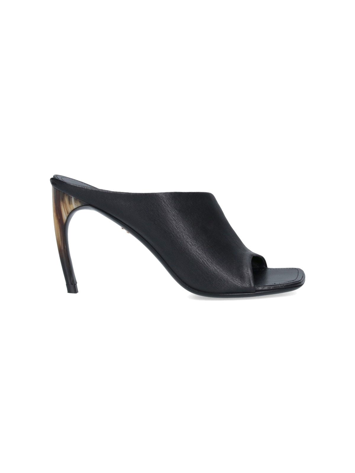 Ferragamo-Slipper mit gebogenem Absatz, aus schwarzem, mattem Nappaleder, offene quadratische Spitze, unteres goldmetallisches Logo-Detail, Slip-On-Passform, gebogener Absatz in Hornoptik, Ledersohle.