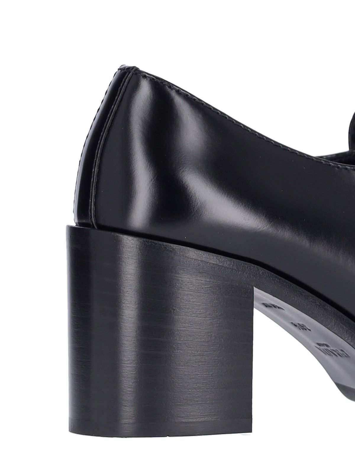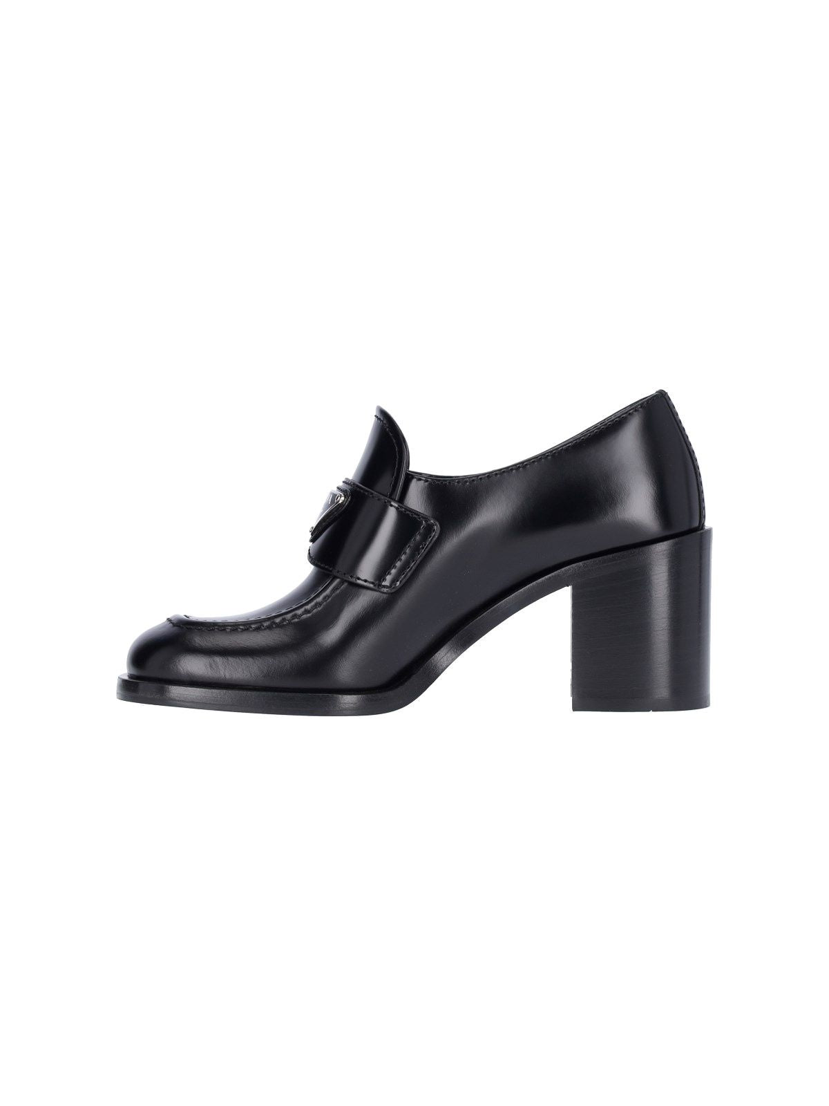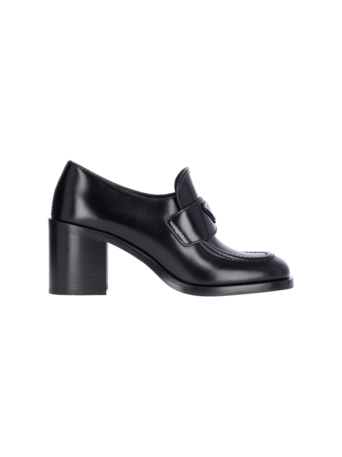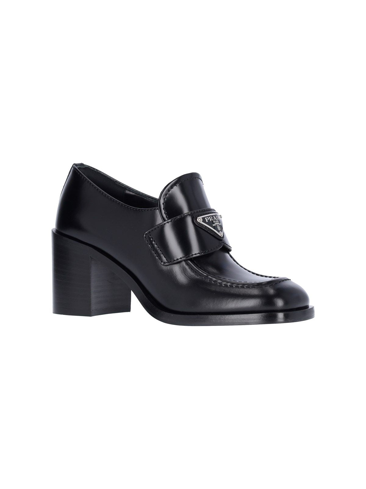 Mocassini con tacco in pelle Prada, neri, punta tonda, patch logo in metallo applicato fronte, vestibilità slip-on, suola in cuoio.
