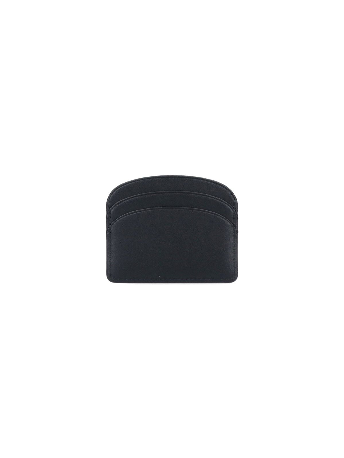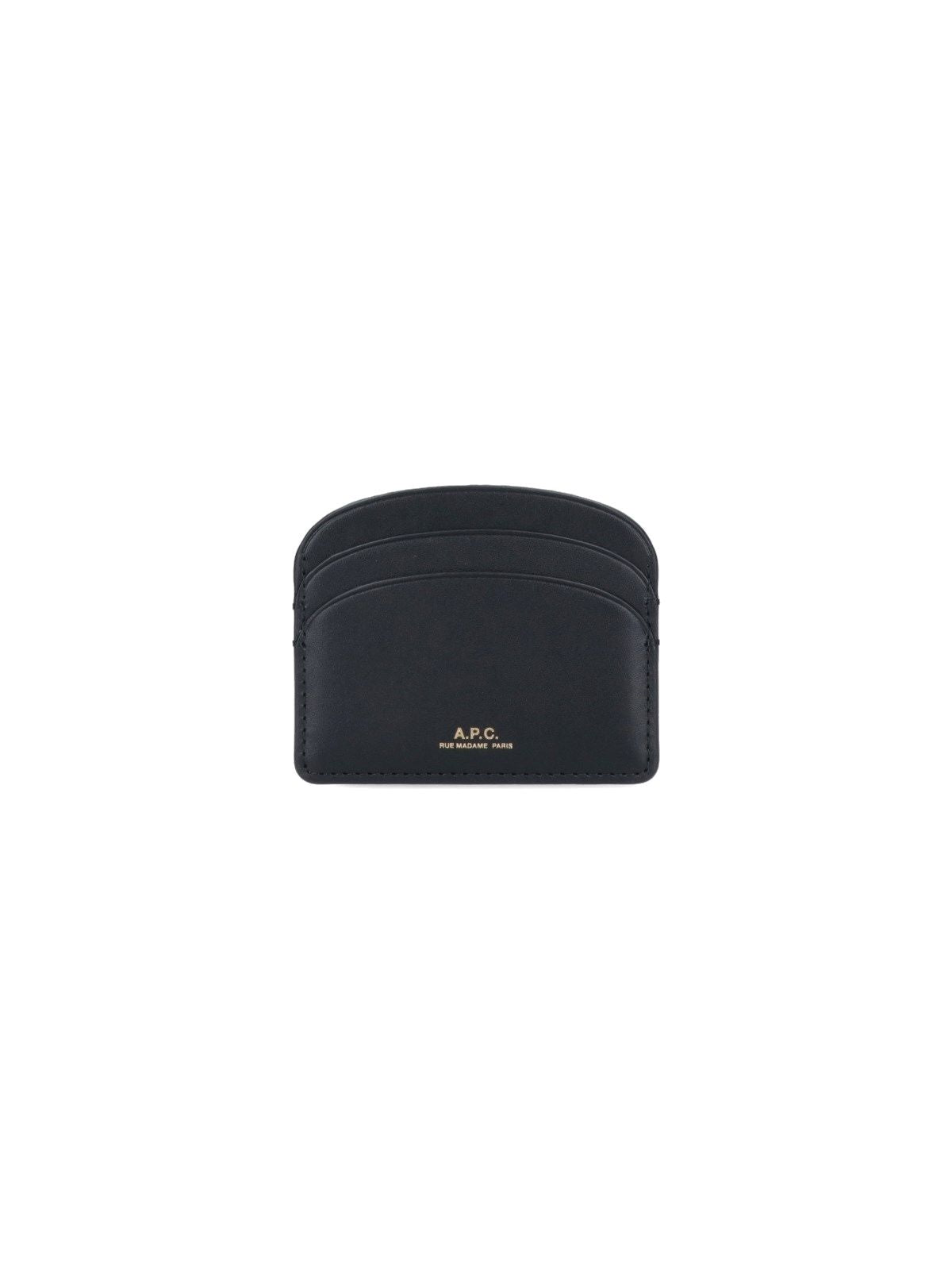 APC „Demi-Lune“-Kartenetui aus schwarzem Leder, ein flaches Fach oben, zwei Kartenfächer auf der Vorderseite, goldgeprägtes Logo auf der Vorderseite, zwei Kartenfächer auf der Rückseite.
