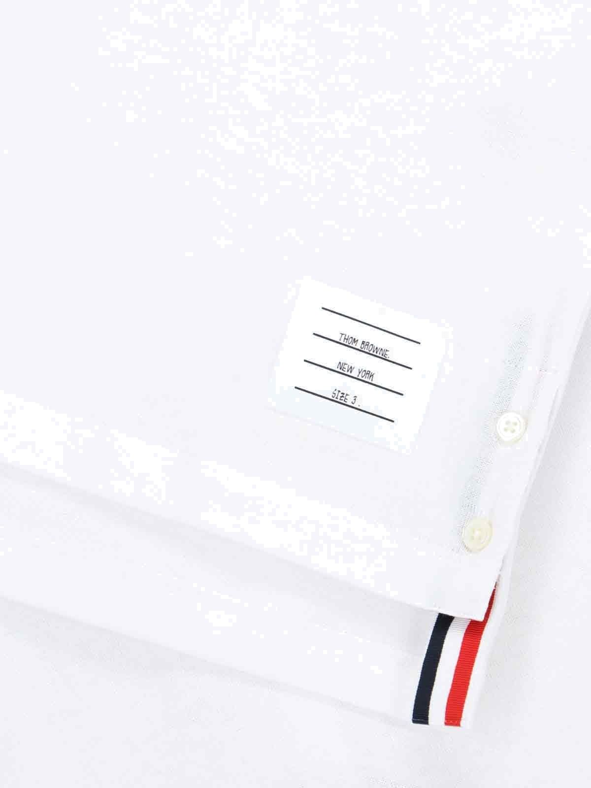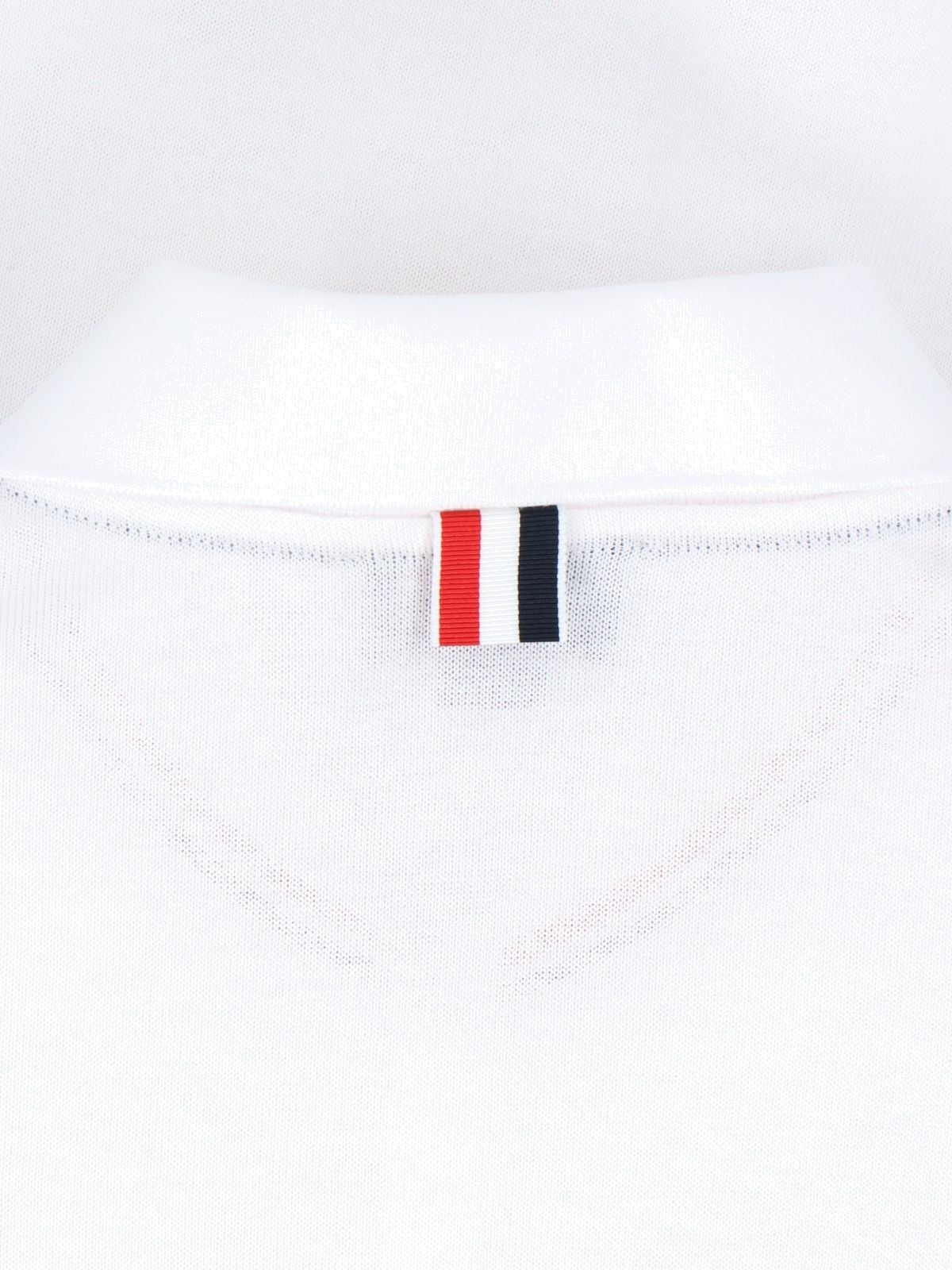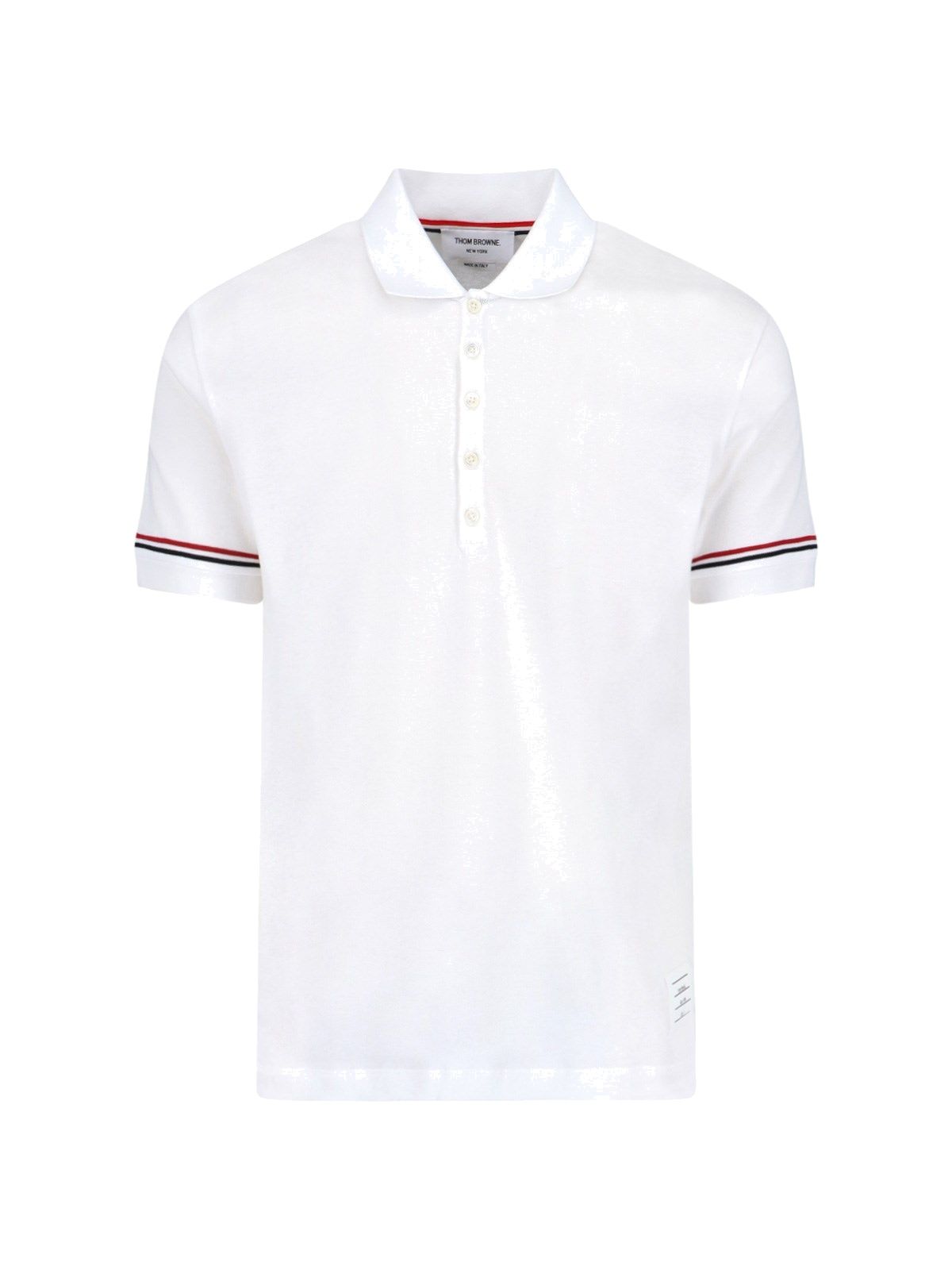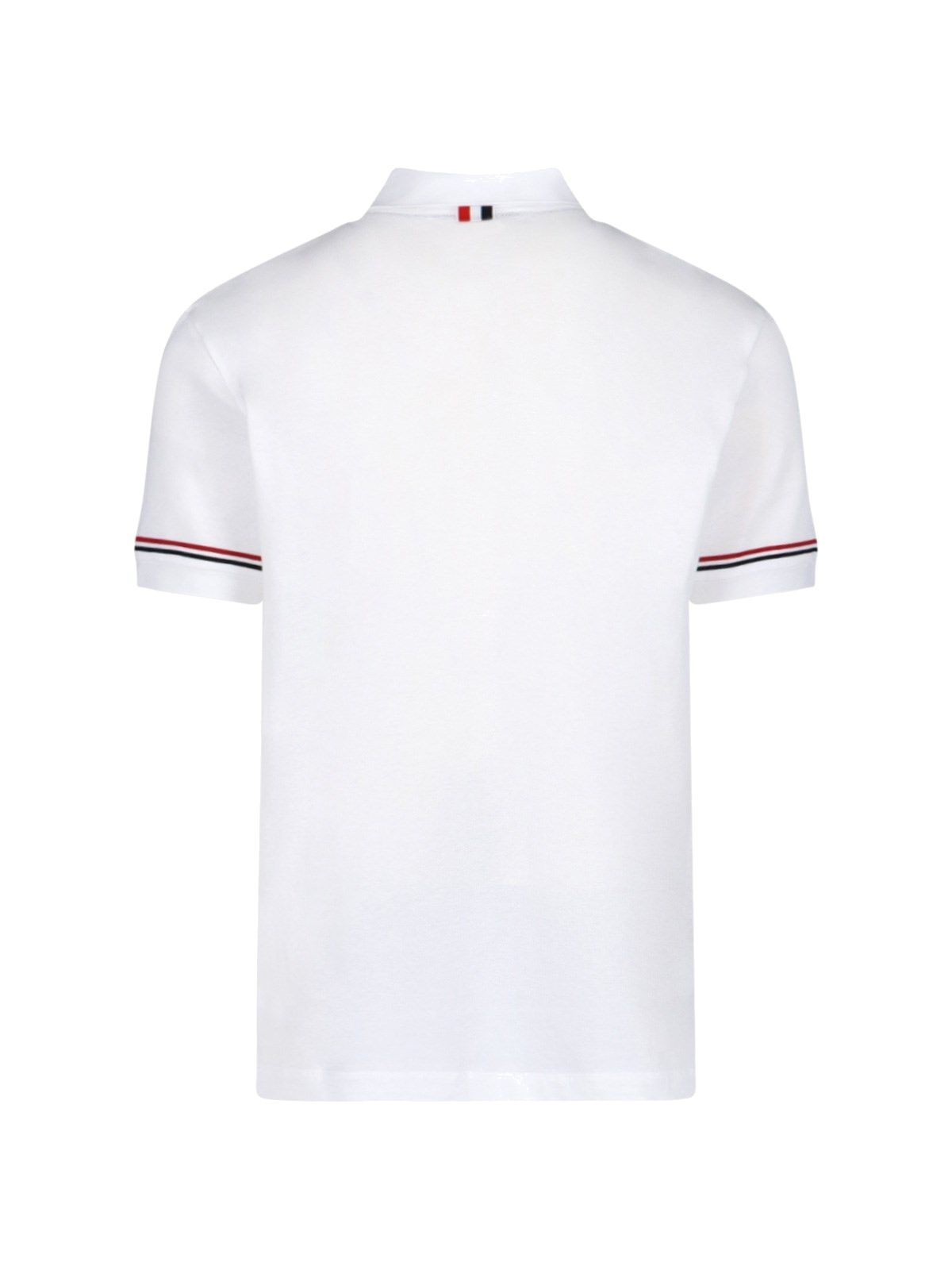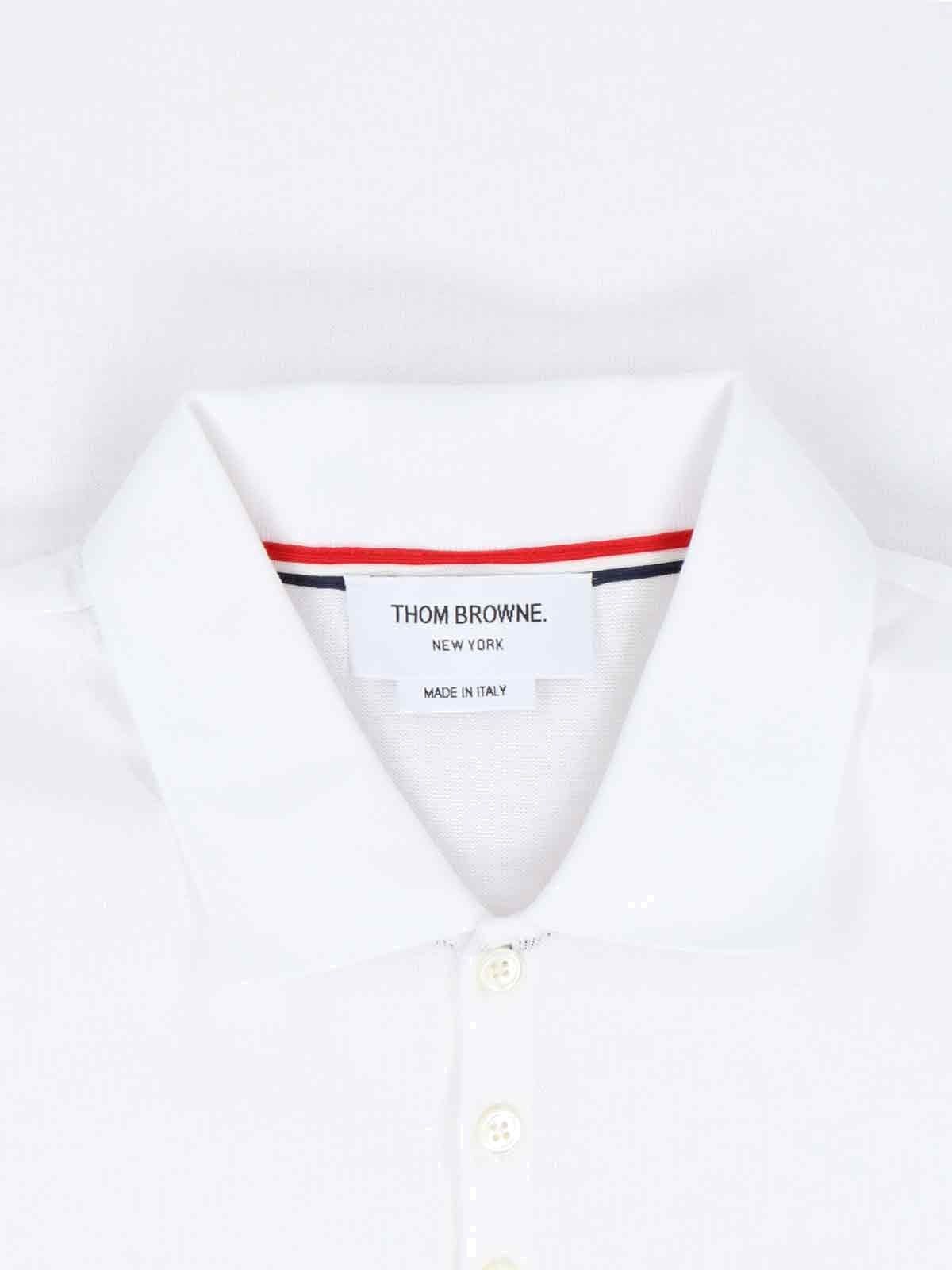 Poloshirt mit dreifarbigem Detail von Thom Browne, aus weißer Wolle, klassischer Kragen, Knöpfe vorne, kurze Ärmel, dreifarbige Details, weißes Logo-Etikett vorne, dreifarbiges Ripsband hinten, geknöpfte Seitenschlitze, gerader Saum.