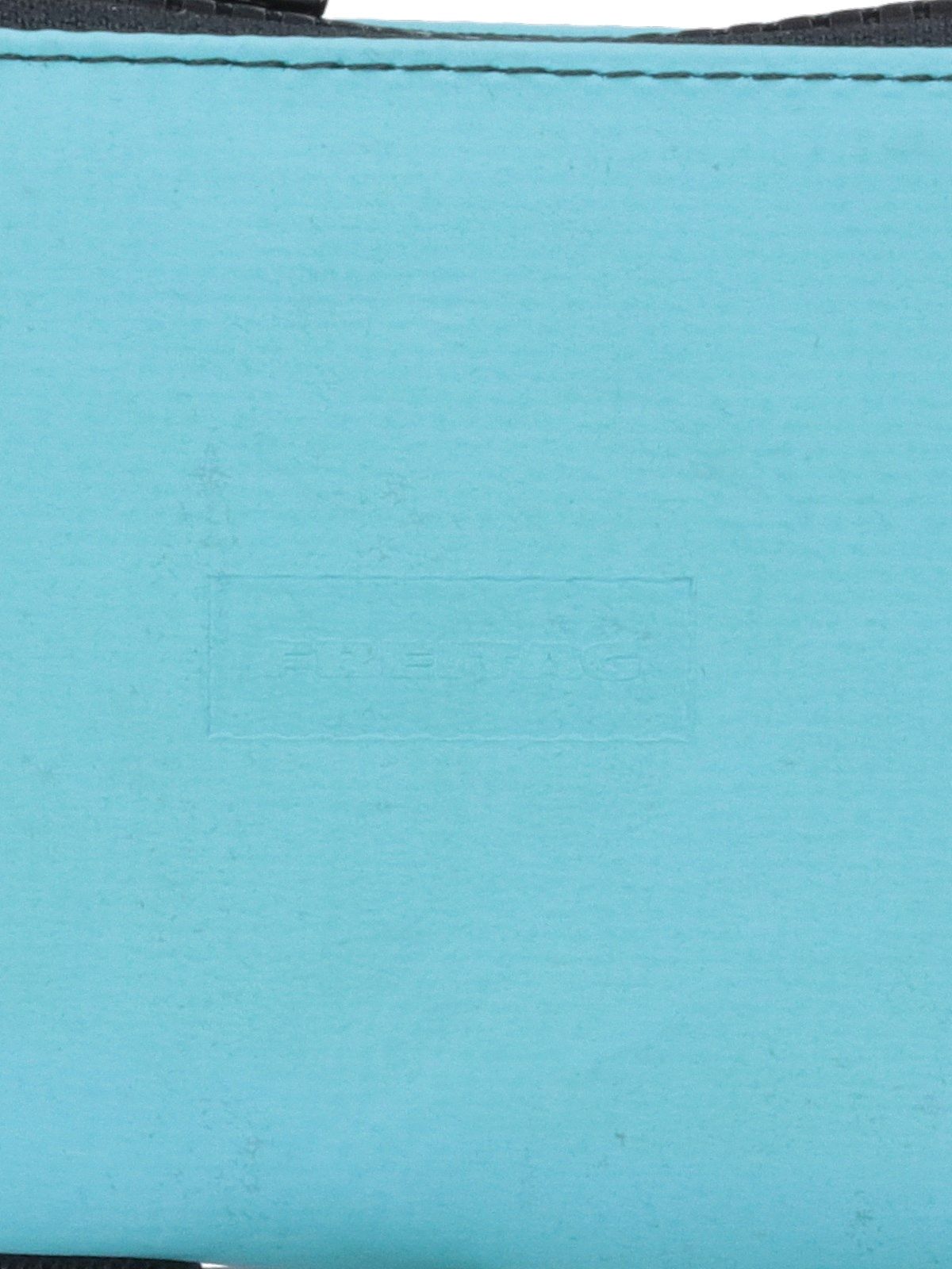 Portafoglio medio zip "Parker" - realizzato con il 78% di materiali riciclati - in pvc azzurro, dettagli neri e grigi, chiusura zip, un laccio, uno slot carte retro, una tasca piatta interna, uno scomparto interno principale.