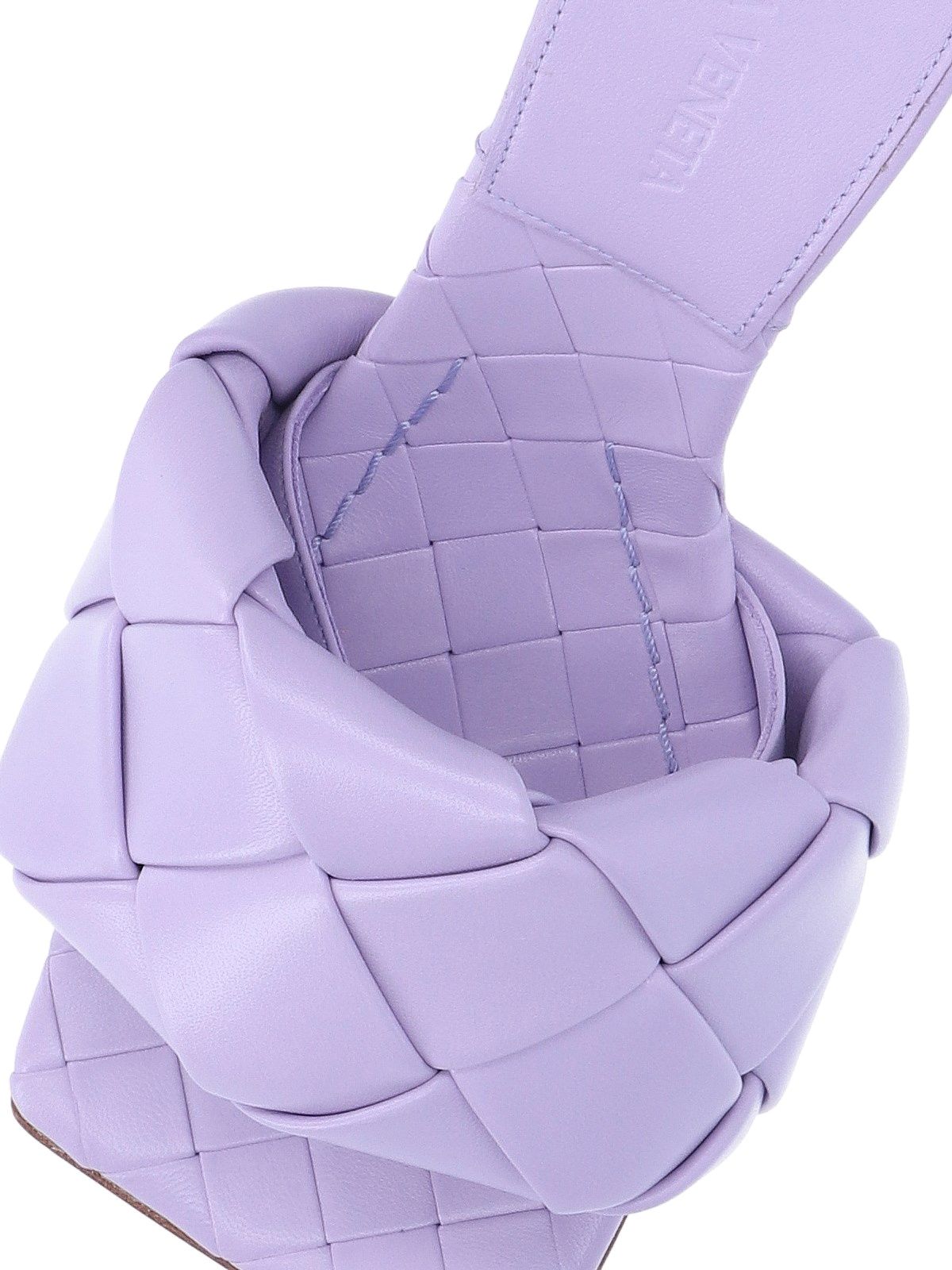 Sandali "Lido" Bottega Veneta, design iconico maxi intreccio, soletta intrecciata, punta squadrata, tacco stiletto.