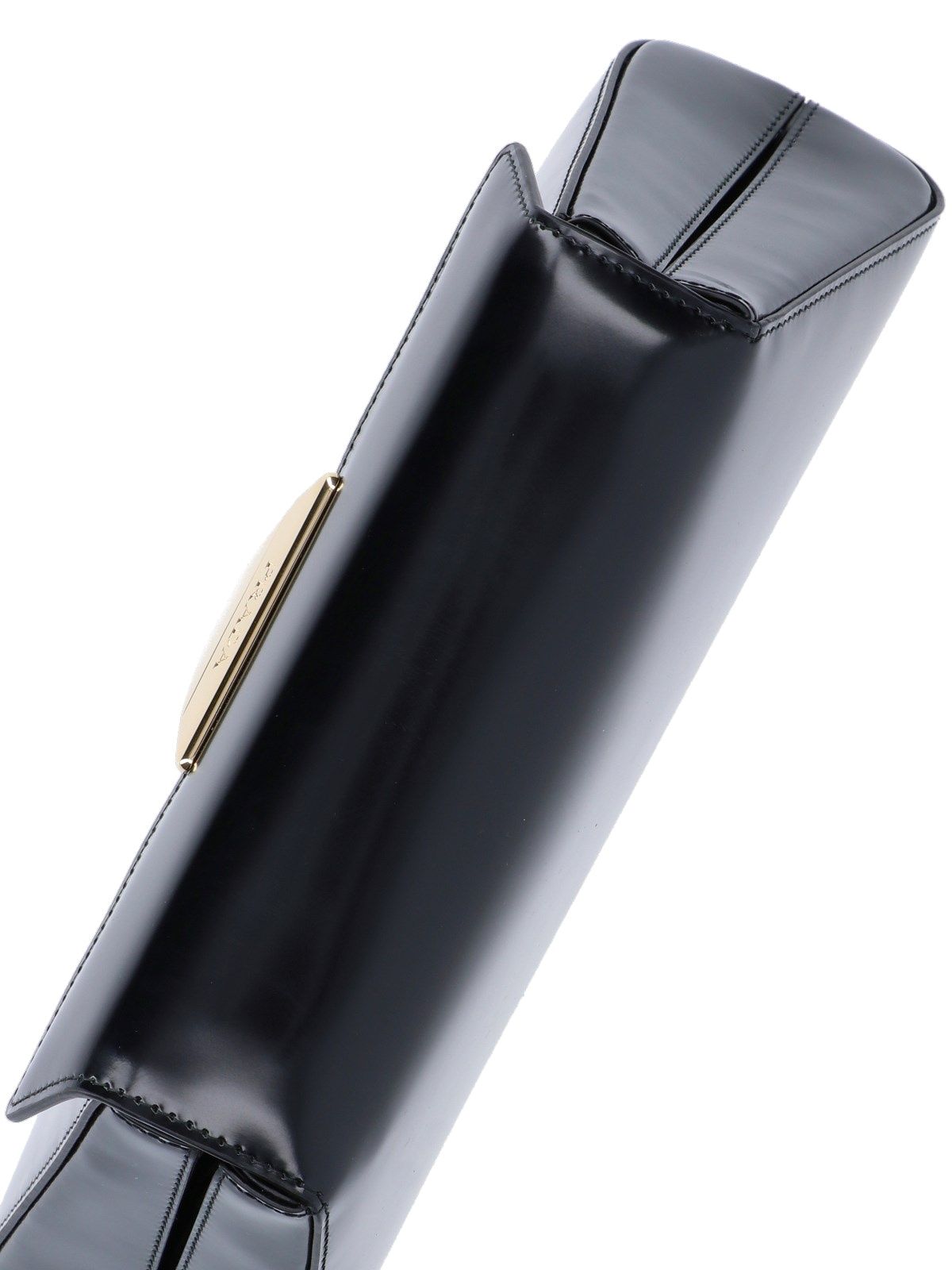 Borsa a mano media Prada, in pelle nera, un manico in pelle regolabile rimovibile superiore, una tracolla in pelle regolabile rimovibile, chiusura pattina patch logo metallico applicato fronte, dettaglio lettering logo patch metallico, una tasca applicata interna, uno scomparto interno principale.