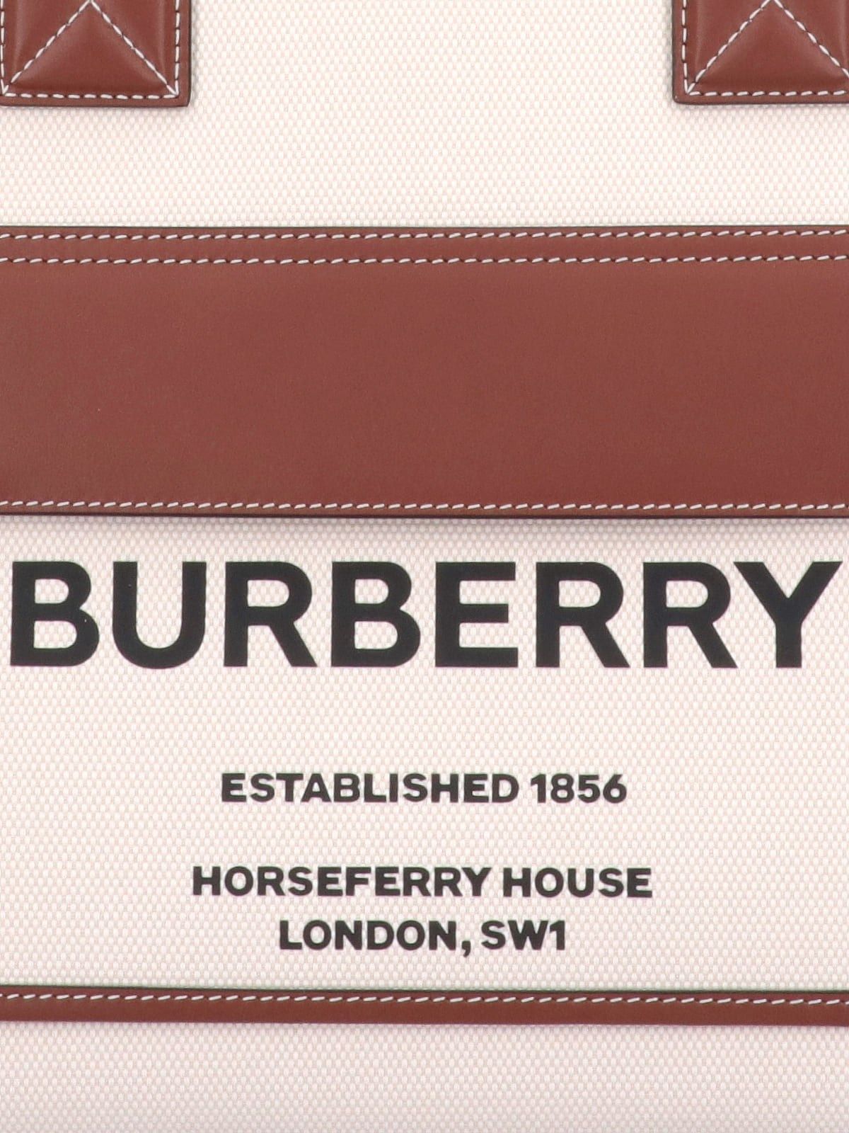 Borsa tote media "Freya" Burberry, in cotone panna, finiture in pelle, due manici, chiusura bottone a pressione, una tasca piatta fronte, dettaglio stampa logo a contrasto, una tasca piatta interna, una tasca zip interna, uno scomparto interno principale.