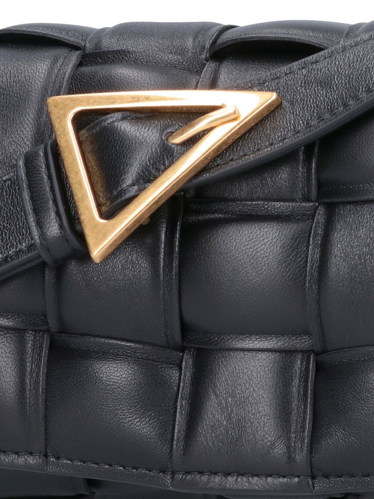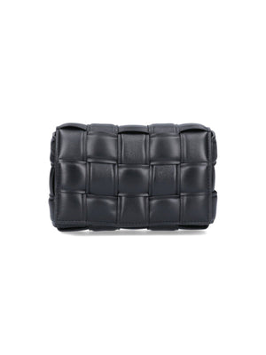 Borsa Piccola "Padded Cassette" Bottega Veneta, in pelle nera, motivo iconico intrecciato, tracolla regolabile dettaglio fibbia triangolo color oro, chiusura bottoni magnetici, una tasca zip interna, uno scomparto interno principale.