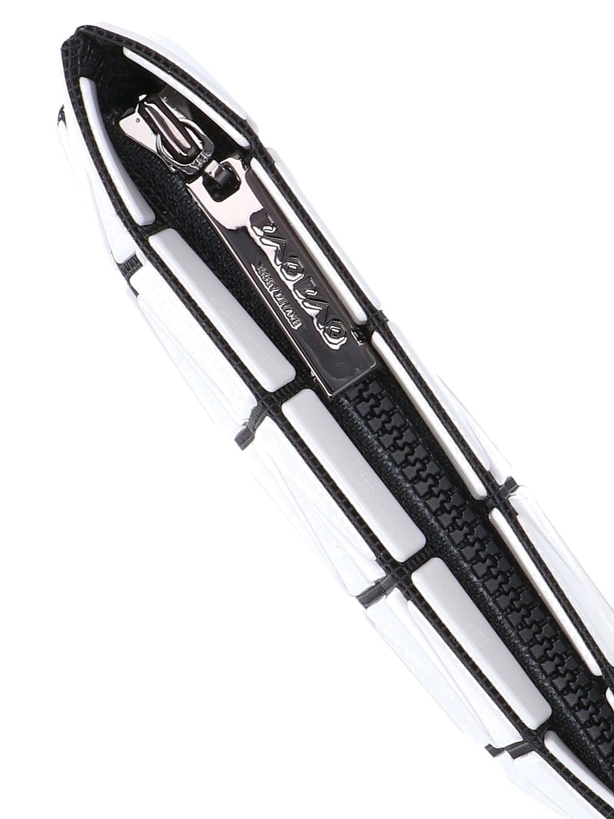 Pouch geometrica Bao Bao, pannelli grigi, dettagli neri, chiusura zip, interno foderato, angolo con dettaglio metallico.