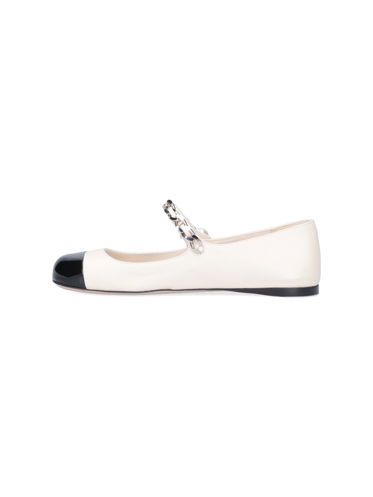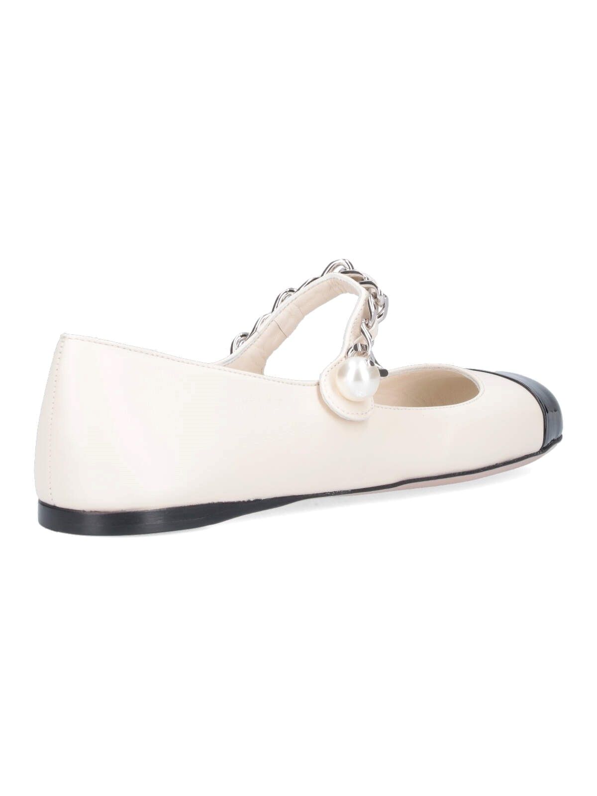 Ballerine in pelle Miu Miu, panna, punta tonda a contrasto, cinturino con dettaglio catena e perla, suola in cuoio.