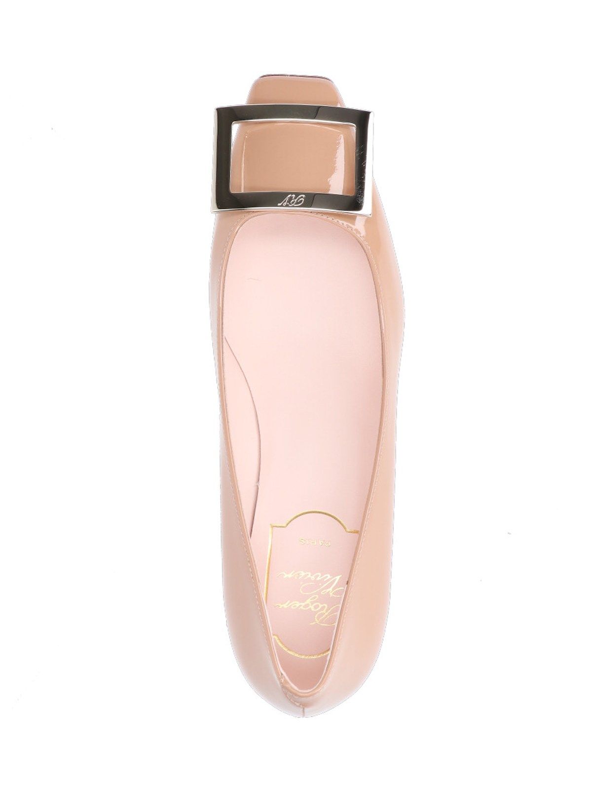 Décolleté "Trompette" Roger Vivier, in vernice rosa, a punta squadrata, fibbia in metallo argentato superiore, dettaglio logo inciso, tacco squadrato, vestibilità slip on, suola in cuoio.