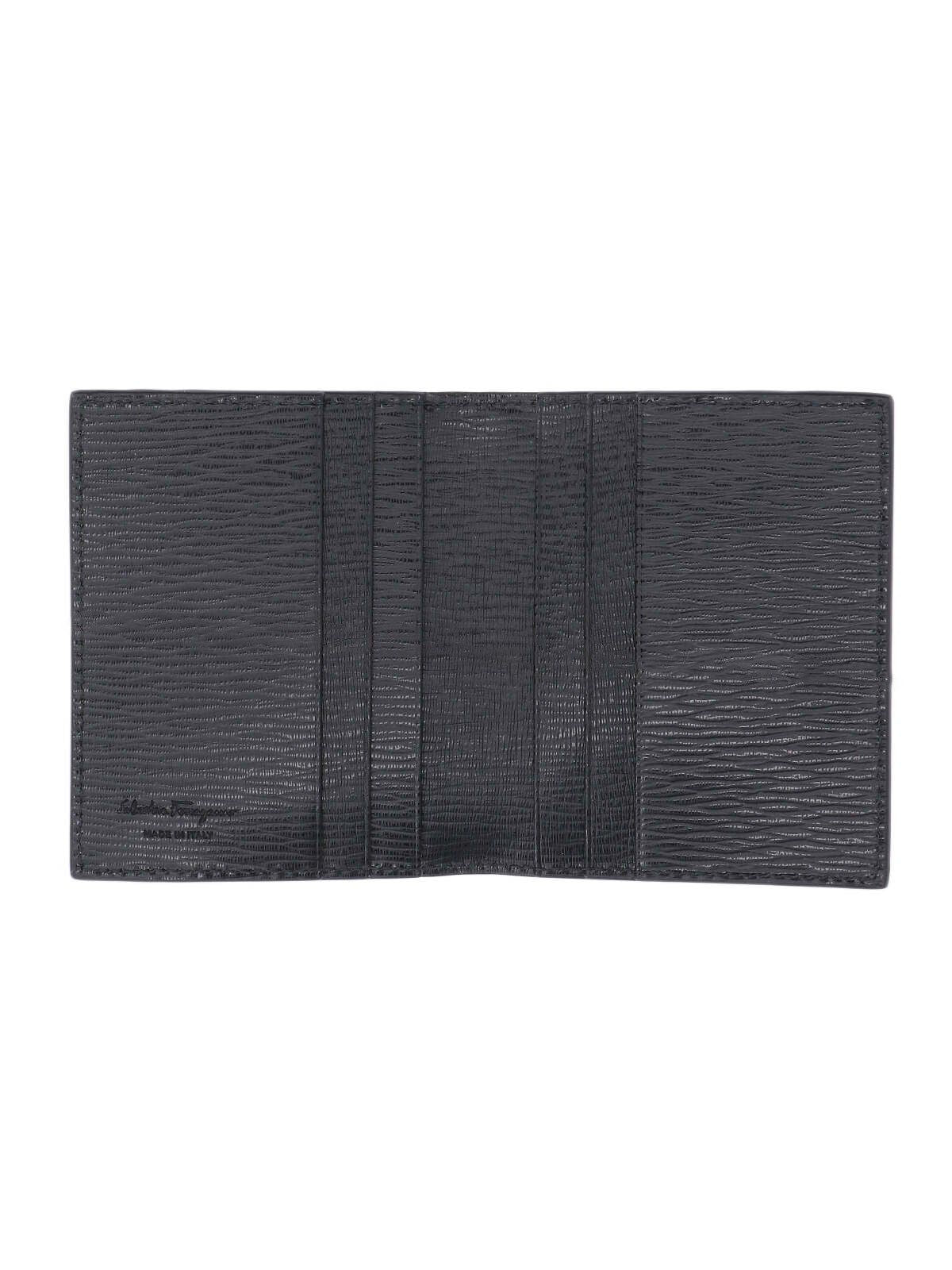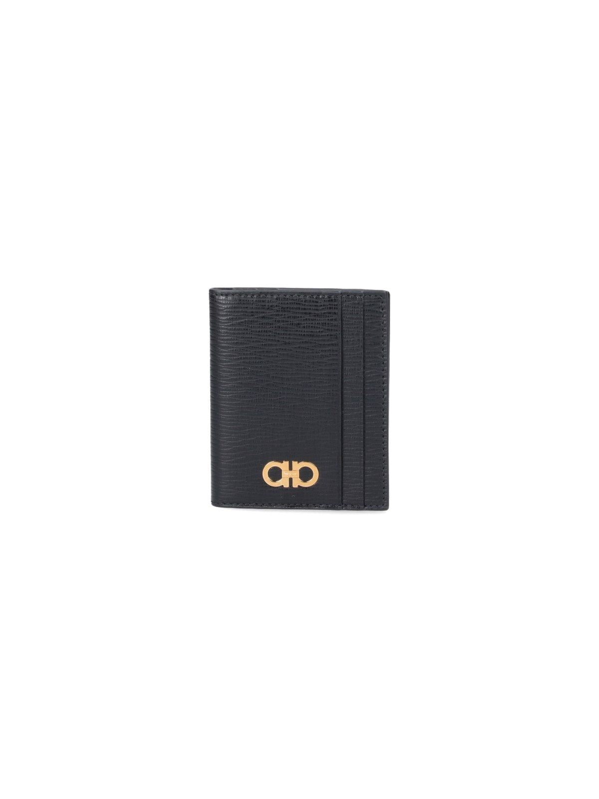 Portafoglio bi-fold "Gancini" Ferragamo, in pelle martellata nera, dettaglio logo metallico "Gancini" dorato fronte, due slot carte fronte, due slot carte retro, due tasche piatte interno, quattro slot carte interno.