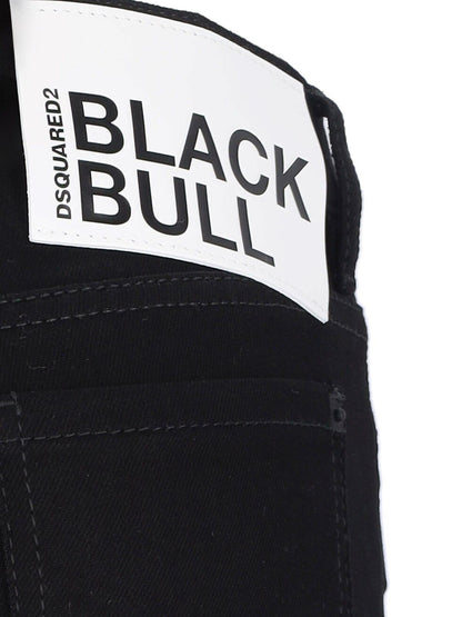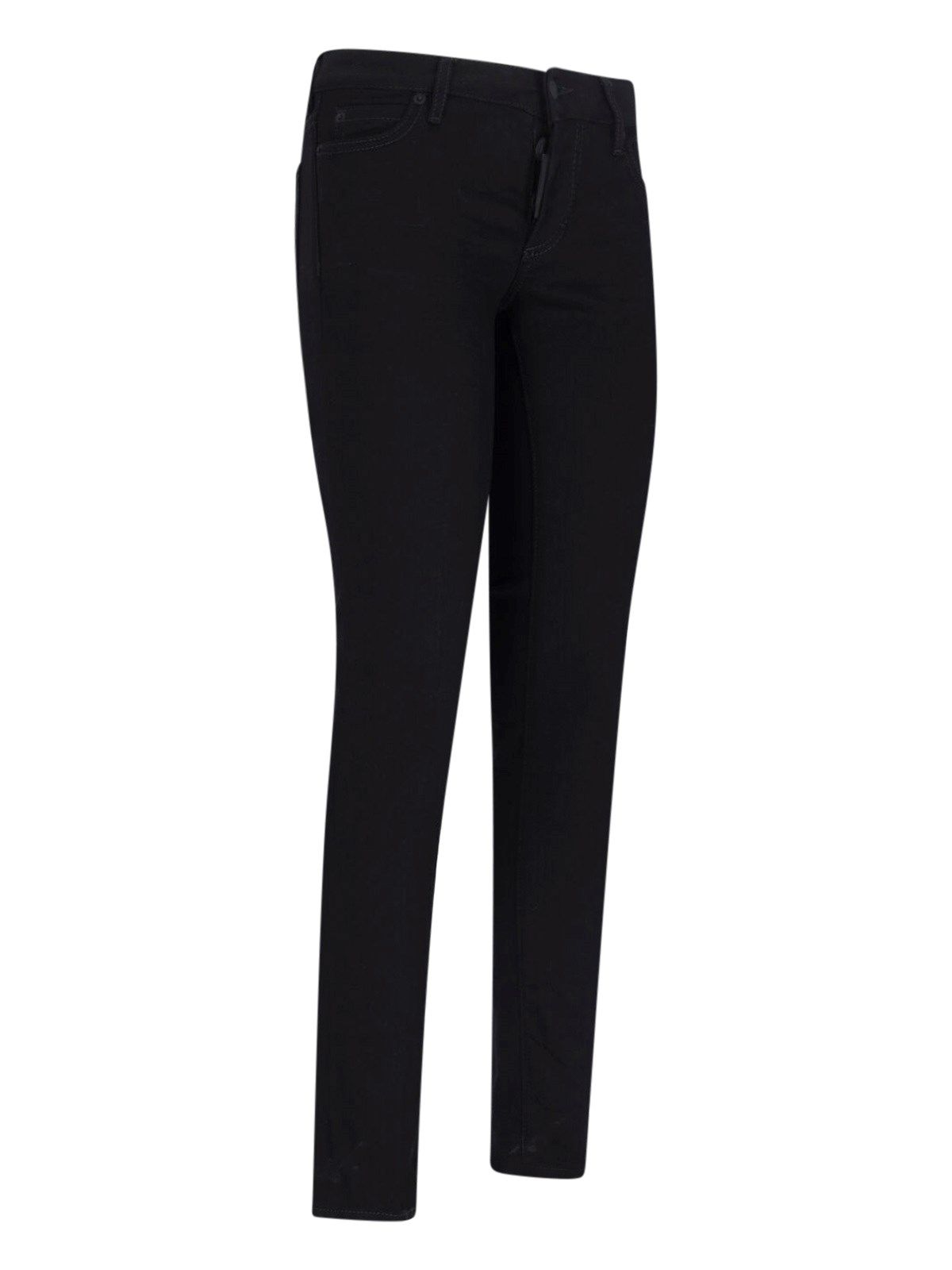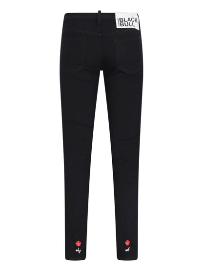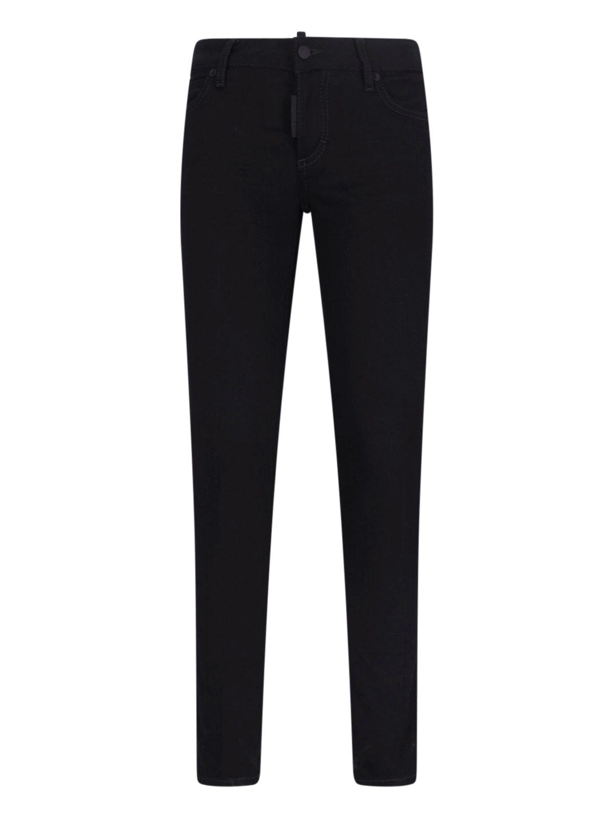 Jeans drittti "Jennifer" DSquared2, in cotone nero, vita bassa, passanti cintura, chiusura bottone e zip, design cinque tasche, etichetta logo a contrasto resto, dettagli rossi e bianchi su fondo retro, gamba dritta.