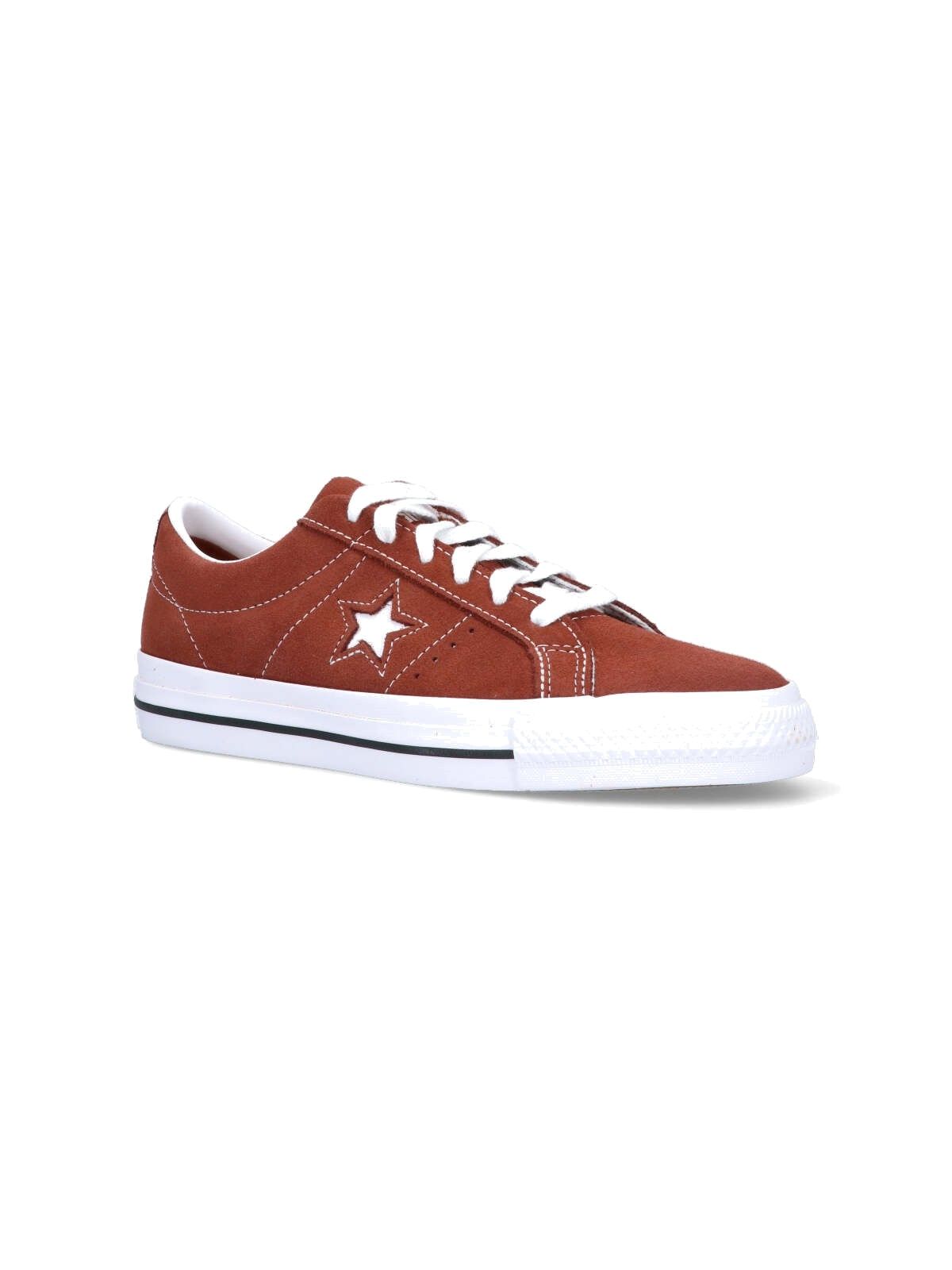 Converse „One Star Pro“-Sneaker aus braunem Wildleder, runde Spitze, Schnürverschluss, weißer Sternaufnäher an der Seite, seitliche Einsatzdetails, schwarzes Liniendetail, Logoaufnäher auf der hinteren Sohle, Gummisohle.