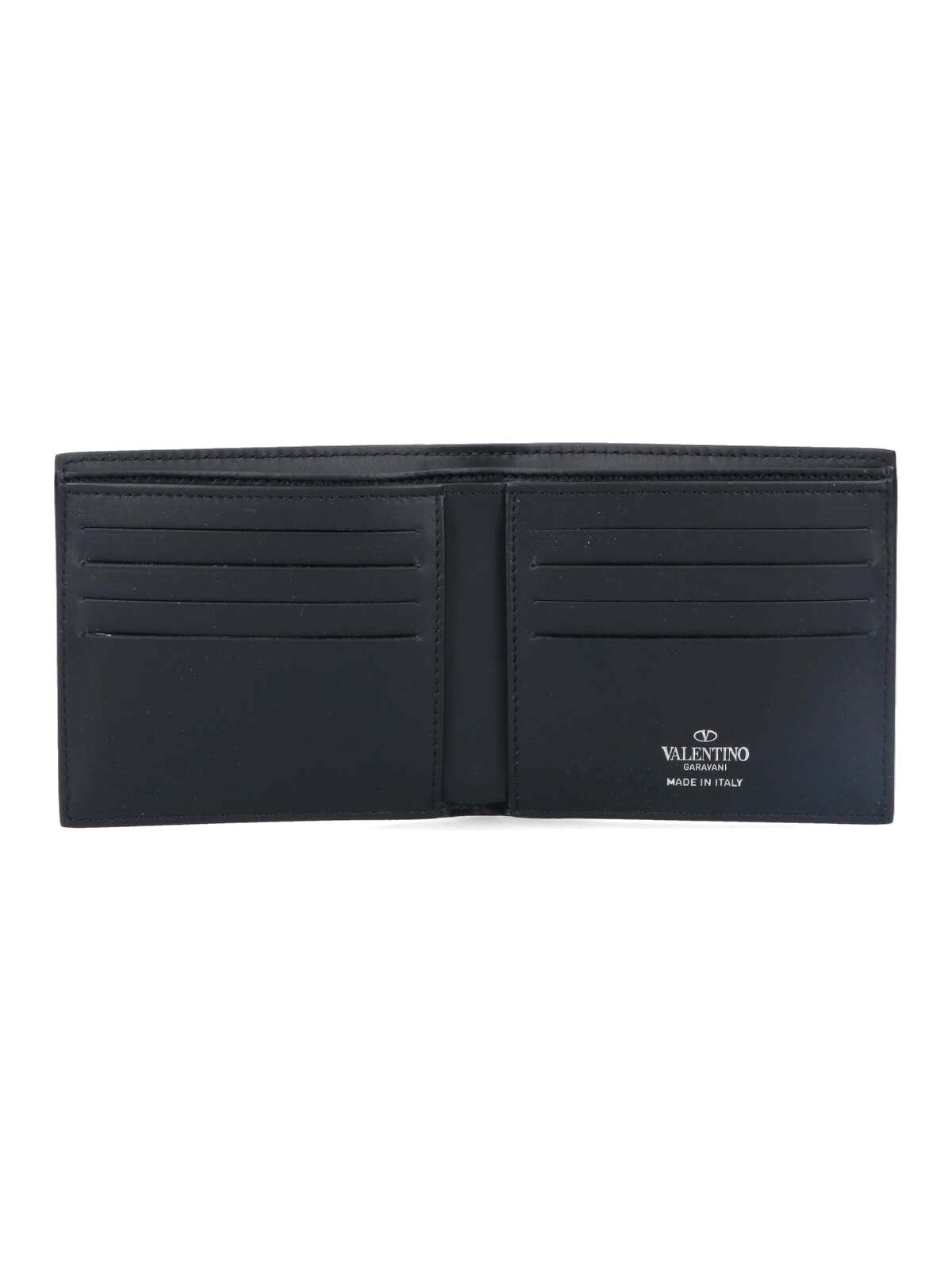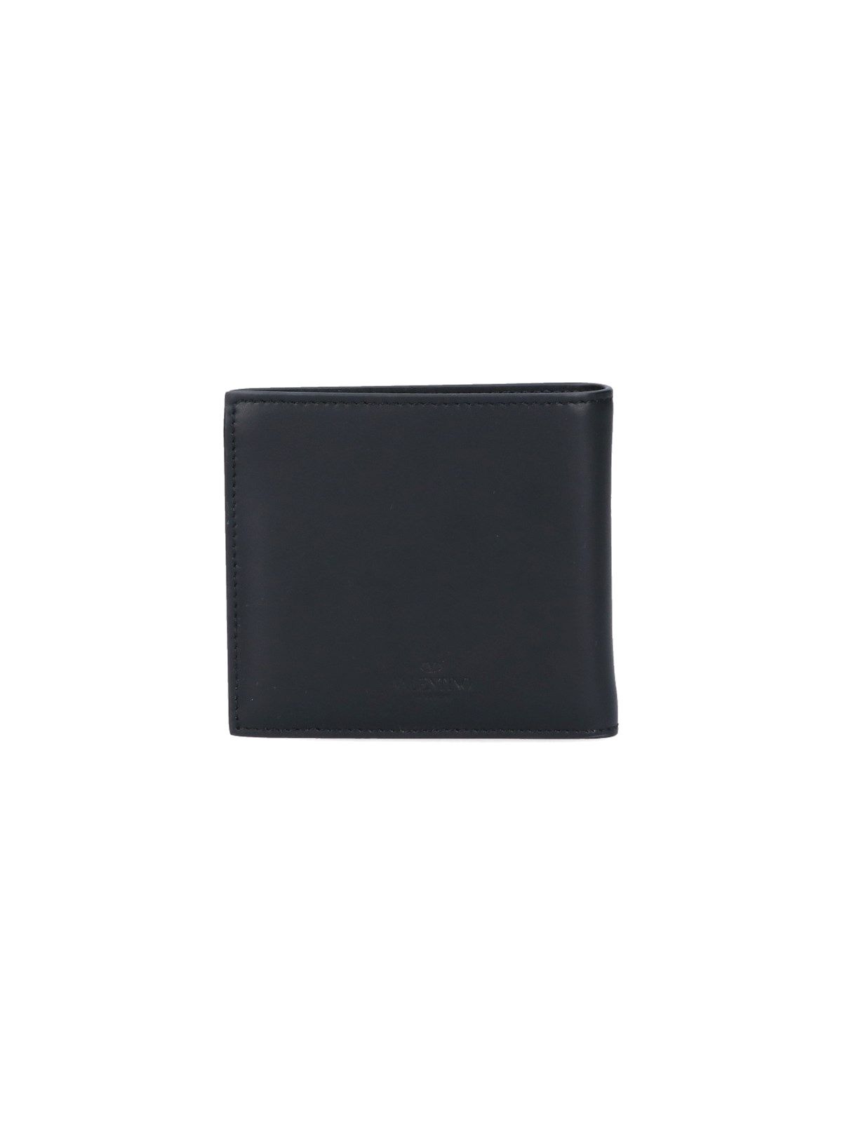 Valentino Garavani „VLTN“-Geldbörse aus schwarzem Leder, Faltverschluss, weißer Logo-Aufdruck auf der Vorderseite, Ton-in-Ton-geprägtes Logo auf der Rückseite, ein interner Banknotenclip aus silbernem Metall, sechs Kartenfächer.