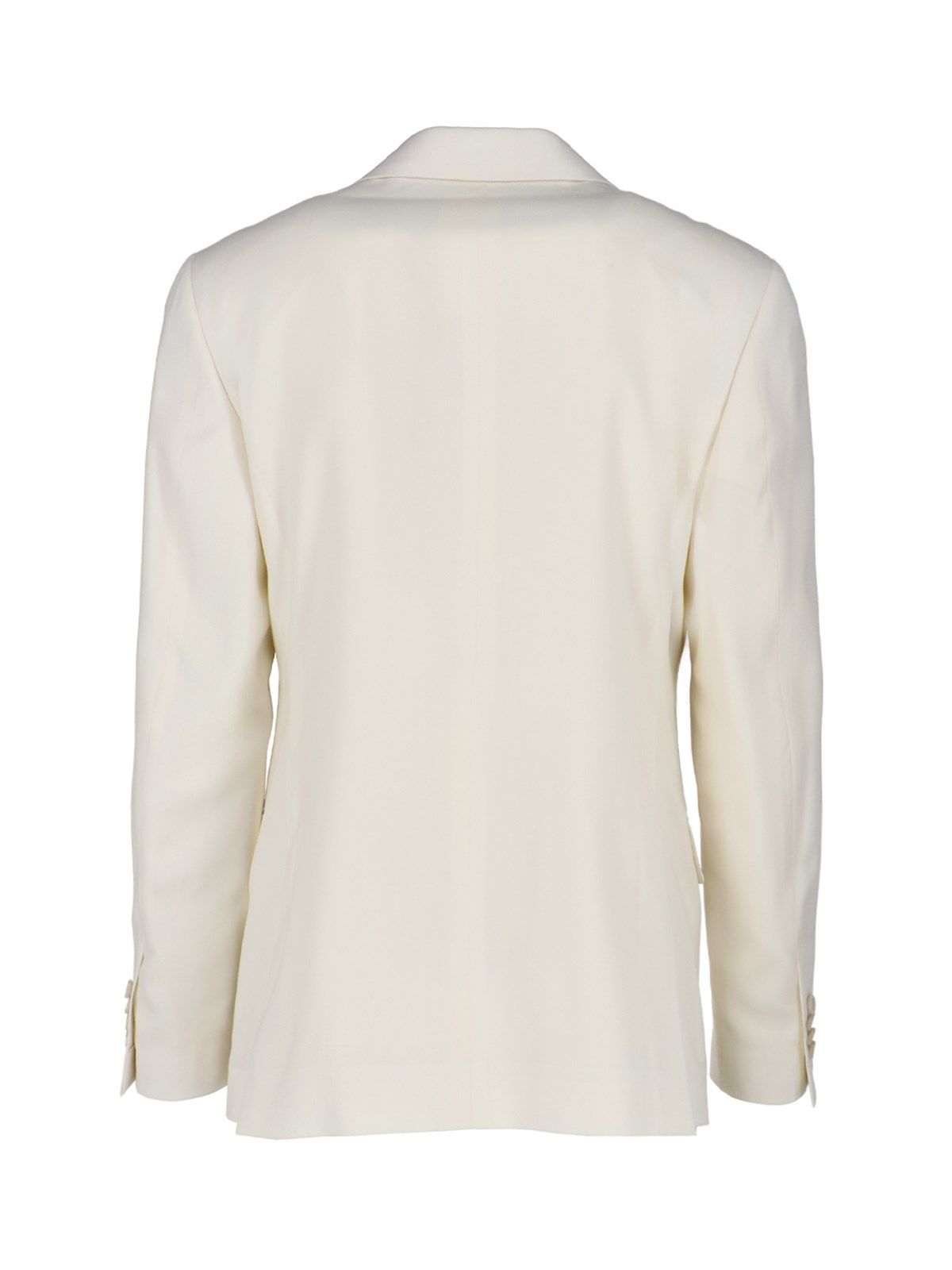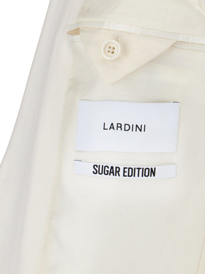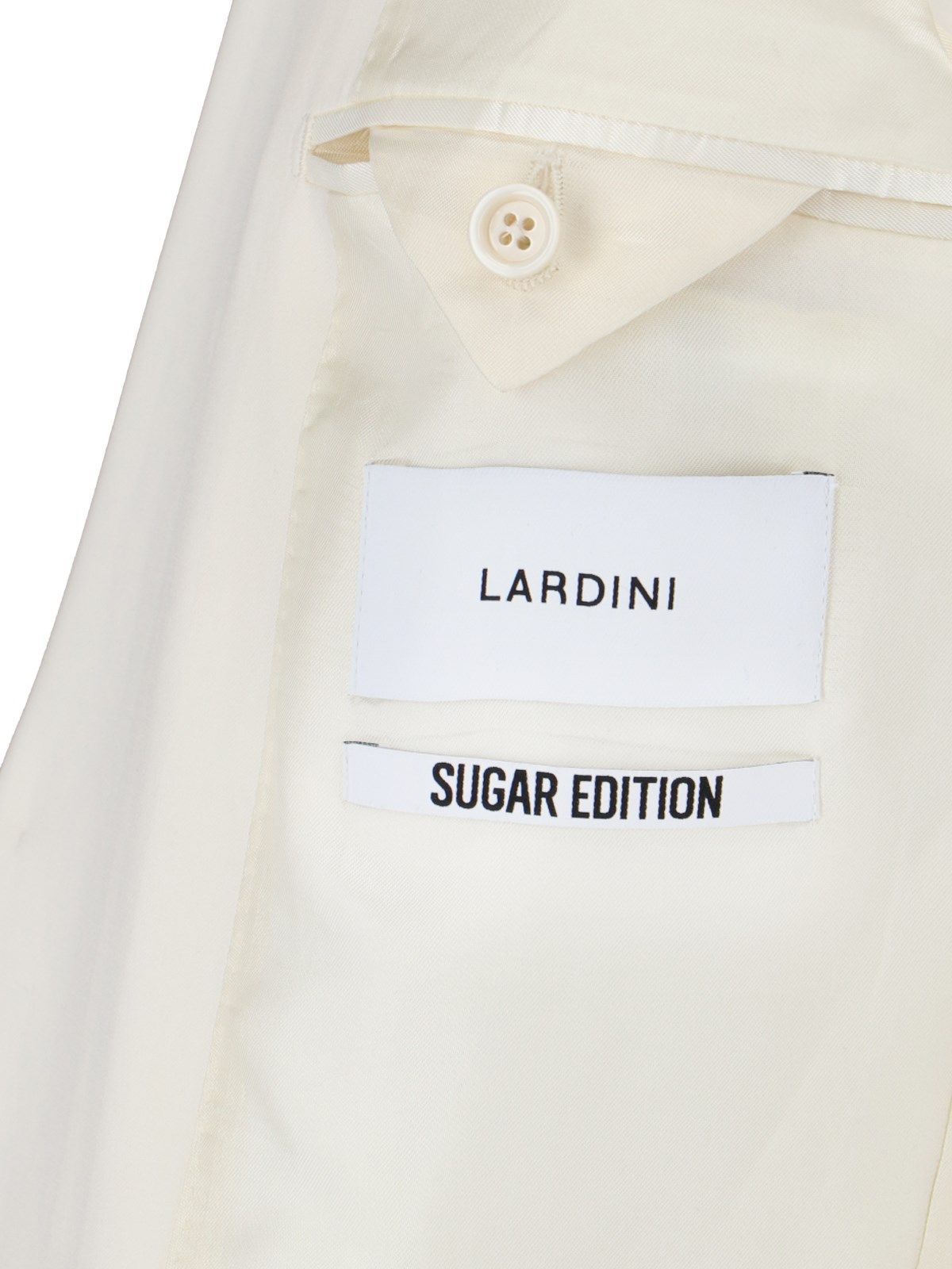 Completo monopetto Lardini, in lana bianca, revers a lancia, chiusura bottoni, un taschino petto, due tasche fronte, bottoni polsini, orlo dritto. Pantaloni dritti, vita media, passanti cintura, chiusura bottoni e zip, due tasche fronte, due tasche retro.