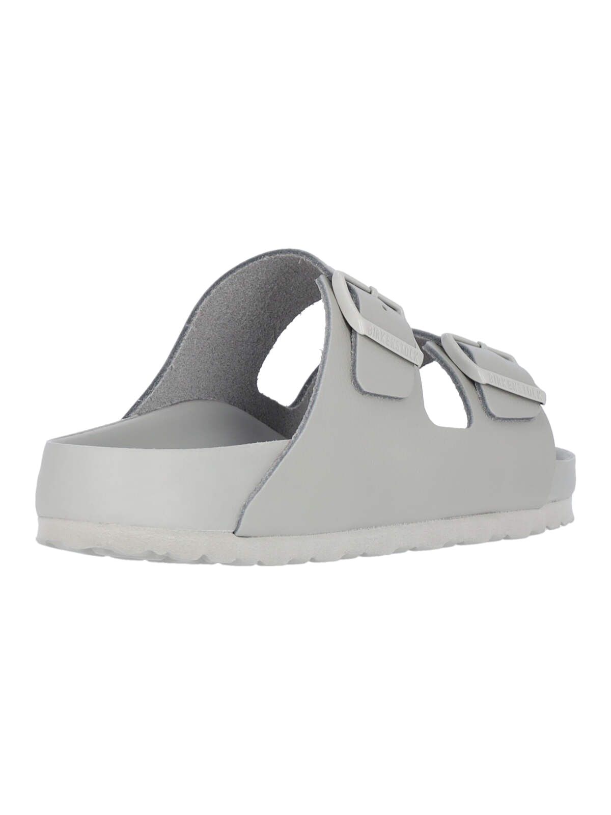 Sandali "Arizona" Birkenstock, in pelle grigia, tonalità minerale, punta tonda, cinturini superiori regolabili, dettaglio fibbia in metallo argentato con logo inciso, vestibilità slip-on, plantare anatomico in sughero e lattice, suola in E.V.A. tono su tono.