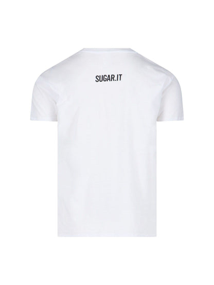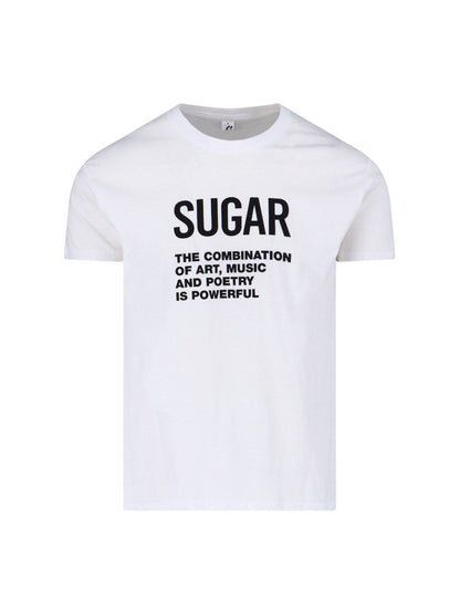T-shirt "#ARTMUSICANDPOETRY" Sugar, in cotone bianco, girocollo, maniche corte, stampa logo a contrasto fronte dettaglio lettering THE COMBINATION OF ART, MUSIC AND POETRY IS POWERFUL, stampa logo a contrasto retro, orlo dritto