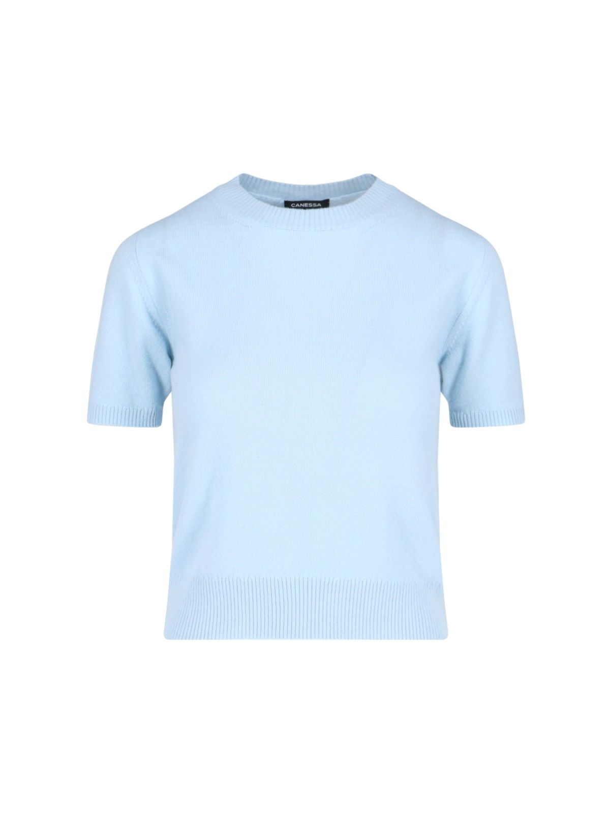 Cardigan con maglia crop bicolor Canessa, Cardigan in cashmere marrone, girocollo, chiusura bottoni, finiture a costine, orlo dritto, maglia in cashmere azzurro, girocollo, maniche corte, finiture a costine, orlo dritto.