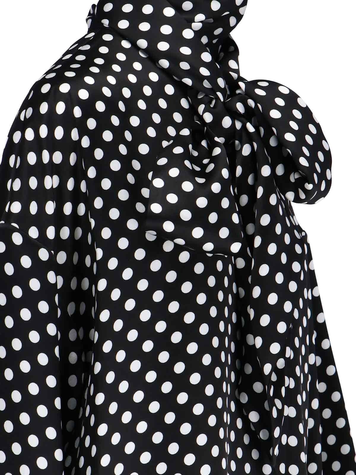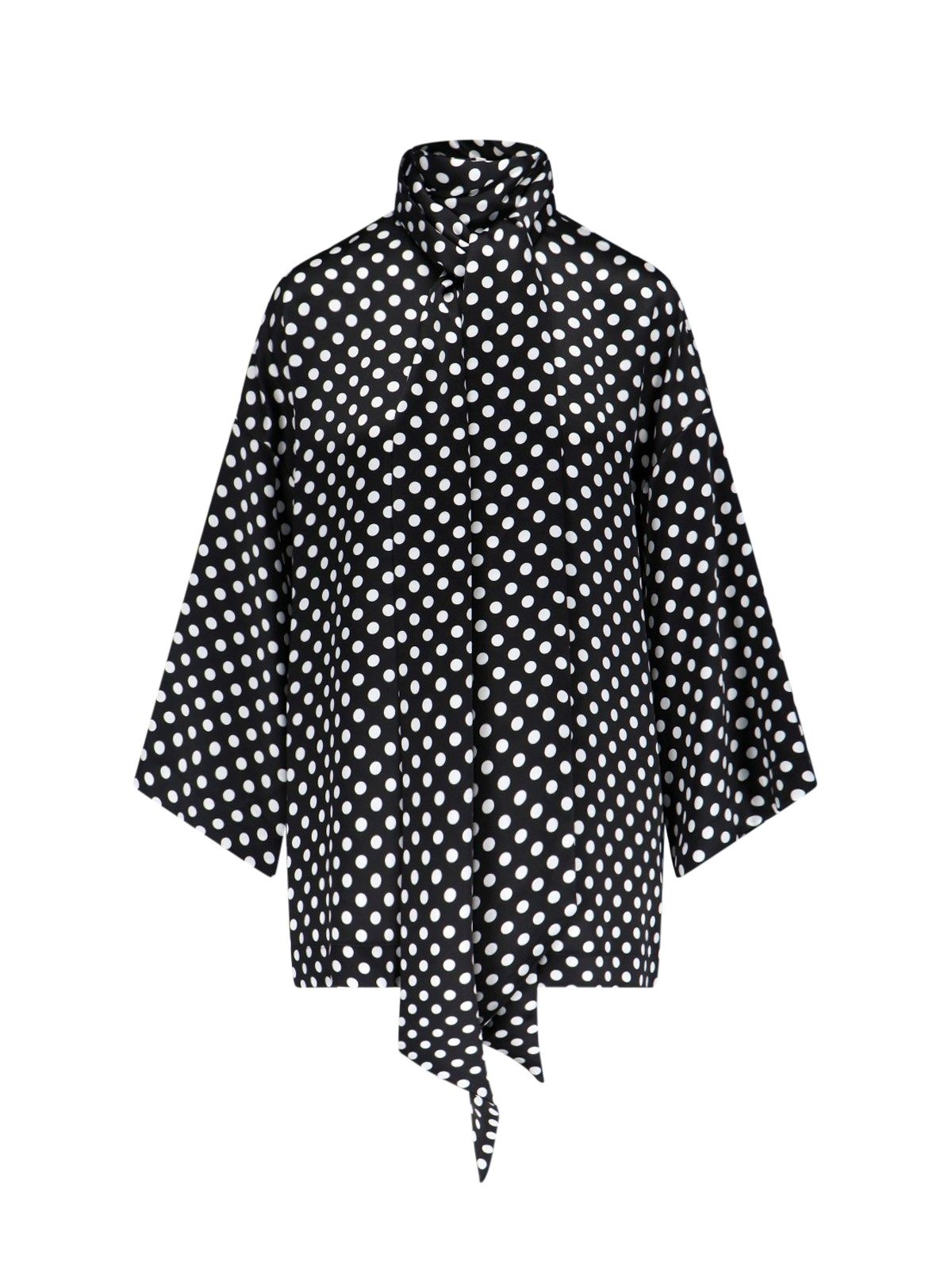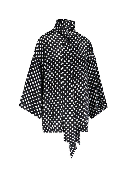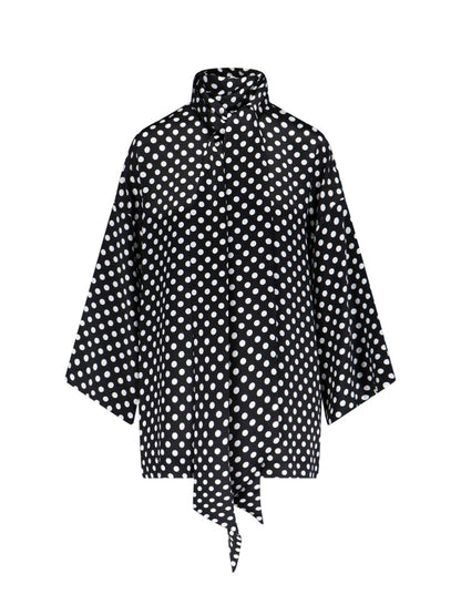 Gepunktetes Saint Laurent-Top aus schwarzem Stoff, weiße Details, Maxi-Schleifenkragen, Dreiviertelärmel, gerader Saum.