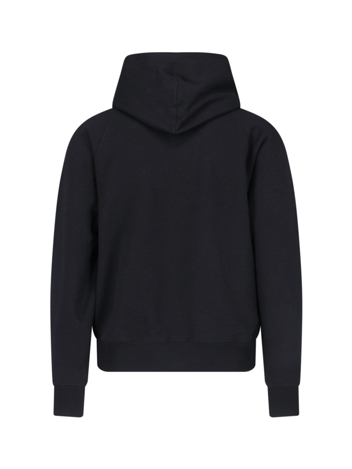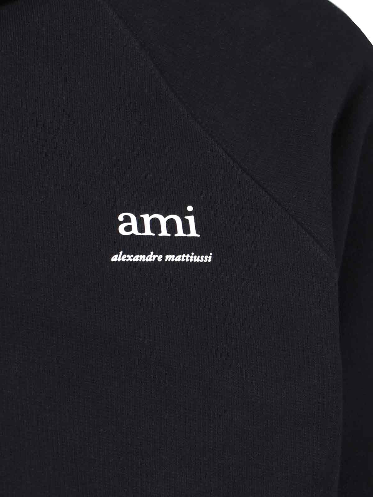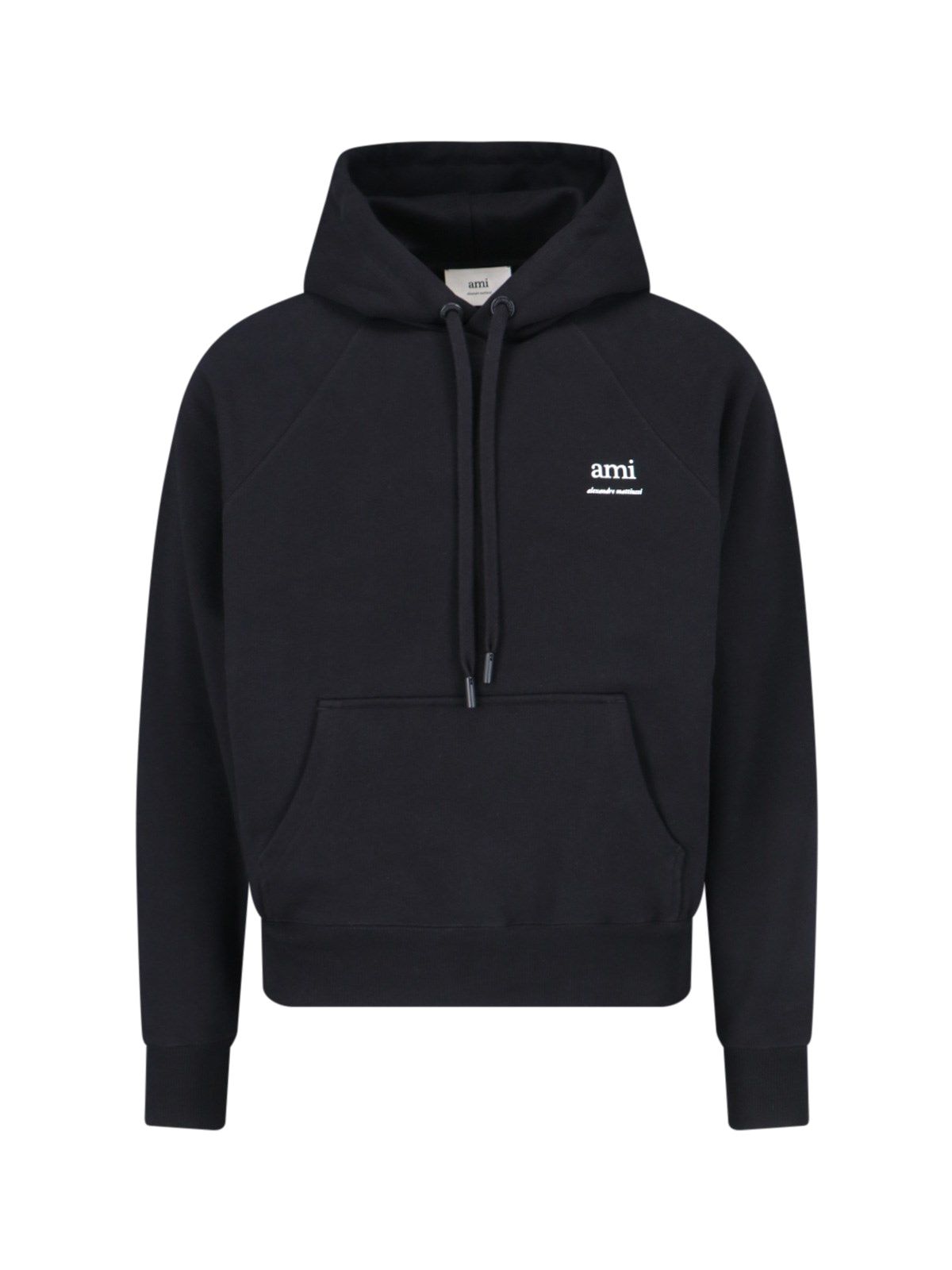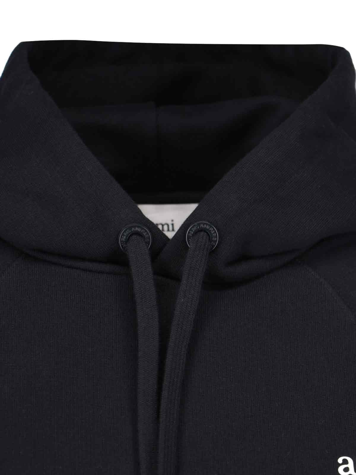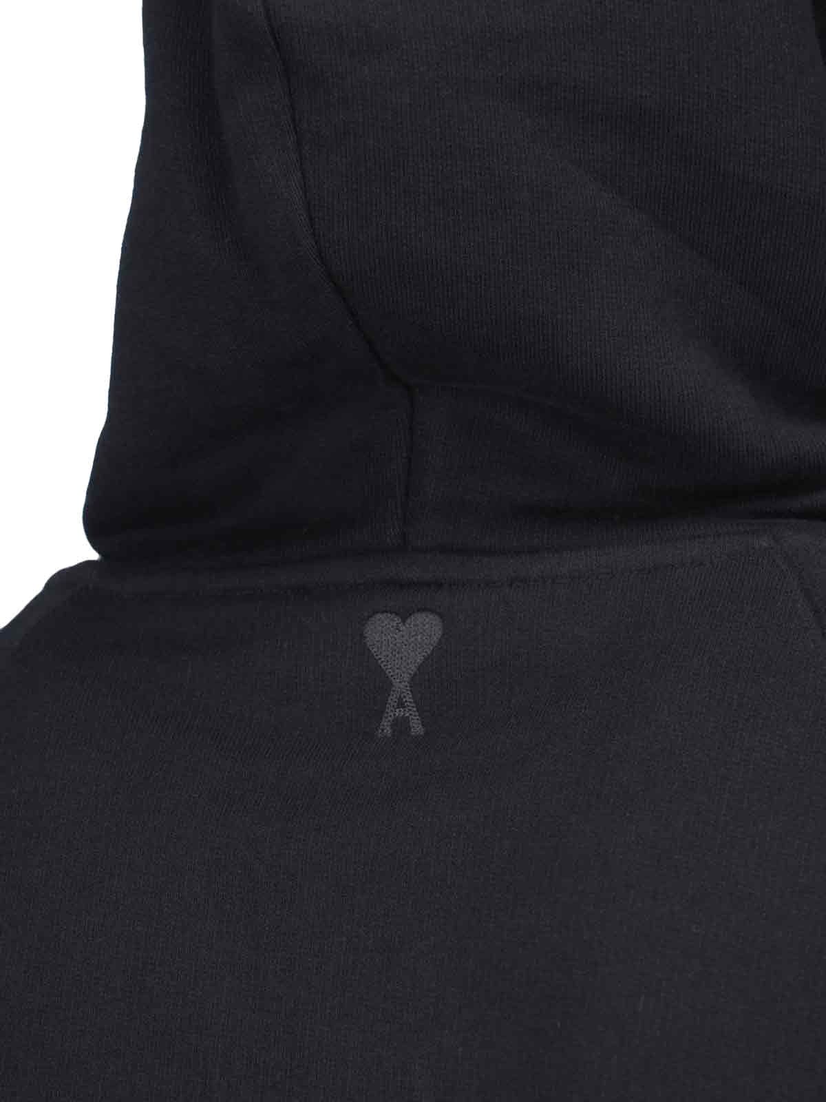 Felpa cappuccio logo Ami, in pile di cotone spazzolato nero, coulisse, stampa logo a contrasto petto, una tasca maxi fronte, ricamo logo tono su tono retro, finiture a costine, orlo dritto, dettaglio vita elasticizzata su fondo.