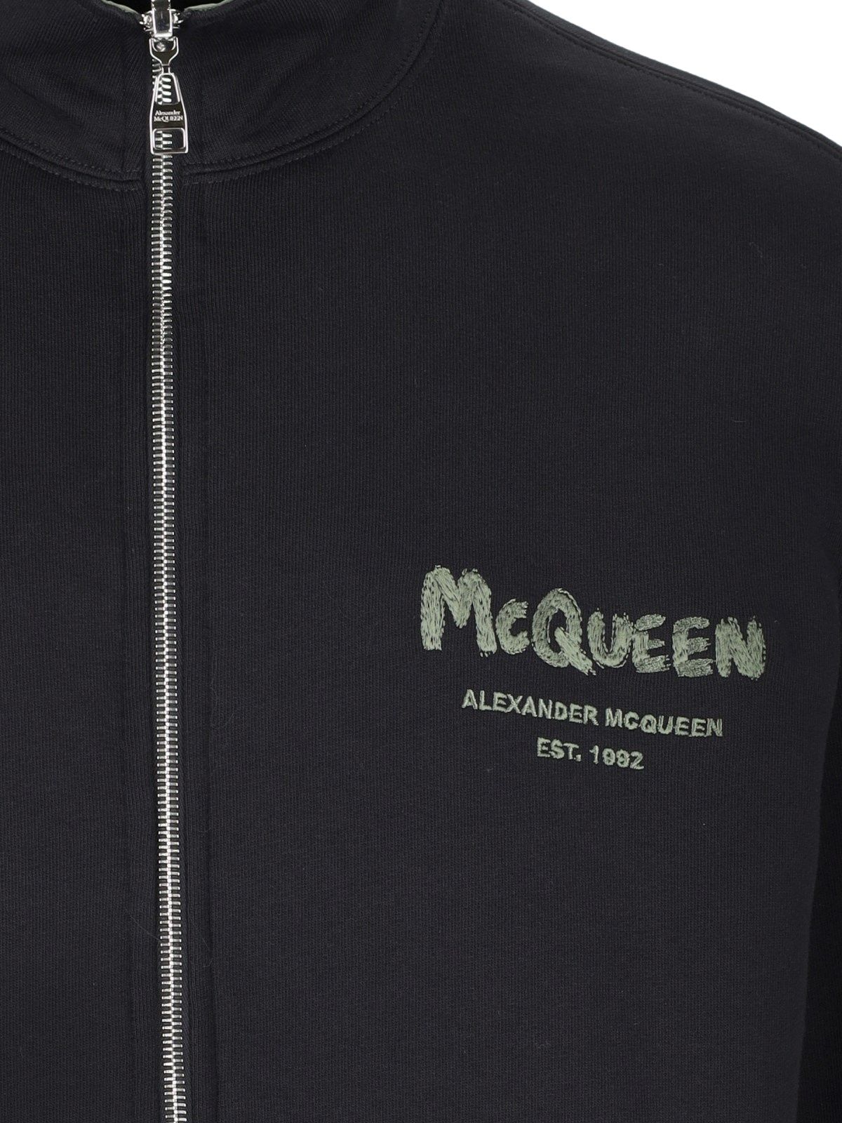 Wendejacke „Graffiti“ von Alexander McQueen aus grünem Nylon, hoher Kragen, eine Brusttasche mit Reißverschluss, zwei Seitentaschen, schwarzer Logo-Aufdruck auf der Rückseite, Wendeseite aus schwarzer Baumwolle, grüne Stickerei auf der Brust, zwei Seitentaschen, elastische Bündchen, Kordelzug der Boden.