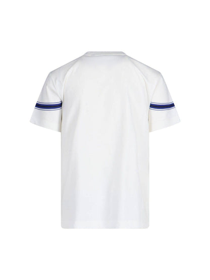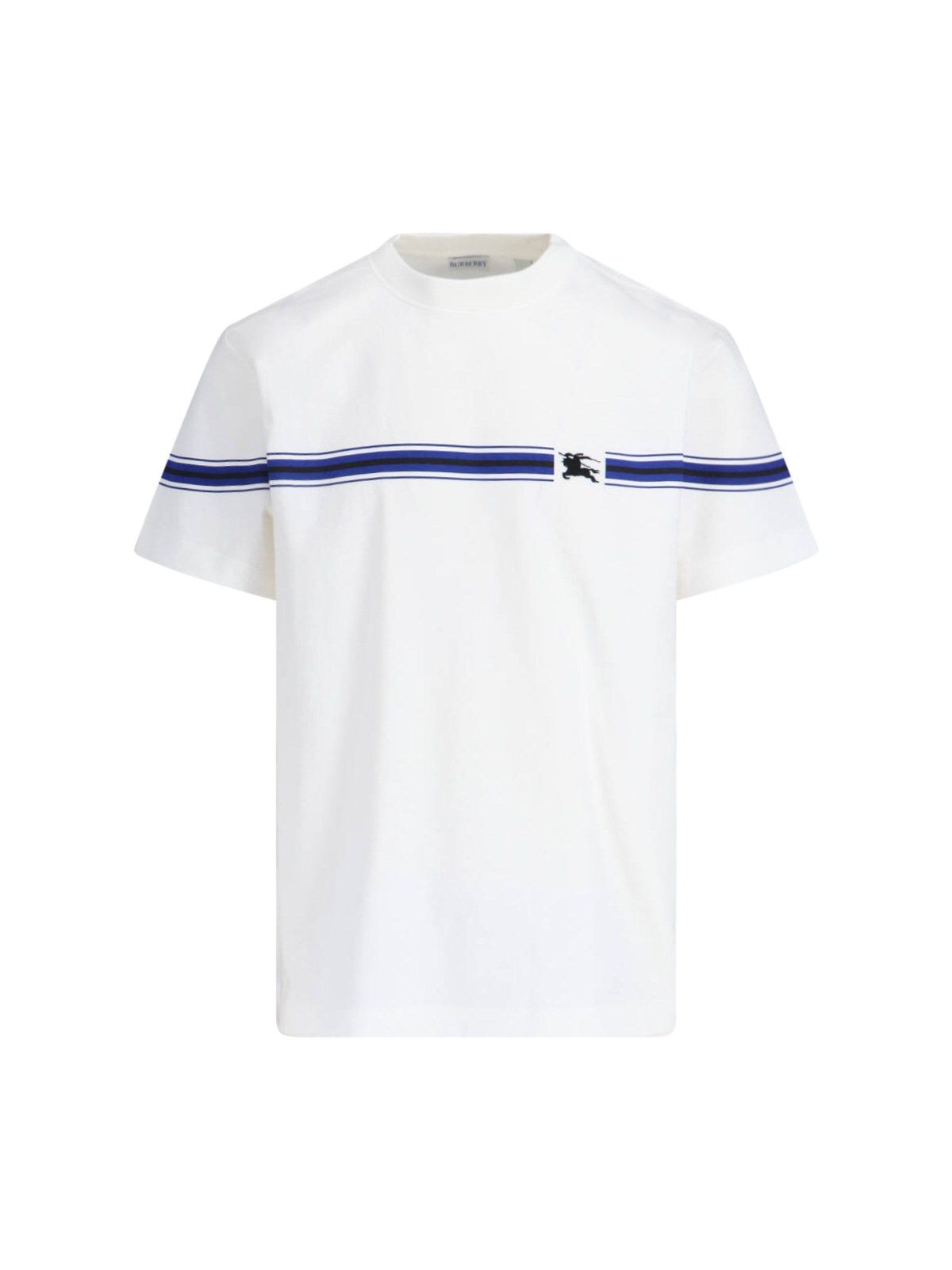 T-shirt "EKD" Burberry, in cotone bianco, girocollo, maniche corte, stampa a righe blu petto, stampa logo a contrasto petto, orlo dritto.
