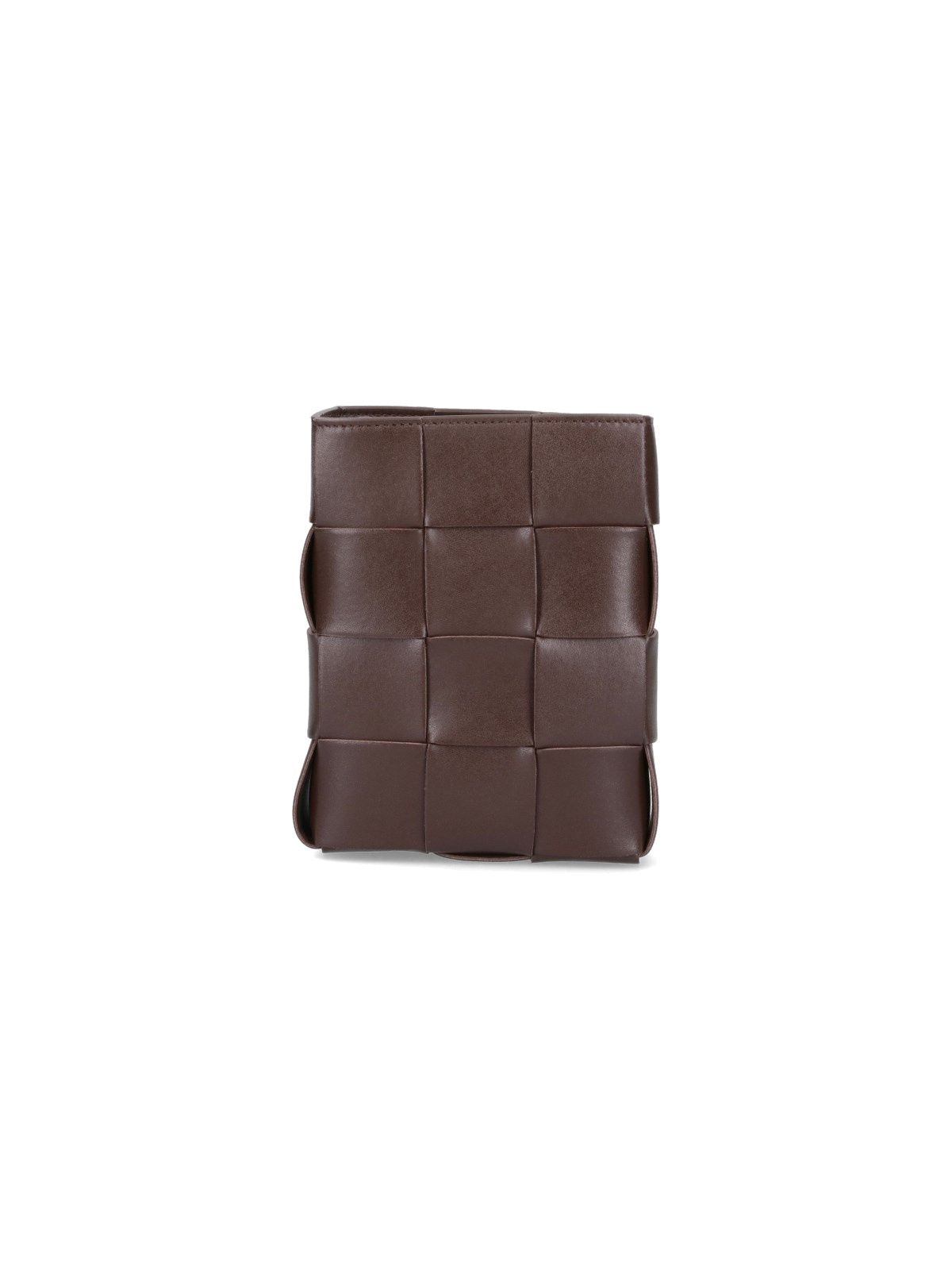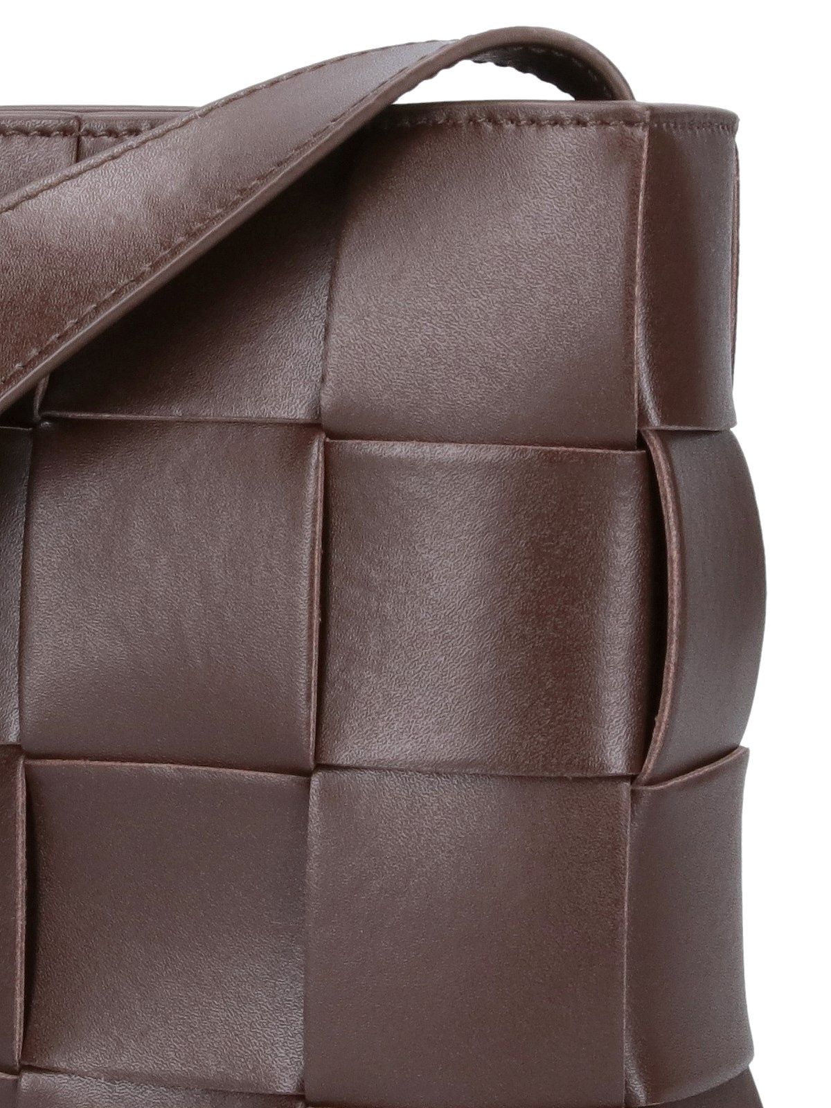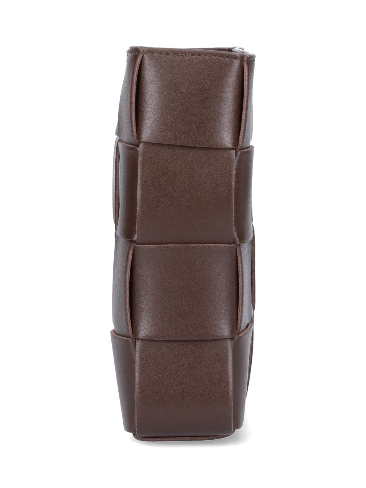 Borsa mini "Cassette" Bottega Veneta, in pelle intrecciata marrone, tracolla regolabile, chiusura magnetica, uno scomparto interno.