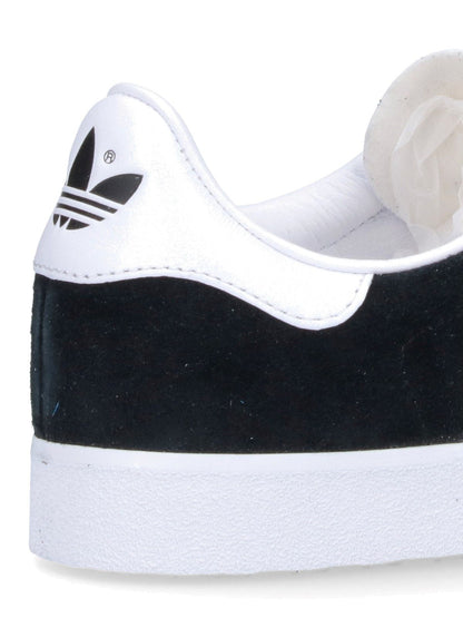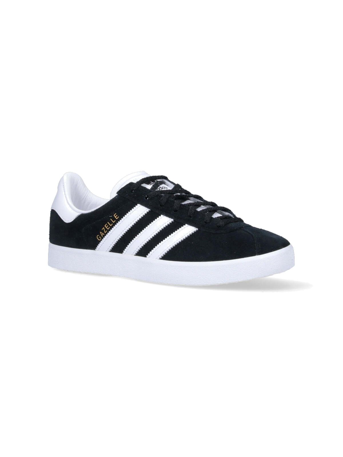 Adidas-Sneaker „Gazelle 85“, aus schwarzem Wildleder, runde Spitze, Schnürverschluss, Logo-Etikett an der Seite, ikonische weiße Lederstreifen an der Seite, goldener Logo-Aufdruck an der Seite, weißes Lederetikett auf der Rückseite, goldenes Logo Druckdetail, Gummisohle.