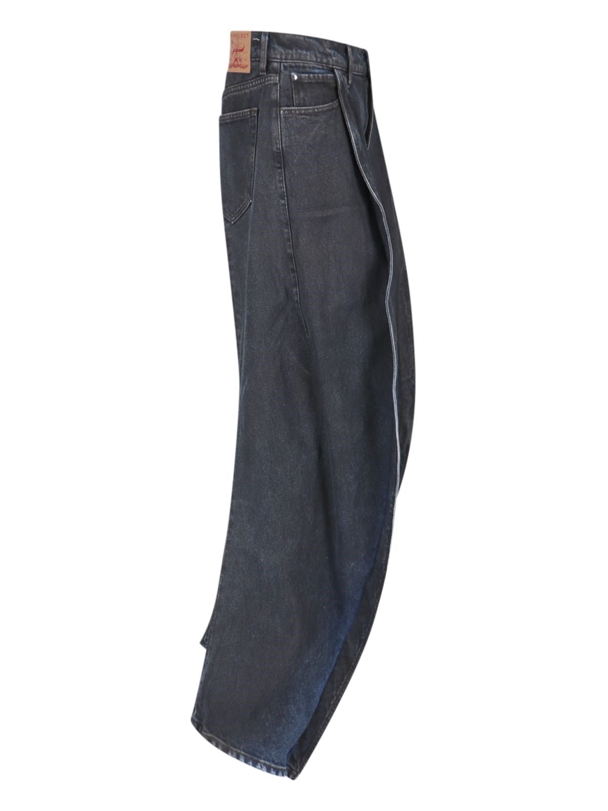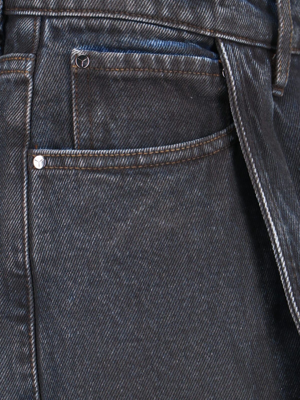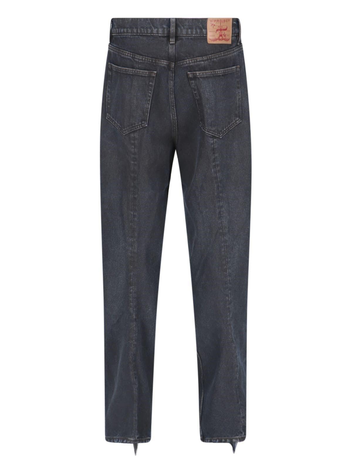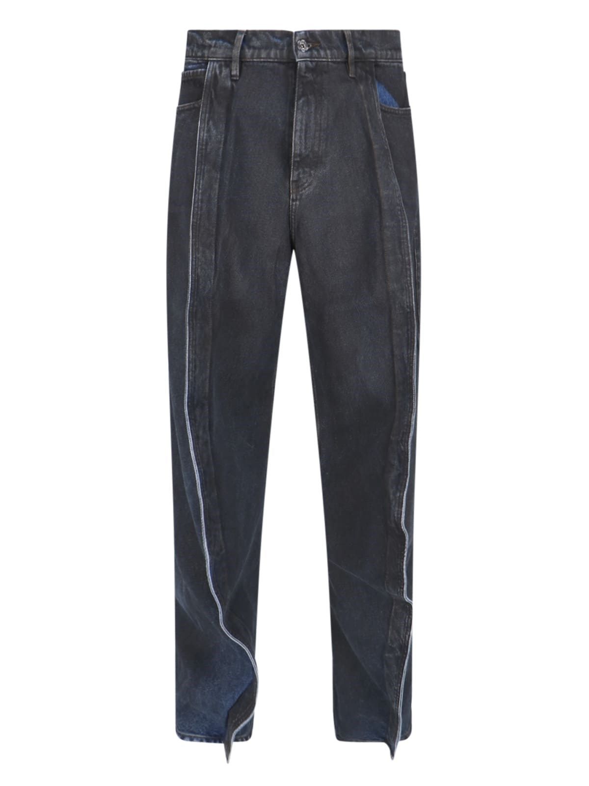 Jeans con pannelli Y Project, in denim nero, dettagli blu, vita media, passanti cintura, chiusura bottone e zip, design cinque tasche, pannelli applicati frontali, patch logo retro, gamba dritta.